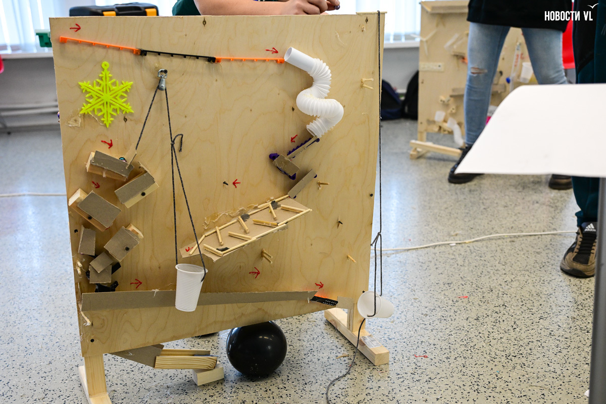 Соревнования по созданию машины Голдберга – устройства, в котором посредством множества шагов выполняется какое-то одно простое действие – продлились всего 2 дня. За это время юным участникам со всего Приморья предстояло создать свои устройства в трёх направлениях: промышленный инжиниринг, разработка в игровой среде и промышленный дизайн.