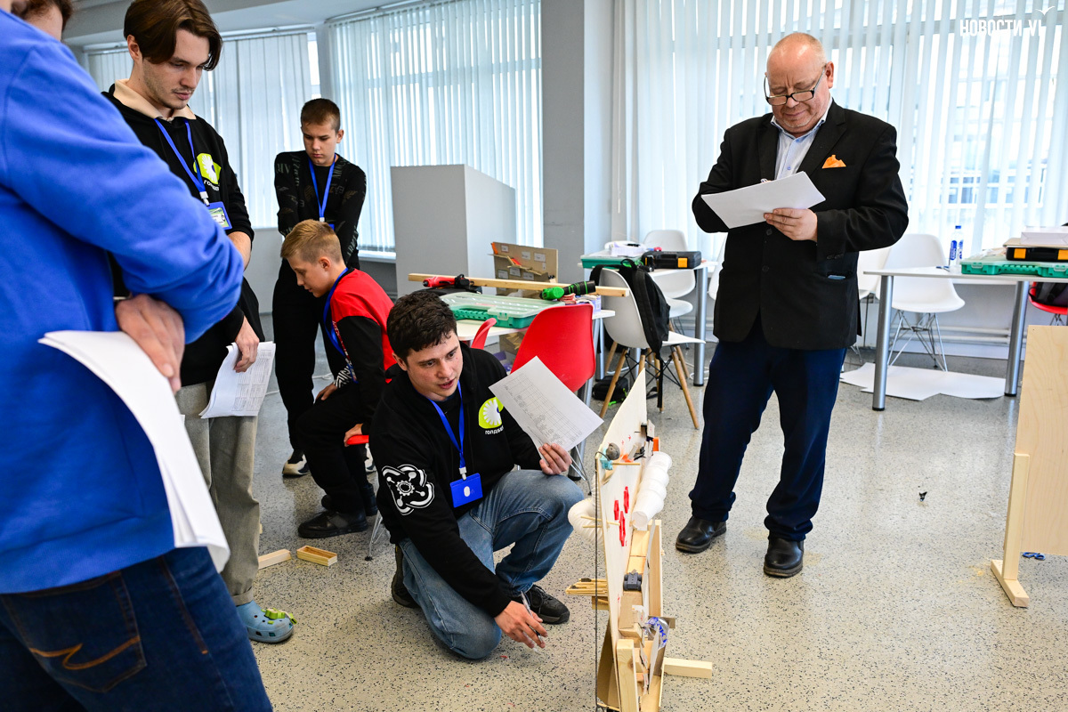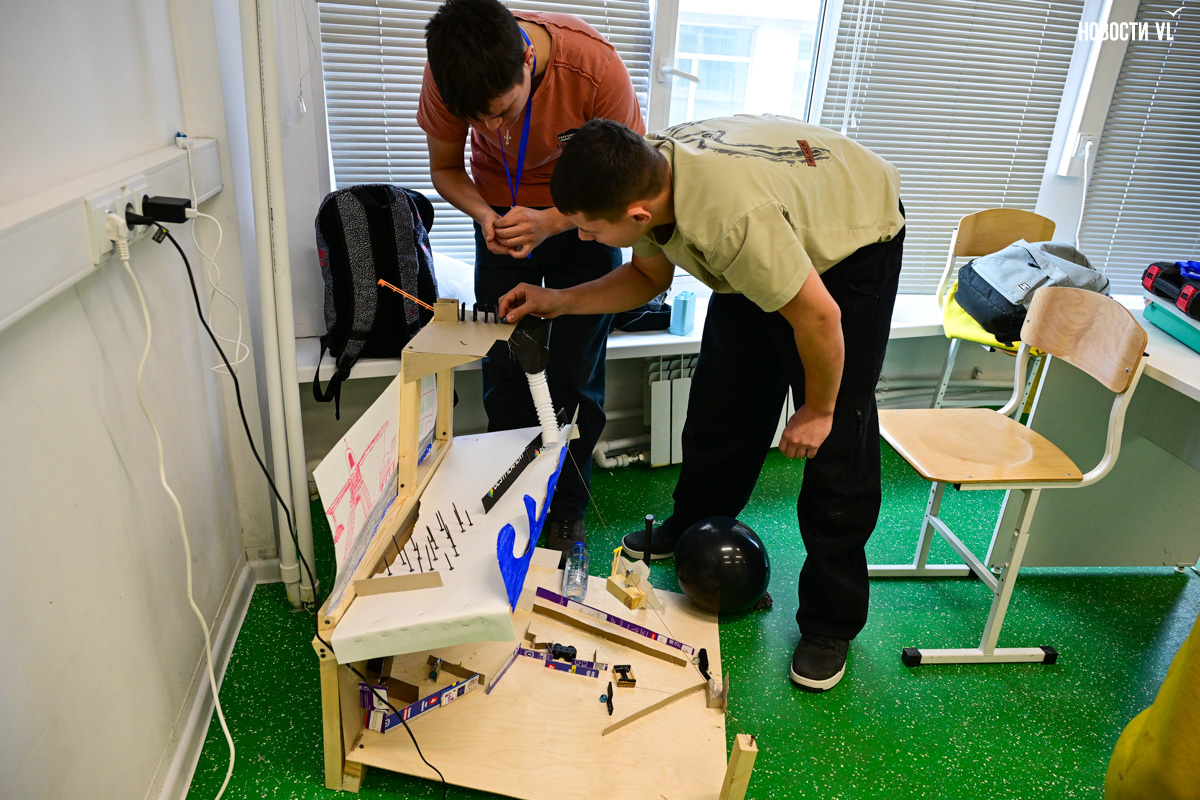 Самый спокойный и неинтересный, но лишь на первый взгляд, кабинет заняли айтишники. Критерии оценки у них в целом похожие, но ребята показывают не только саму модель, но и скрипт. Наблюдать за маршрутом шарика на экране не менее интересно, чем за его физическим инженерным воплощением. Промахи тоже случаются – где-то шарик, например, просто повисает в воздухе, поэтому оценивается и количество «касаний» – остановок программы.