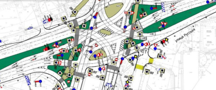 Напомним, что по утверждённому проекту на первом уровне развязки на Русской будут изменены конфигурация перекрёстка и схема движения, появится несколько островков безопасности, которые изогнут и разделят как встречные, так и попутные потоки. Руководить новой схемой движения будет целый комплекс умных светофоров.