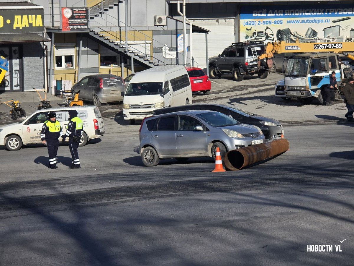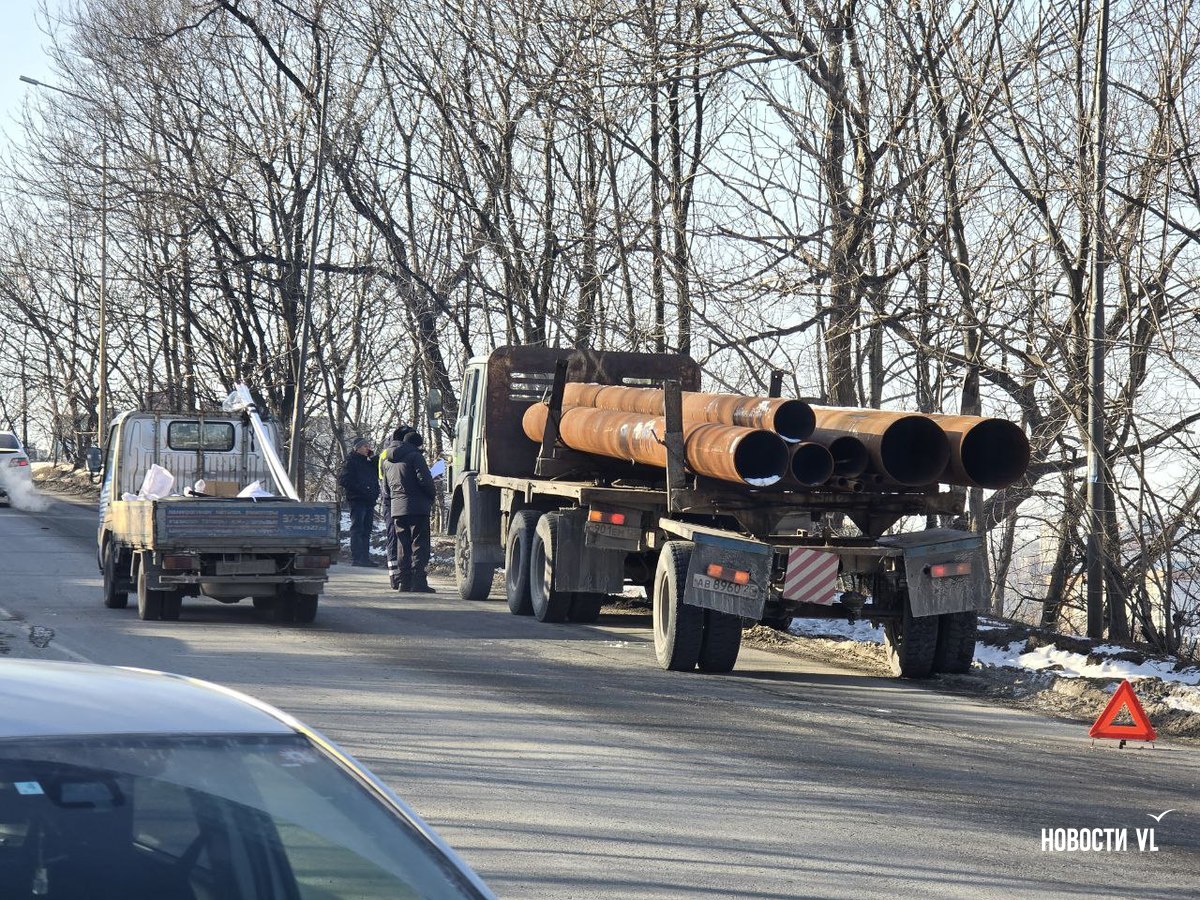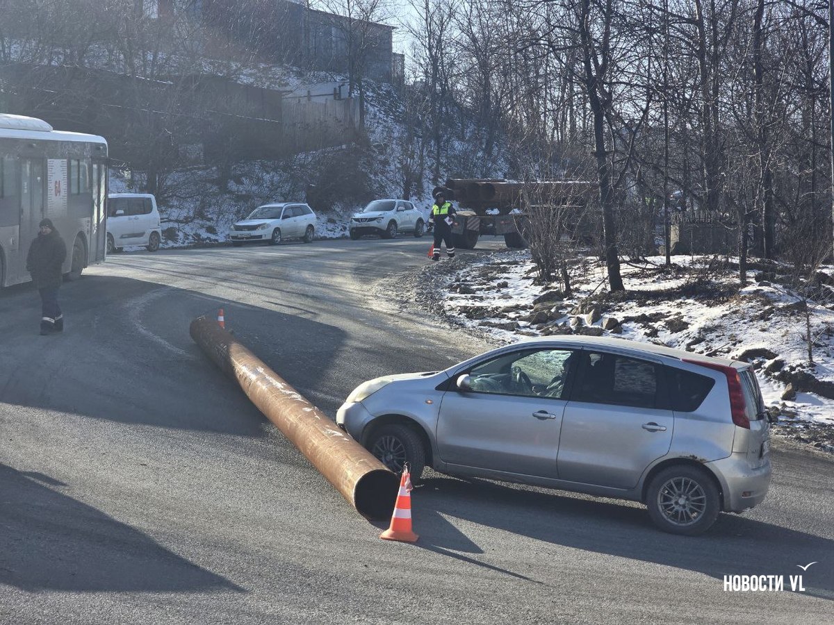 Большегруз, который вёз несколько больших металлических труб, поднимался по Стрелочной. Он преодолел крутой подъём с поворотом, после которого одна из труб выпала из кузова. Она упала на дорогу, а не на ехавший следом автомобиль, покатилась вниз и врезалась в Nissan Note. Судя по всему, никто не пострадал.