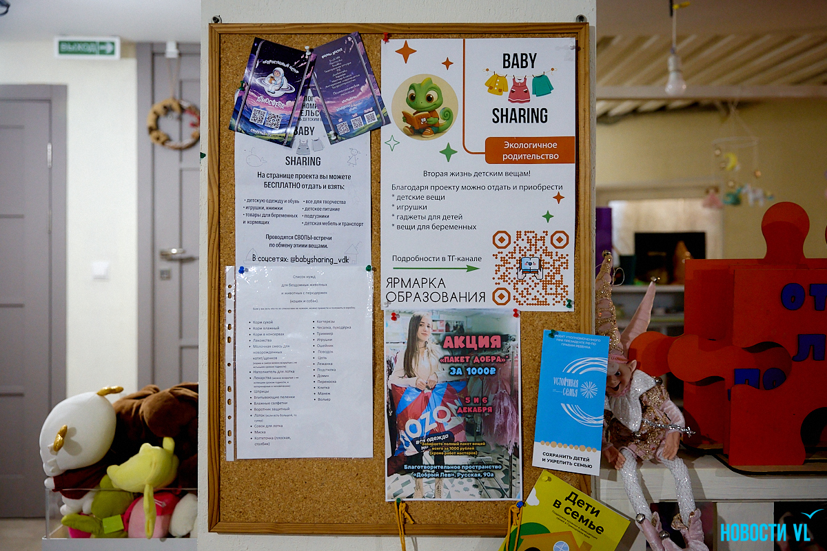 Несколько месяцев назад во Владивостоке появилось новое благотворительное пространство «Добрый Лев». Сюда можно принести детскую одежду, игрушки, коляски и взять что-нибудь нужное бесплатно или очень дёшево – одежда тут стоит от 100 до 700 рублей, при этом часто устраиваются распродажи. Ещё здесь есть большая детская игровая комната, место для мастер-классов и склад для ещё не разобранных вещей. Создатели благотворительного проекта – мамы с детьми, которые пять лет назад придумали «БебиШеринг» – онлайн-обмен детскими вещами и одеждой для беременных и кормящих мам с регулярными ярмарками. Теперь такие раздачи стали постоянными и одна из них прошла в субботу, 6 декабря. Цель – сделать так, чтобы вещи служили дольше и их меньше выбрасывали. Также это большое подспорье для родителей – можно за очень хорошую цену или бесплатно получить вполне приличные вещи для ребёнка.