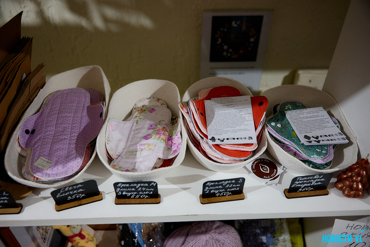 Несколько стеллажей отданы под украшения и очень экзотическую категорию товаров – тканевые памперсы и средства гигиены. Идея – пропаганда многоразового использования таких вещей. Это ручная работа мастеров, которые платят за аренду этих полок. Цены на свою продукцию они ставят сами, в среднем это от 200 до 600 рублей. Эти деньги «Добрый Лев» затем тратит на аренду помещения и другие накладные расходы.