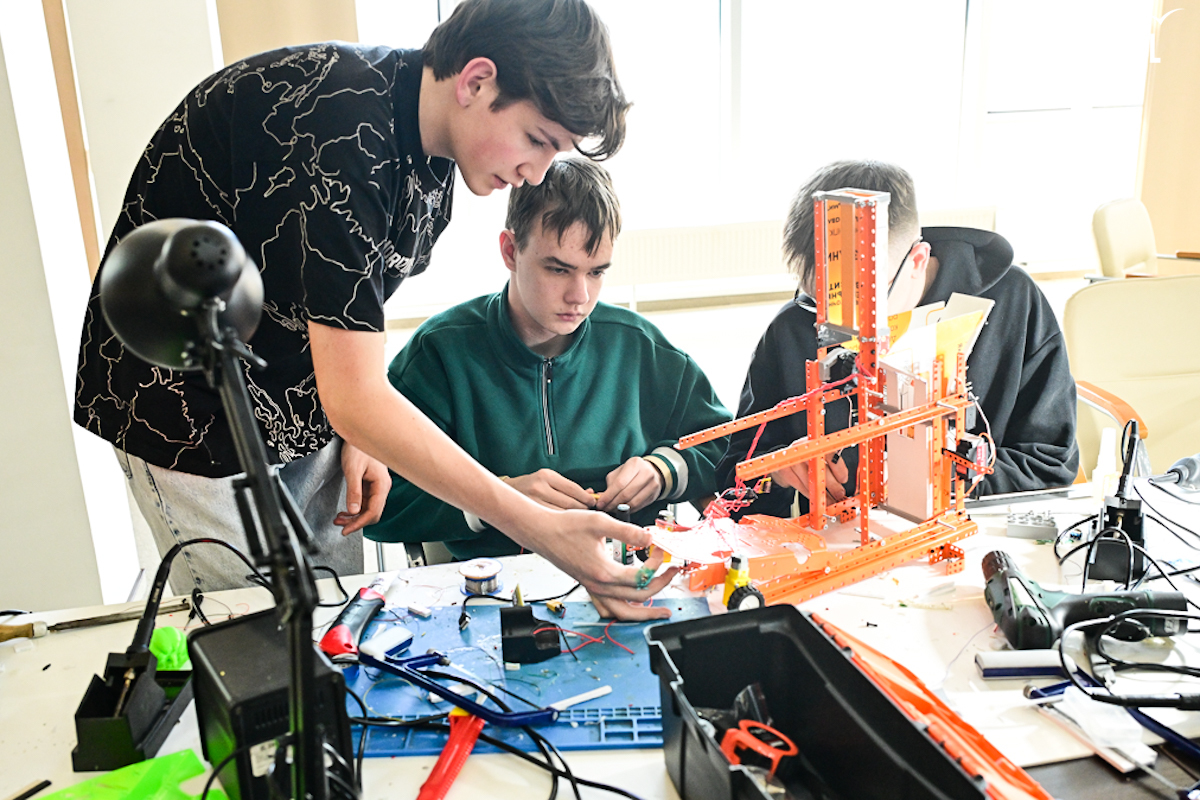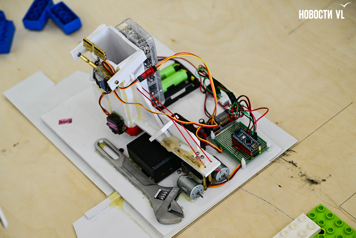 «Все по-разному делают – кто-то манипулятор делает, который строит буквально, мы вот прессом будем придавливать, у нас робот, как барабан, прижимает, стучит. У нас у каждого своя задача – есть программист, кто-то электроникой занимается, схемотехникой, кто-то – конструированием. Мы с 9 утра вчерашнего дня не спим, кто-то только 3 часа поспал. Очень тяжело. Но это прикольно, полезный опыт – понять, как вживую работает команда, когда с реальной проблемой сталкивается», – рассказали участники команды Mean Machine усталым голосом.