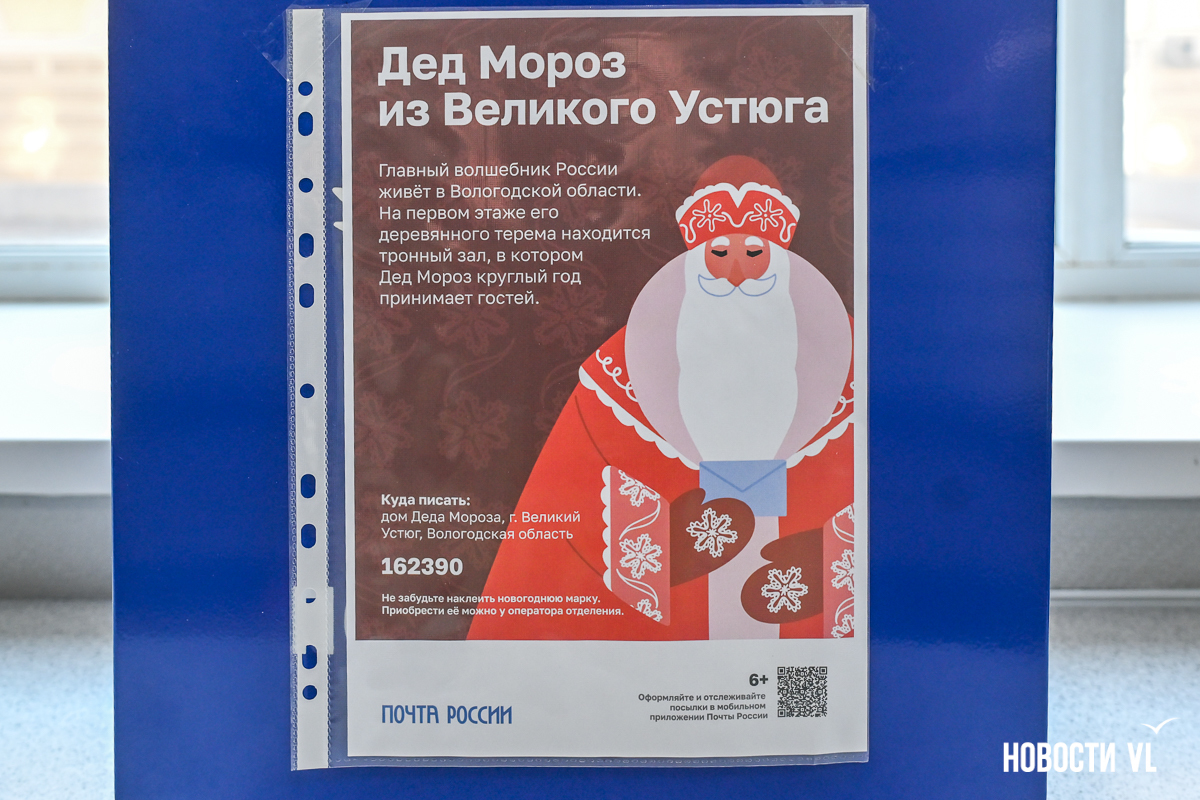 Почта России сообщила, что в центральном почтовом отделении Владивостока установили ящик для писем Деду Морозу. Адрес для новогодней почты размещён рядом на красочном плакате: 162390, Дом Деда Мороза, Великий Устюг, Вологодская область. За сутки жители Приморья отправляют от 150 до 500 таких писем.