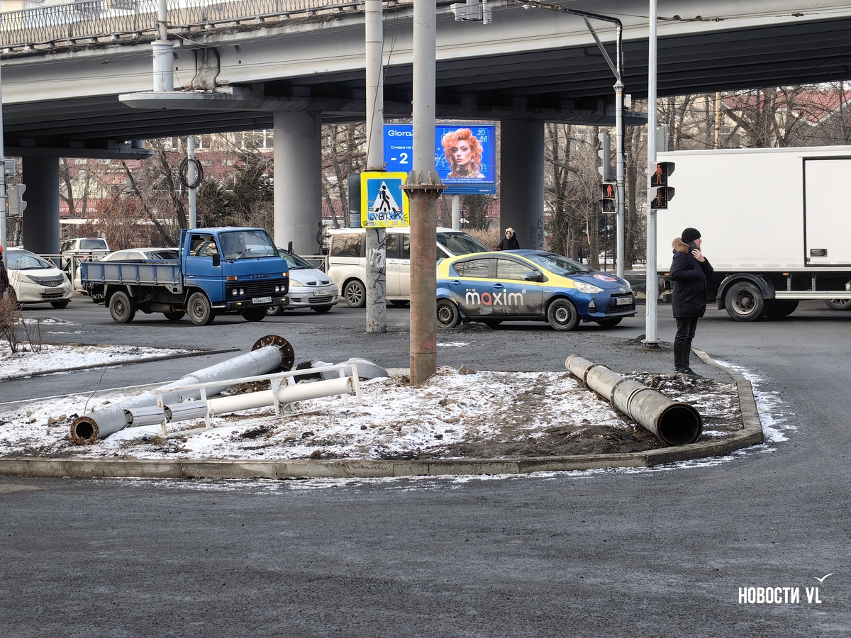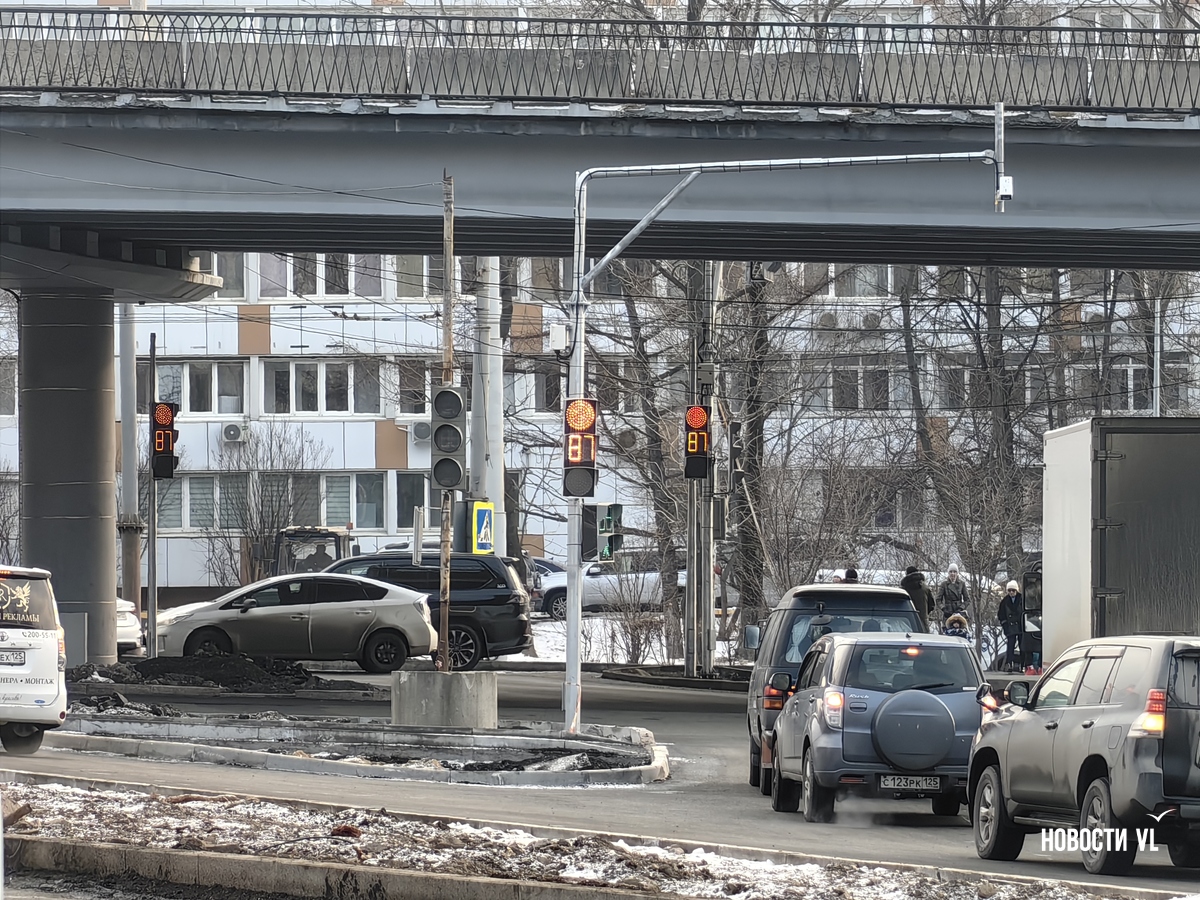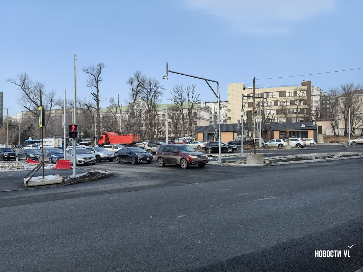 Все выходные на перекрёстке Русской и проспекта 100-летия Владивостока, который уже впору называть прóклятым, кипела работа: здесь подключали хитрый контроллер «умных» светофоров, настраивали их, а также готовили дорогу к асфальтированию. К понедельнику светофоры уже работали, а несколько ям превратились в ровную проезжую часть. Но некоторые проезды всё ещё в дырах, со снятым верхним слоем. Разметки нет даже на готовых участках, а знаков со схемой проезда или хотя бы с приоритетом до сих пор нет нигде.