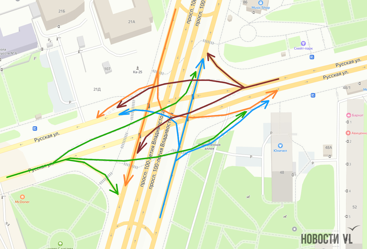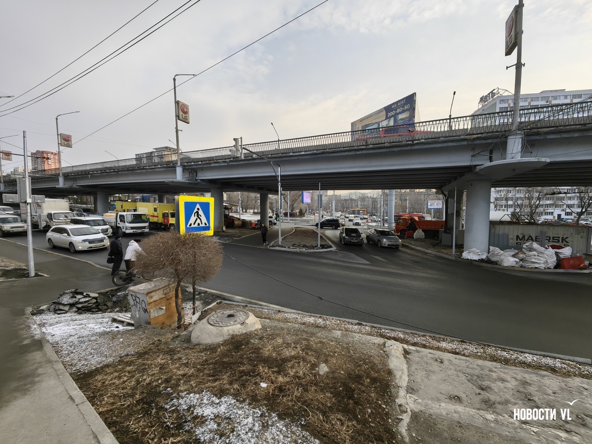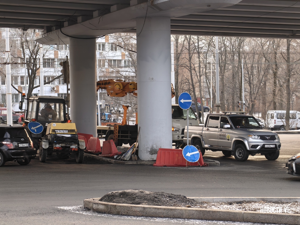 Все выходные на перекрёстке Русской и проспекта 100-летия Владивостока, который уже впору называть прóклятым, кипела работа: здесь подключали хитрый контроллер «умных» светофоров, настраивали их, а также готовили дорогу к асфальтированию. К понедельнику светофоры уже работали, а несколько ям превратились в ровную проезжую часть. Но некоторые проезды всё ещё в дырах, со снятым верхним слоем. Разметки нет даже на готовых участках, а знаков со схемой проезда или хотя бы с приоритетом до сих пор нет нигде.