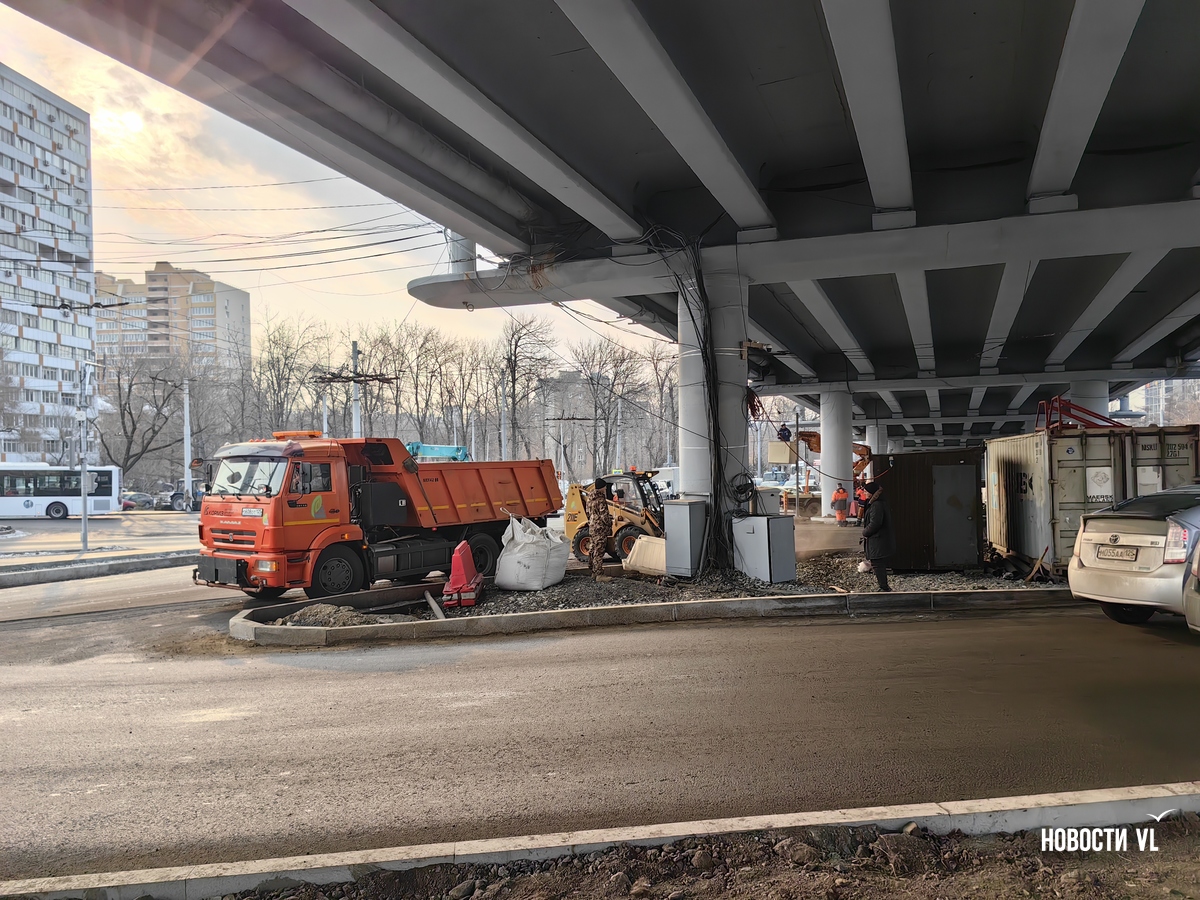 Заасфальтировали выезд с Русской в сторону центра под путепроводом. А провода (и здоровенные сосульки) всё ещё свисают с него. Без асфальта пока выезд со стороны автовокзала и проезд со стороны кольца Багратиона в сторону «Зари». Техника ездит одновременно с автомобилями, большегрузы яростно сигналят любителям повернуть с правого ряда налево, водители путаются в «рукавах», ведущих то ли с одной части Русской в другую, то ли на Столетие в обе стороны.