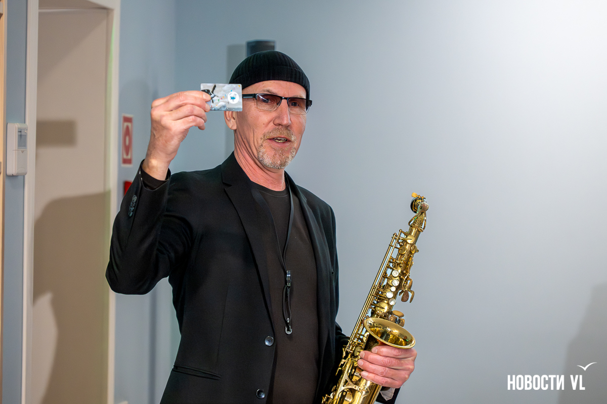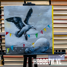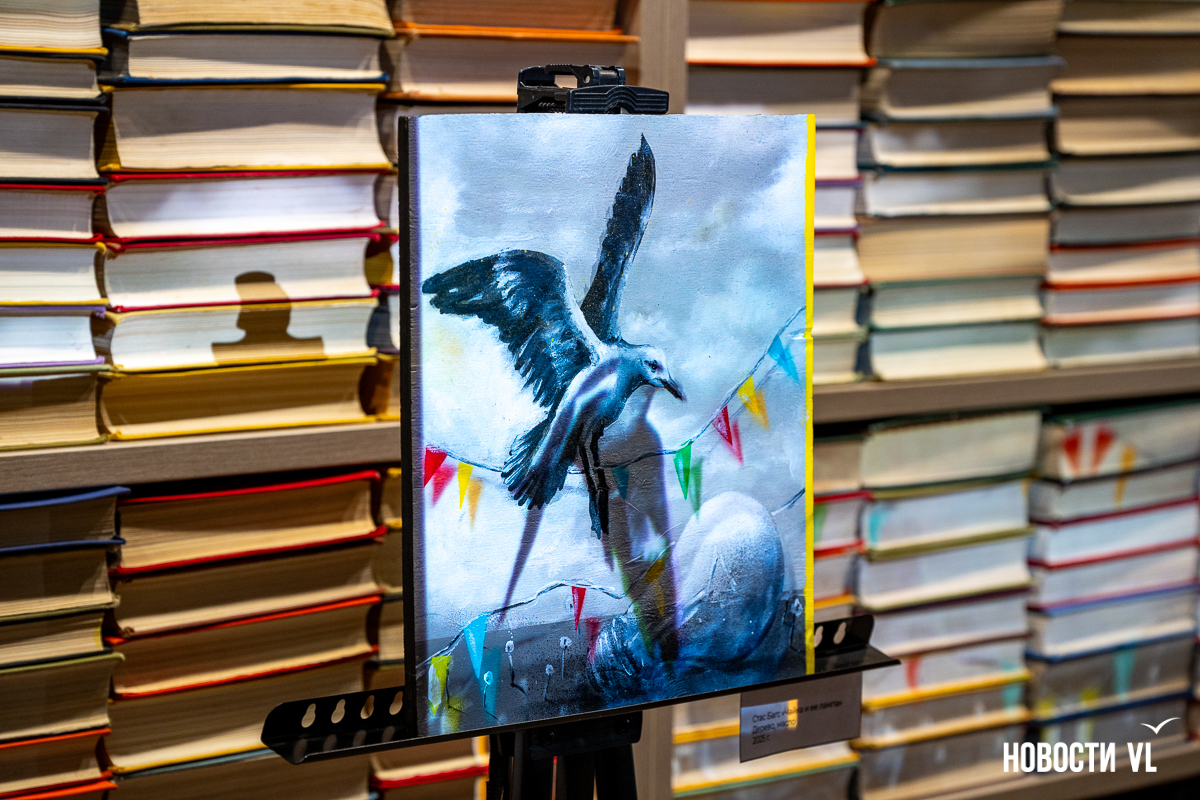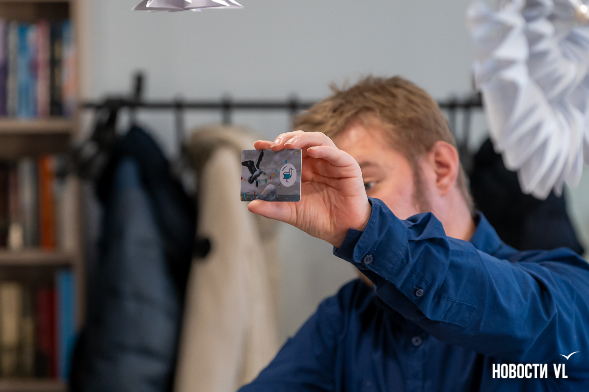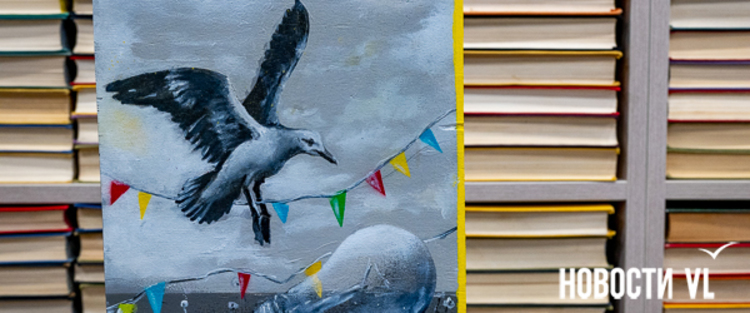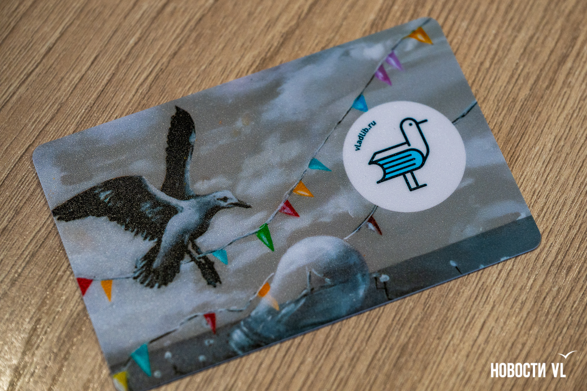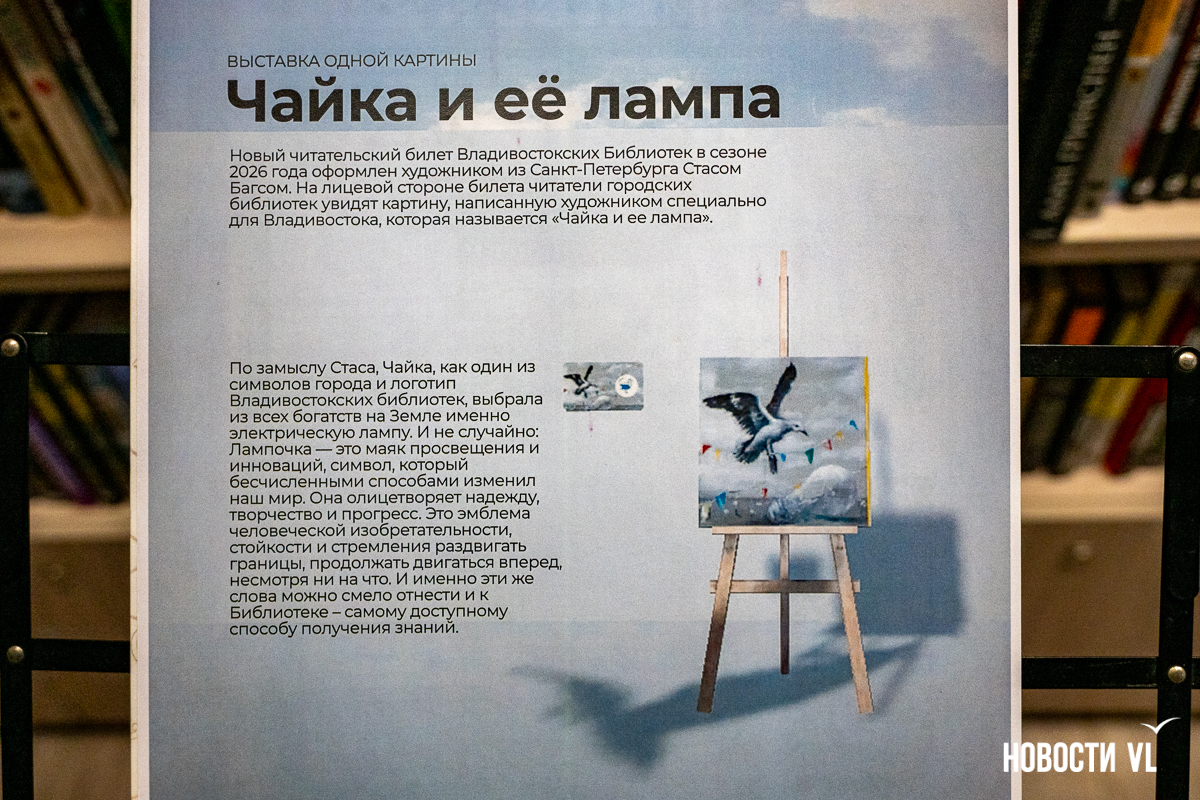 Картина «Чайка и её лампа» сделана на заказ. И это не обычное изображение, а новый дизайн читательских билетов. Самый первый передали Стасу Багсу, а ещё 7000 уже ждут своих владельцев. Пока получить их можно только в библиотеке на проспекте 100-летия Владивостока, 48, там же, где сейчас выставлена картина, но вскоре их обещают распространить и по другим филиалам.