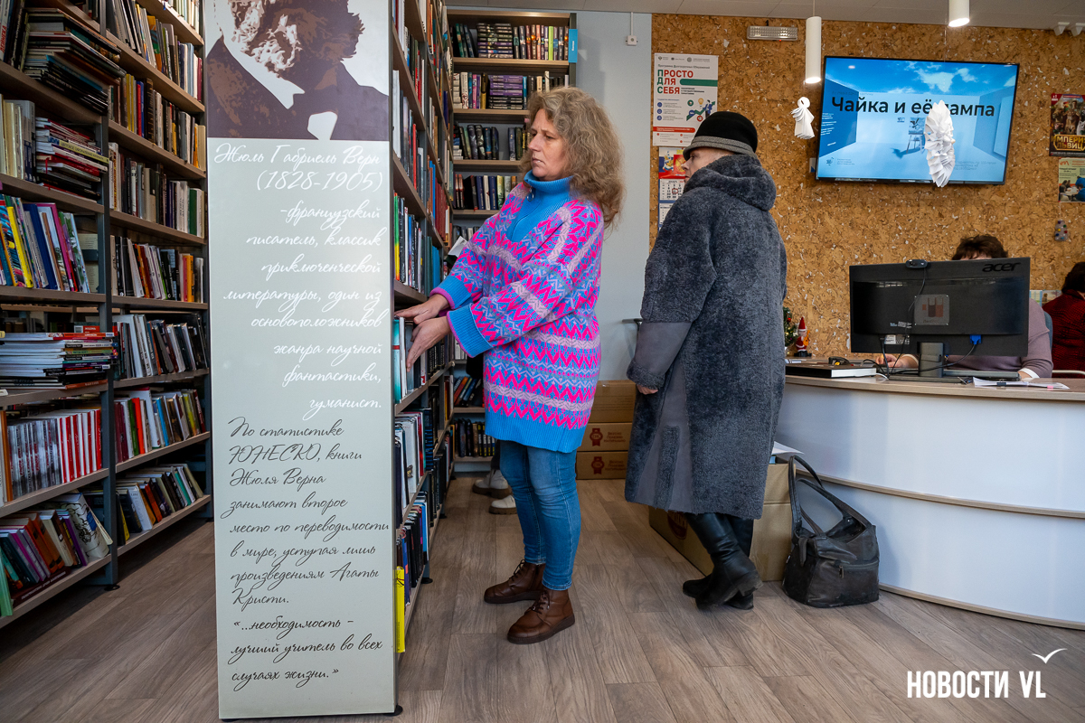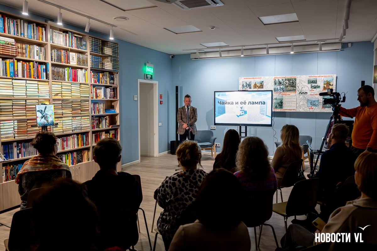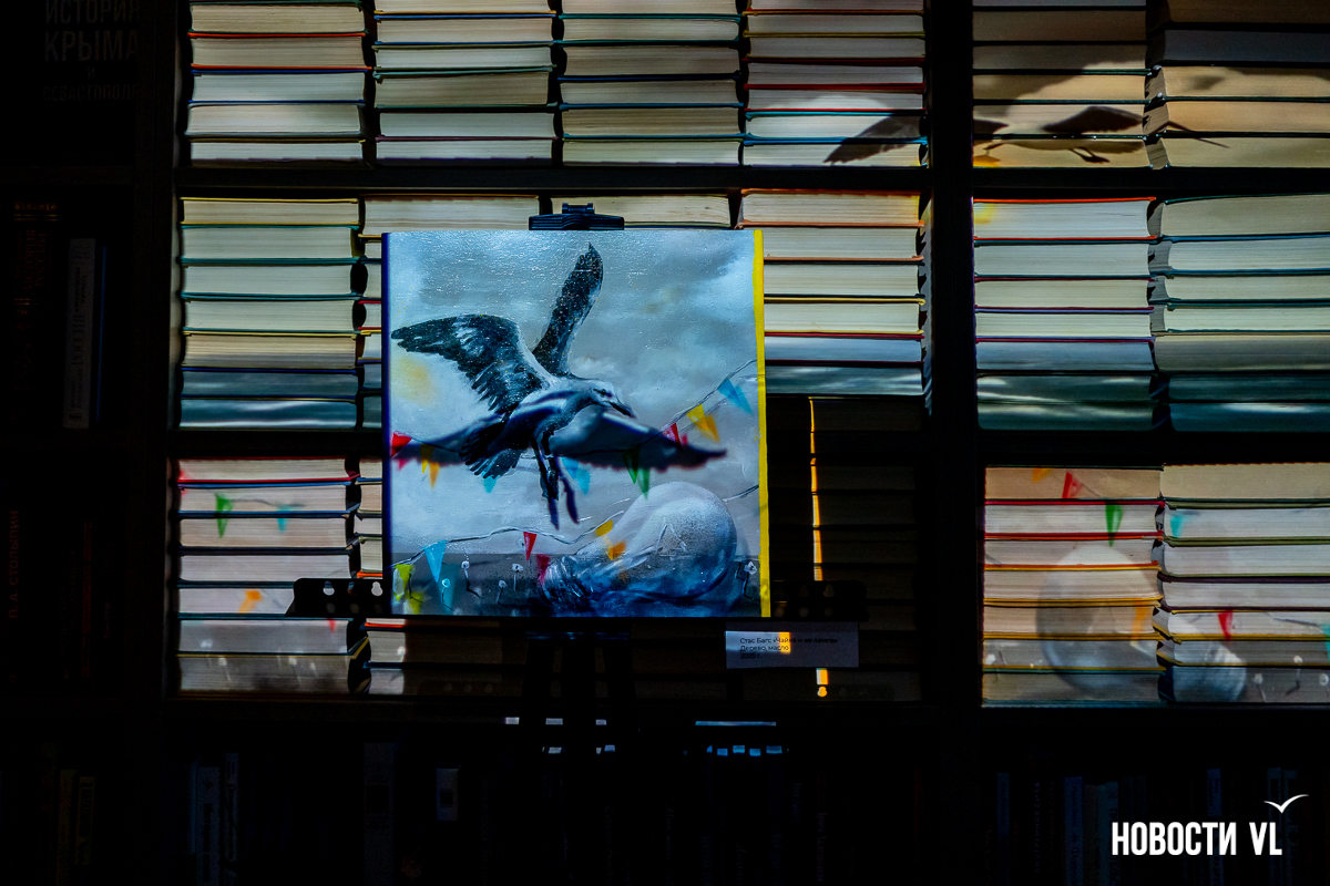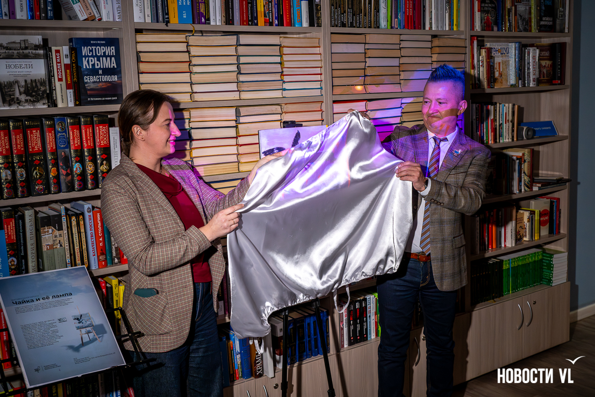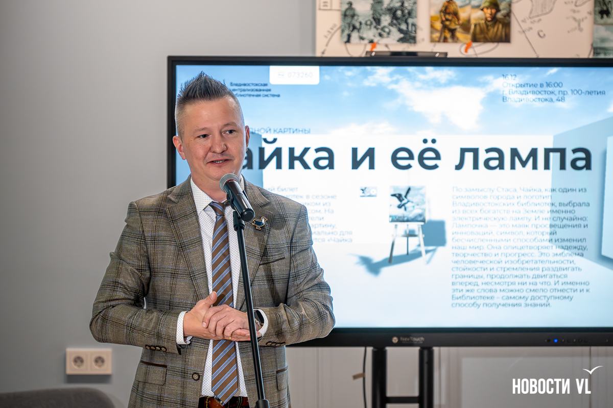В библиотеке имени Чехова во Владивостоке представили картину «Чайка и её лампа» петербургского художника Стаса Багса. Это не просто памятный подарок, переданный через всю страну, но и новый дизайн читательских билетов. Работу выполнили специально под заказ библиотеки, и пока она стоит в филиале на проспекте 100-летия Владивостока. В будущем картина отправится в «турне» по остальным адресам книжных залов, а цифровую версию инсталляции вскоре можно будет увидеть на странице городского проекта Digital-библиотеки.