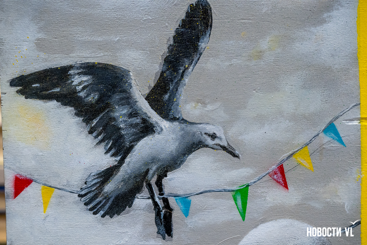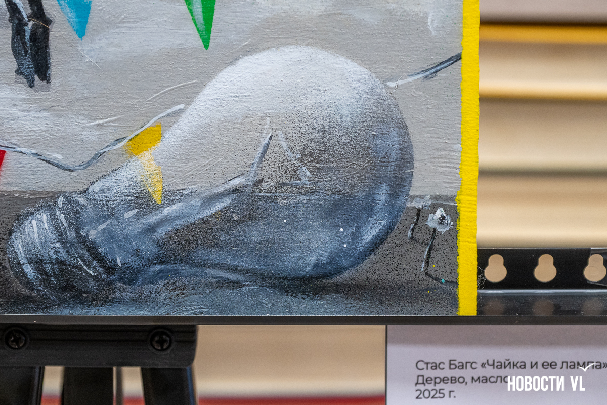 Живописная чайка опускается к земле по ветру, цепляя тонкими лапами дрейфующую лампочку, на фоне развиваются красочные флажные ленты. Масляные краски на деревянном полотне выдают творческий почерк художника. Играет саксофон. Это не обычная торжественная презентация, а настоящий перформанс, знаменующий прибытие картины из Санкт-Петербурга во Владивосток.