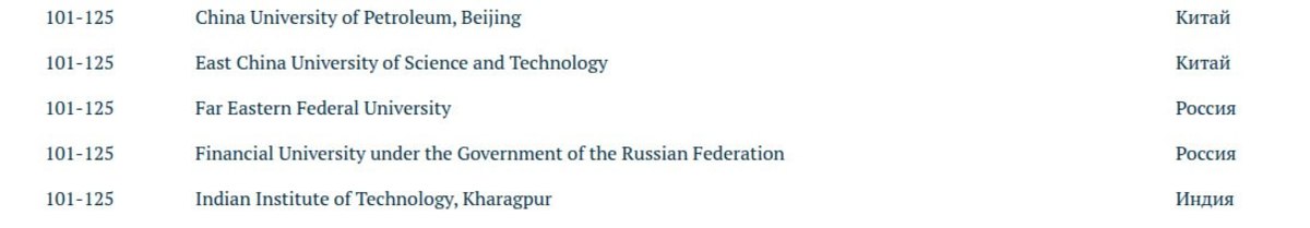 ДВФУ не смог конкурировать с новичками и в списке этого года потерял свою позицию в рейтинге 100 лучших, опустился на 11 строчек и теперь находится на 107-м месте, в блоке «101-125». Над ним оказался Белорусский государственный университет, три вуза Таиланда (самый известный – Бангкокский Университет им. Короля Чулалонгкорна), два университета Малайзии (в том числе Малайя – старейший и самый престижный вуз страны) и два университета Индонезии. На своих местах остались несколько университетов из Пекина, однако теперь они располагаются выше ДВФУ, а не ниже как раньше.