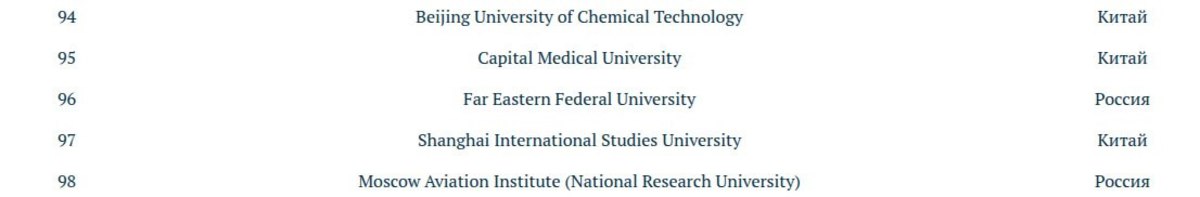 Возглавил рейтинг Пекинский университет, на втором месте оказался российский МГУ им. Ломоносова, на третьем – китайский университет Цинхуа. ДВФУ отметился 96-м местом из 600, уступив другим 23 российским вузам вроде Томского политехнического университета, Сеченовского университета и Казанского федерального университета, а также университетам Китая, Ирана, ОАЭ, Саудовской Аравии, Индии, ЮАР и Бразилии.