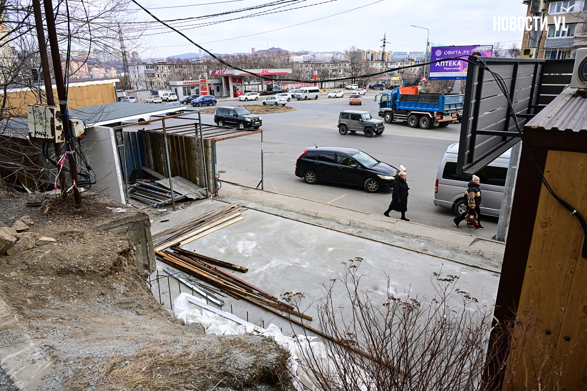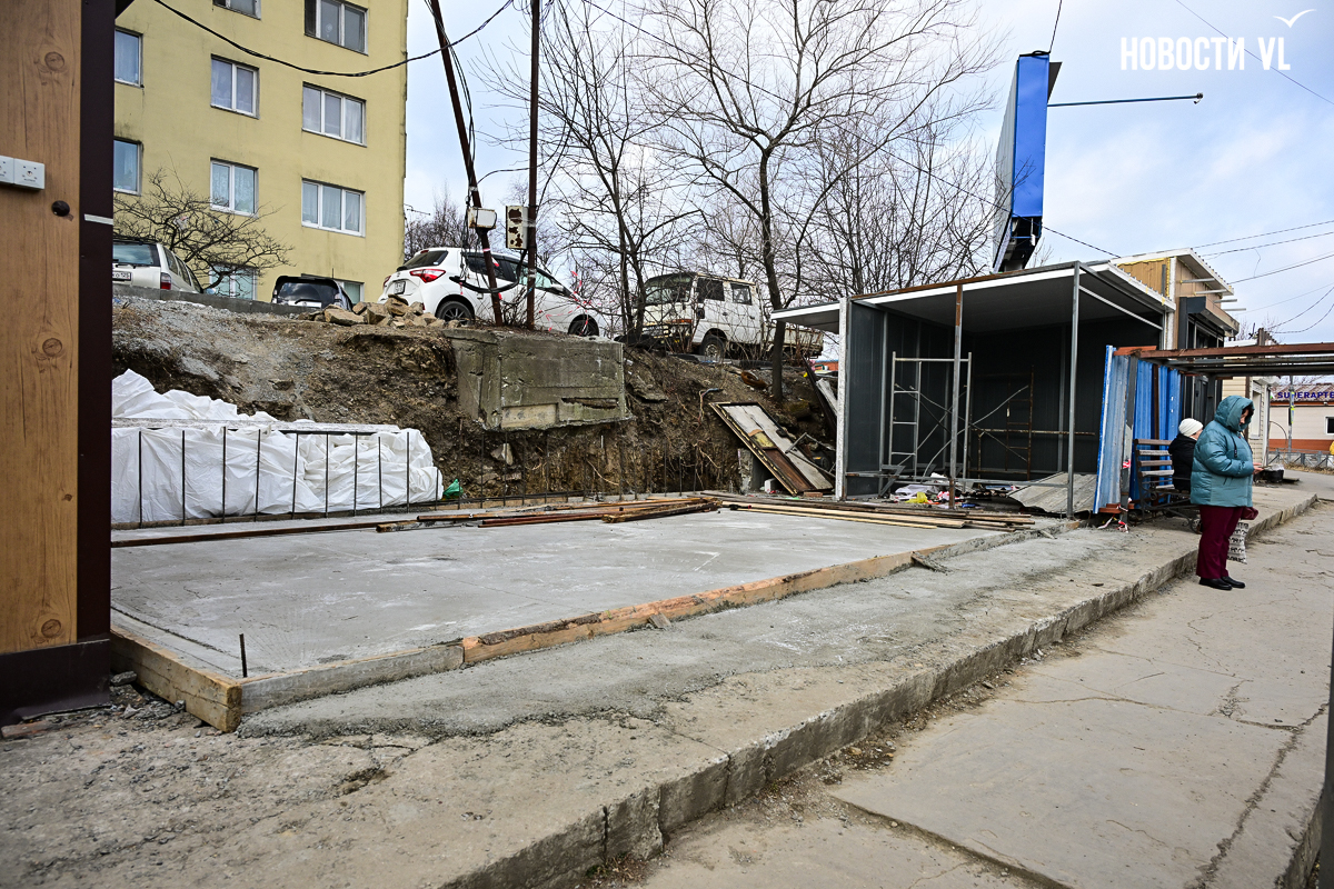 Стройка ведётся рядом с пешеходным переходом, между павильоном «Цветы» и мясным ларьком. Здесь подготовили новый фундамент под торговый павильон, на тротуаре рядом с будущим остановочным павильоном установили железные столбы – вероятно, будущее защитное ограждение на время более капитальных работ.