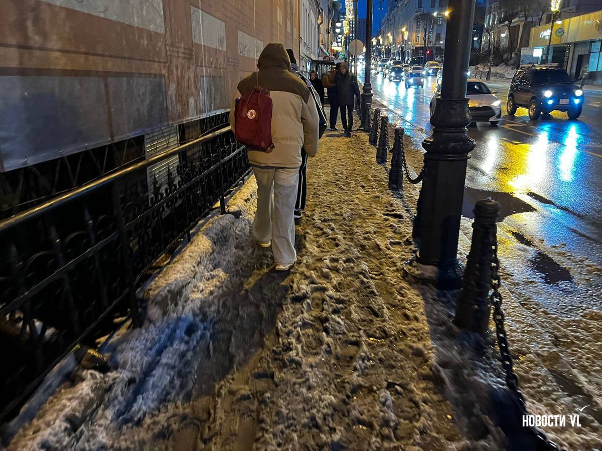 Снег с дождём, которые прошли во Владивостоке во вторник, 23 декабря, превратили город в ледяной парк аттракционов. Тротуары покрыты скользкой коркой, которая в некоторых местах сменяется кашей из снега и грязи. Кое-где эта каша замёрзла. Путь на работу сегодня утром превратился для горожан в испытание и попытки избежать травмы. На дорогах ситуация не лучше, автомобили скользят и попадают в аварии.