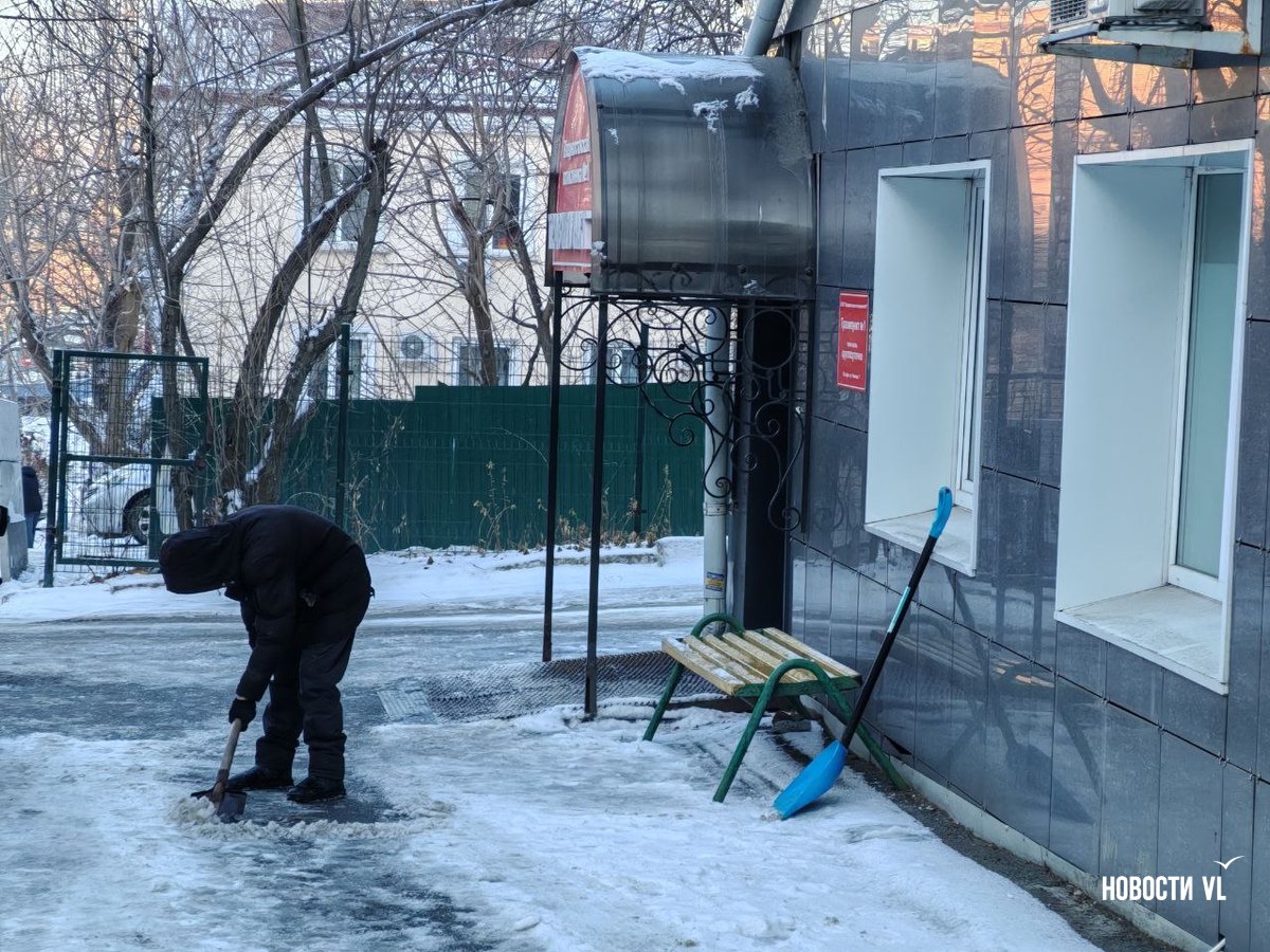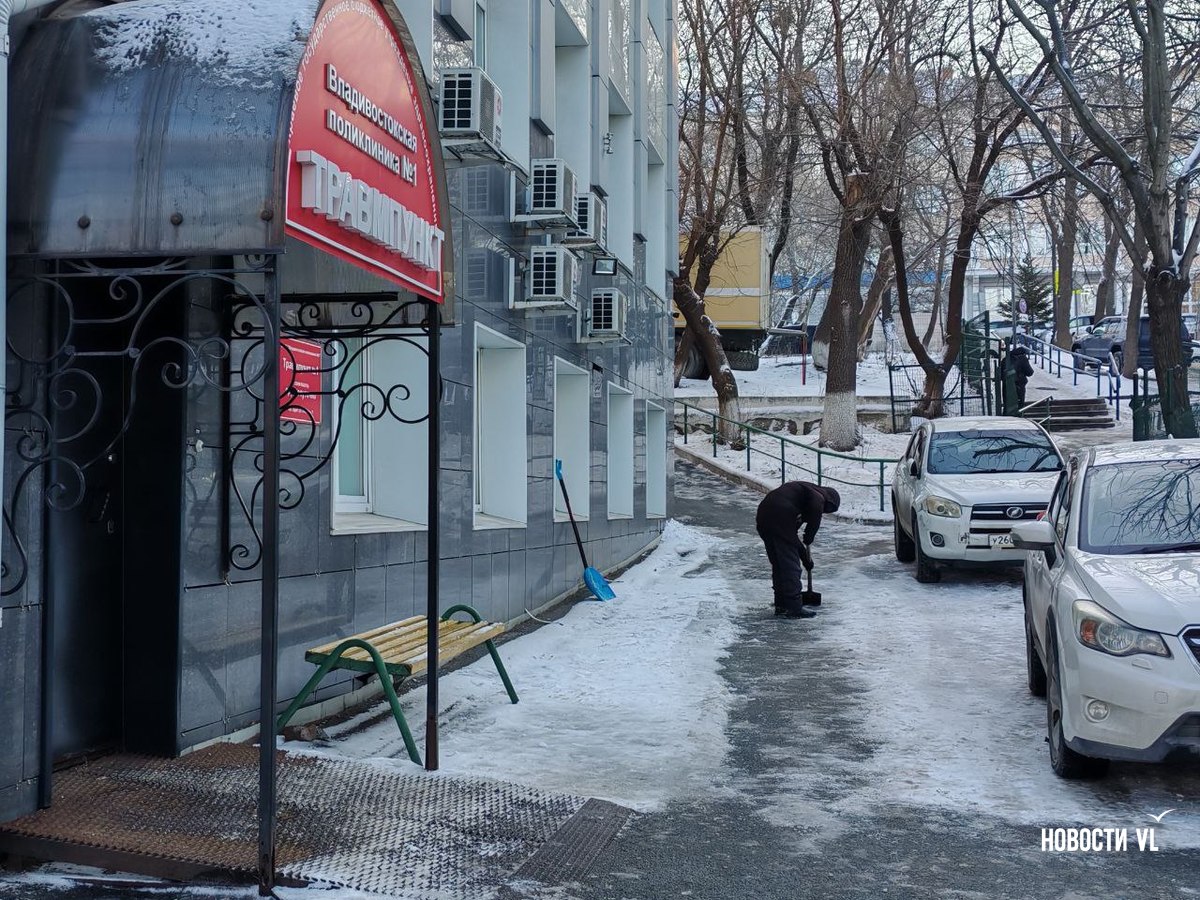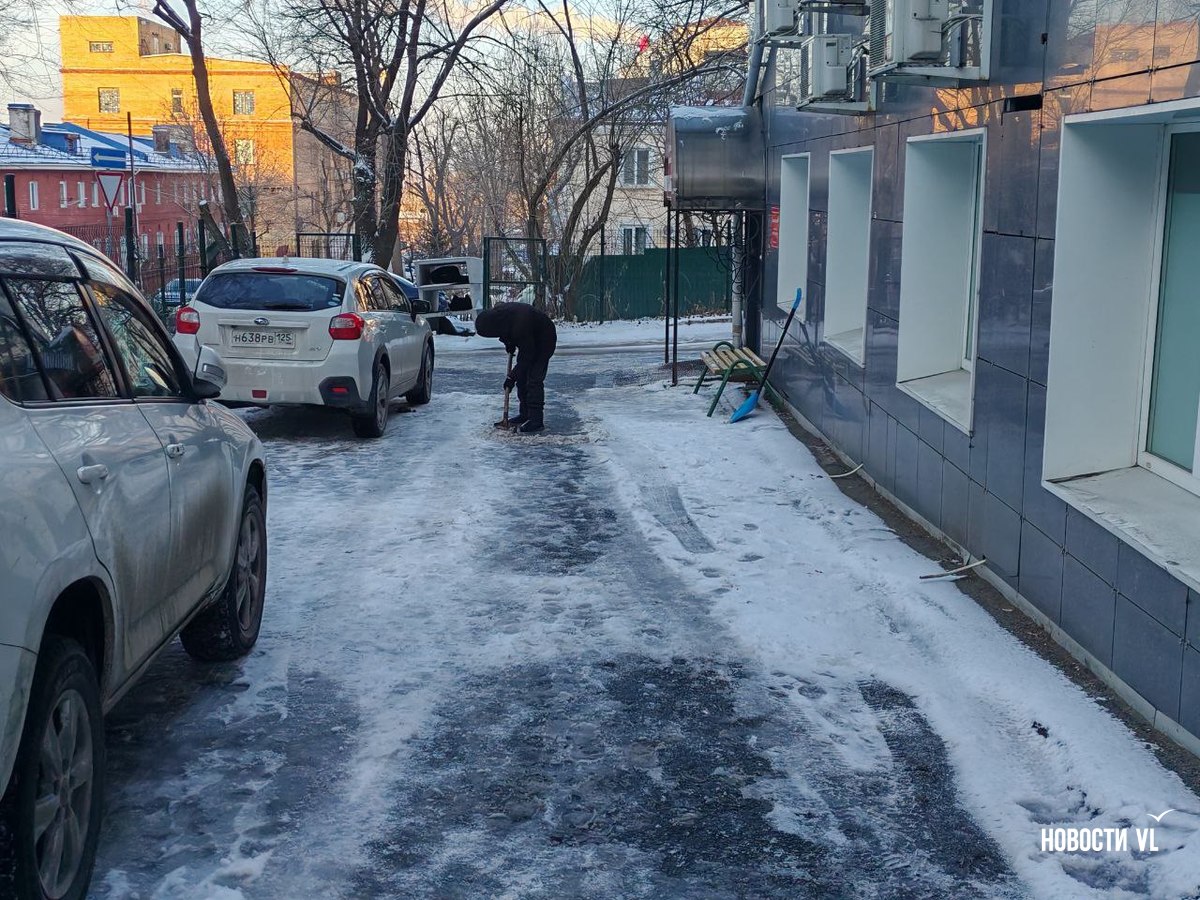 В 10 утра корреспондент Новостей VL поднимался к травмпункту на Уткинской пешком – по Океанскому проспекту от пересечения с Фонтанной. Весь тротуар в ледяной корке – настолько скользко, что приходится семенить. Люди вокруг напоминают пингвинов, идущих мелкими шагами вперевалку и расставивших в стороны руки для равновесия. Обойти негде – если только по проезжей части. Лишь в одном месте, почти напротив администрации города, работали три дворника.