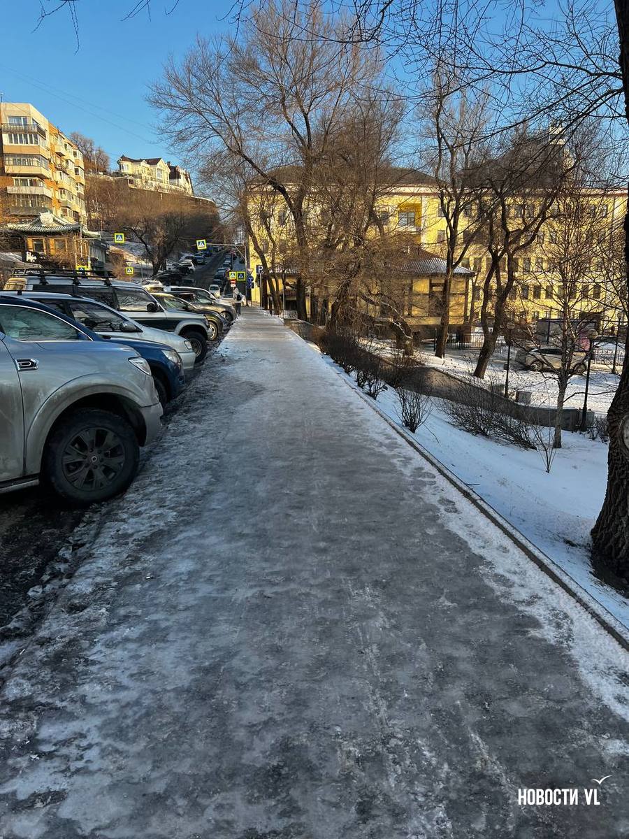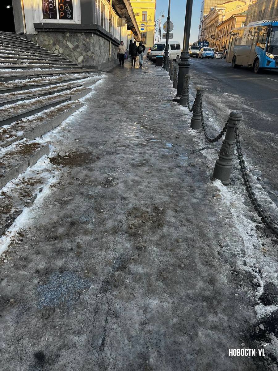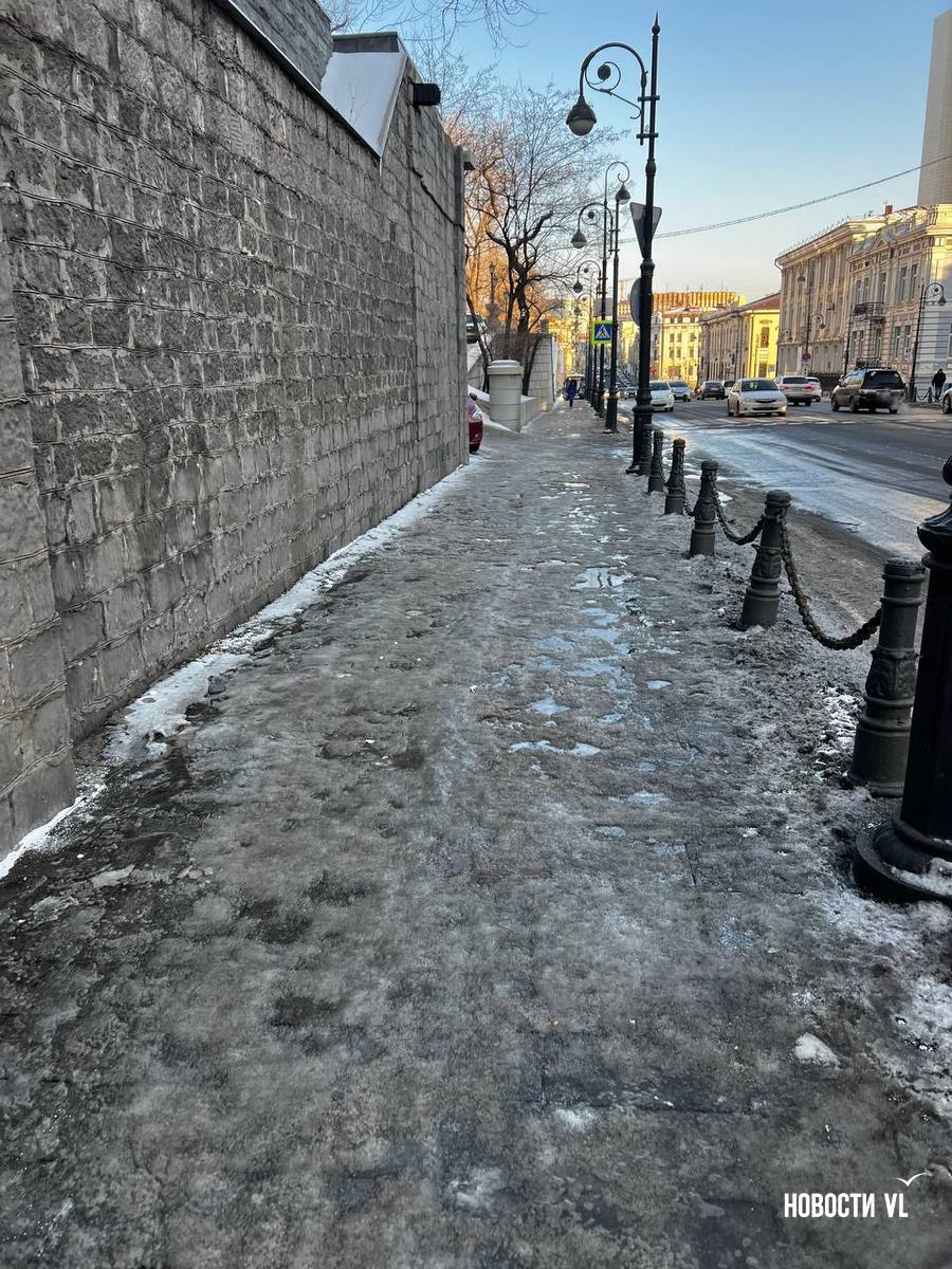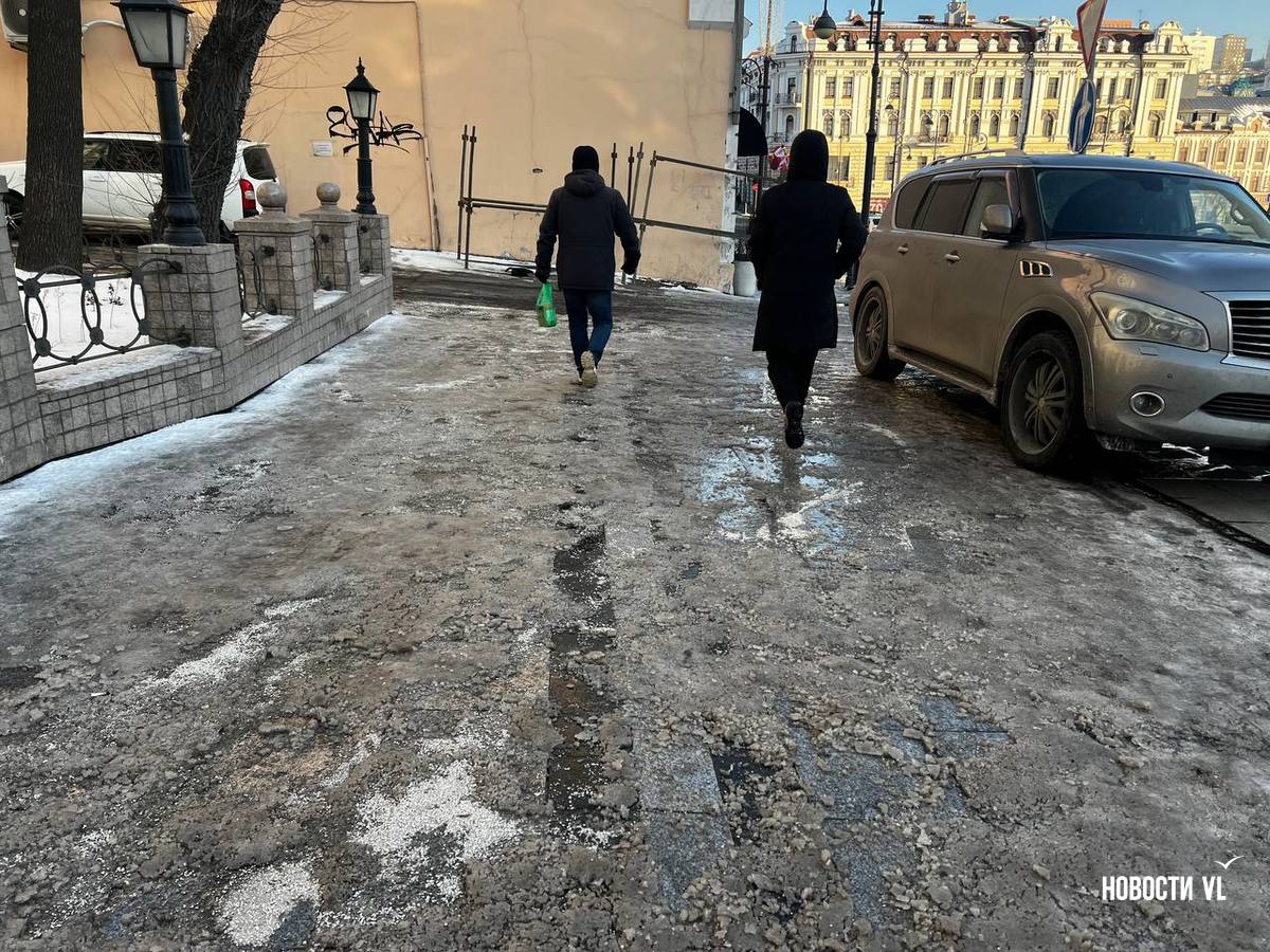 На второй день после снегопада улицы Владивостока остаются крайне опасными для передвижения. Даже в центре города есть тротуары, которые не только не почистили, но и даже, похоже, не посыпали реагентами. Местами, в том числе и на горках, путь пролегает по отполированному льду. Пешеходы обходят такие участки по проезжей части, считая это меньшим риском. Возле медучреждений на льду падают пациенты, в том числе и беременные. Даже прокуратура признаёт, что качество уборки в городе провальное.