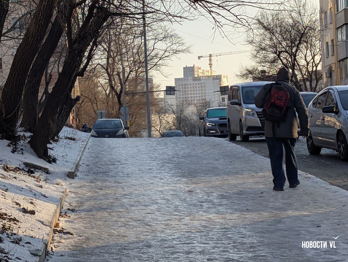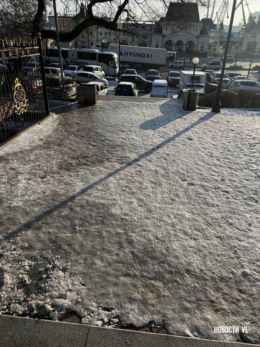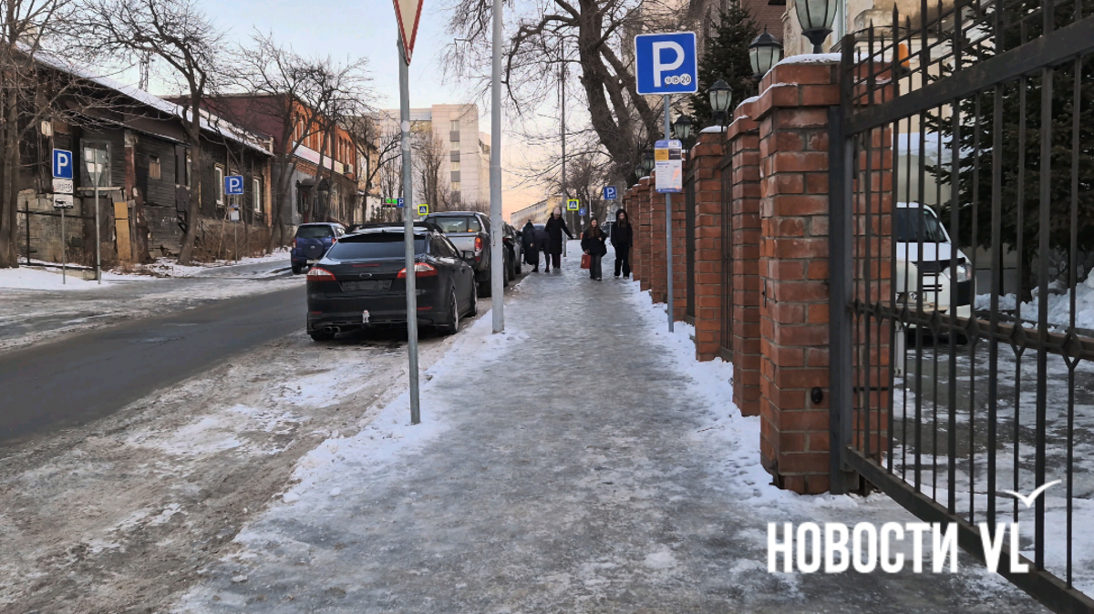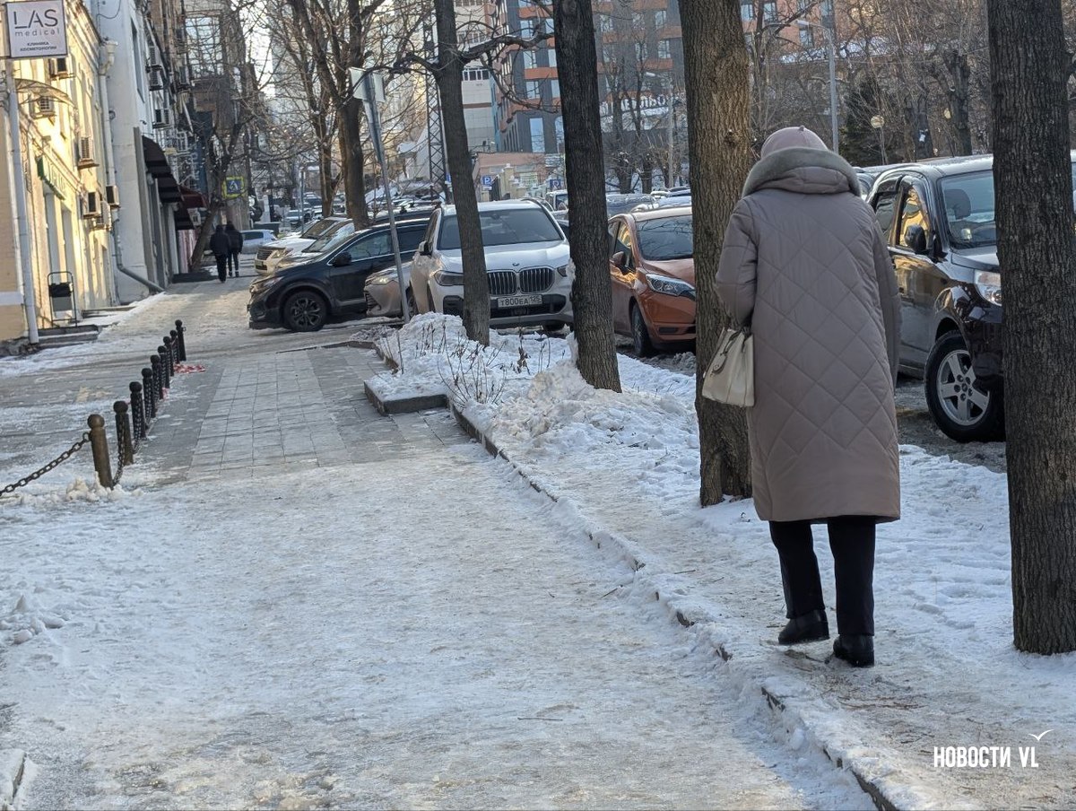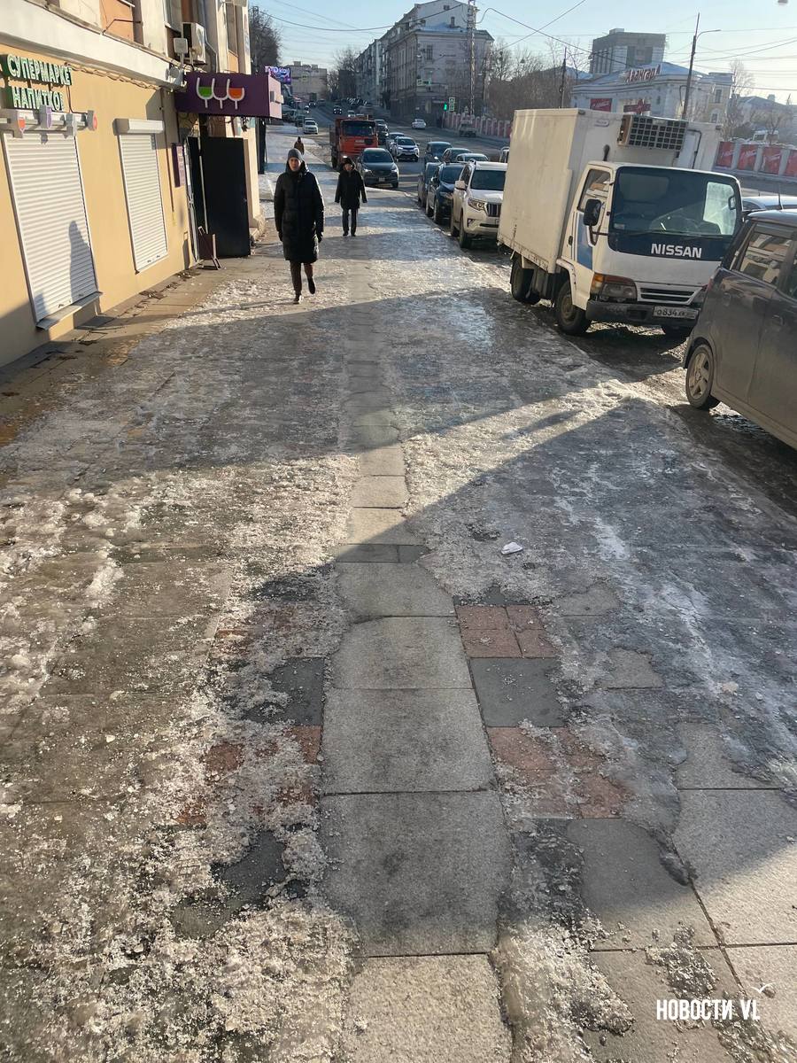 На второй день после снегопада улицы Владивостока остаются крайне опасными для передвижения. Даже в центре города есть тротуары, которые не только не почистили, но и даже, похоже, не посыпали реагентами. Местами, в том числе и на горках, путь пролегает по отполированному льду. Пешеходы обходят такие участки по проезжей части, считая это меньшим риском. Возле медучреждений на льду падают пациенты, в том числе и беременные. Даже прокуратура признаёт, что качество уборки в городе провальное.