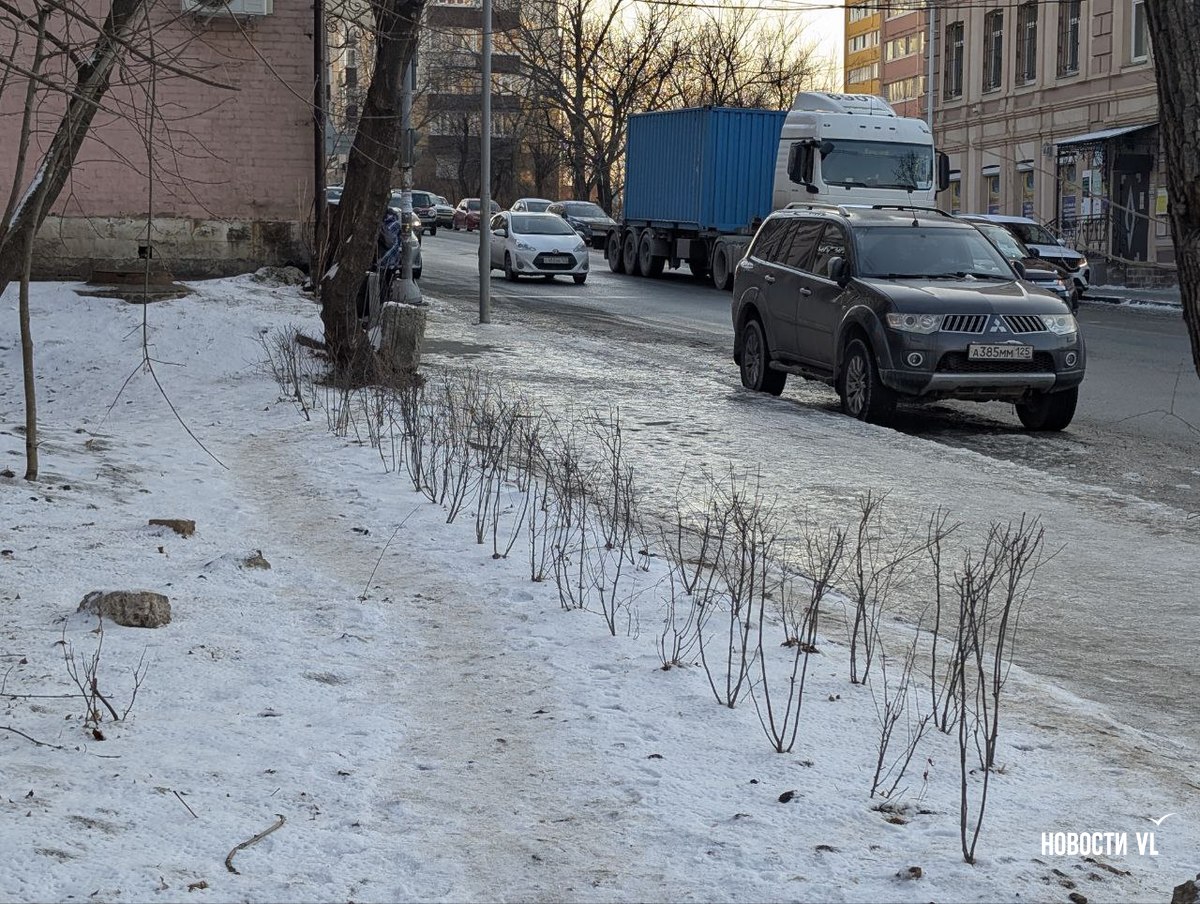 Местами лёд уже убрали, однако под ним ещё более скользкая гранитная брусчатка, которую некоторые местные в шутку называют пушкаритом, поскольку поставлялась она в эпоху Игоря Пушкарёва со Спасскцемента. Такое покрытие редко колется, но после дождей, туманов и особенно снегопадов оно начинает испытывать вестибулярный аппарат горожан. Подобные проблемы сейчас на Алеутской – тротуары здесь посыпали реагентом, лёд местами растаял, но по этой каше ходить даже опаснее. Газонов на Алеутской почти нигде нет. Кто-то решается выйти на обочину дороги – она в автомобилецентричном Владивостоке, как правило, не скользкая.
