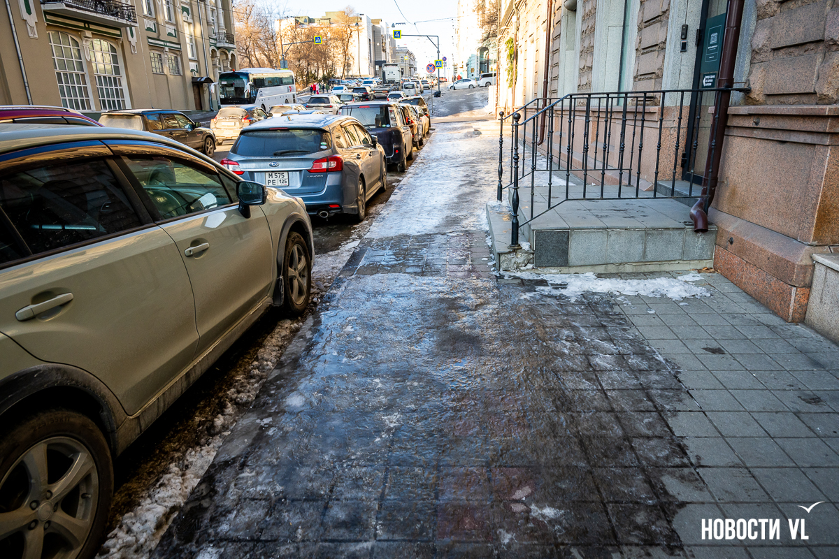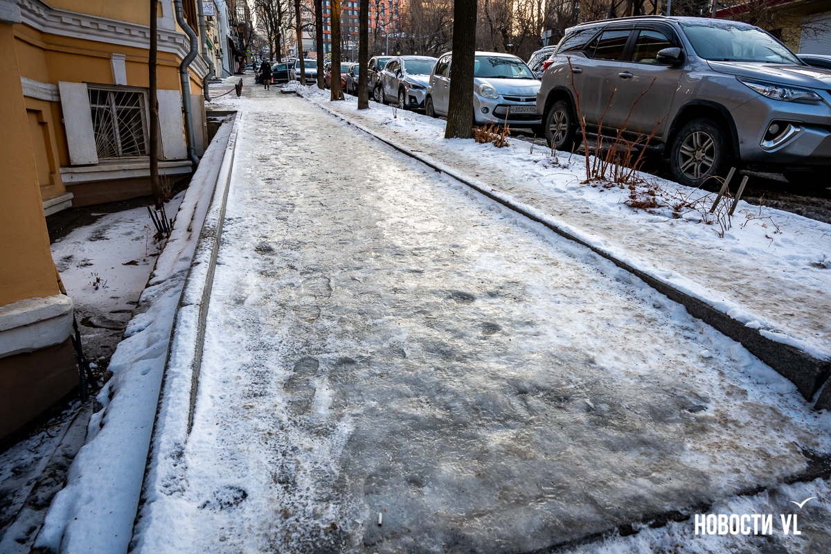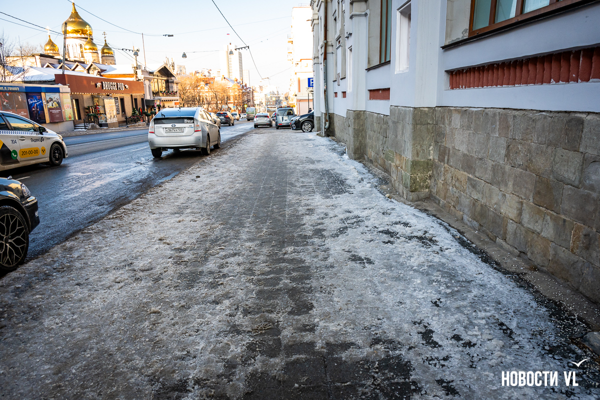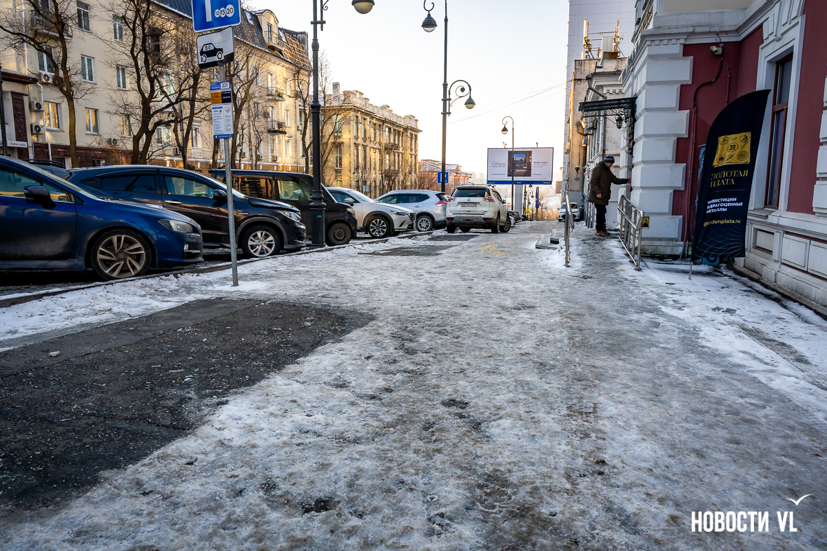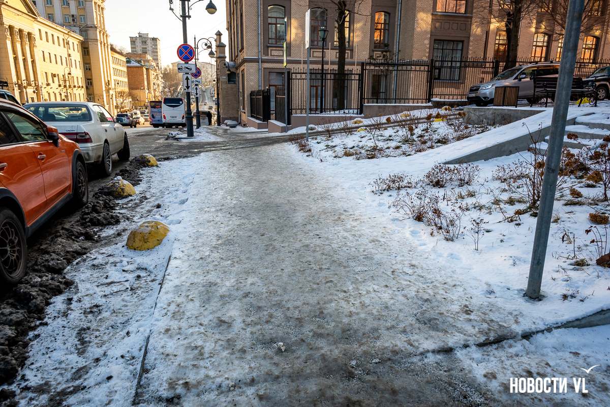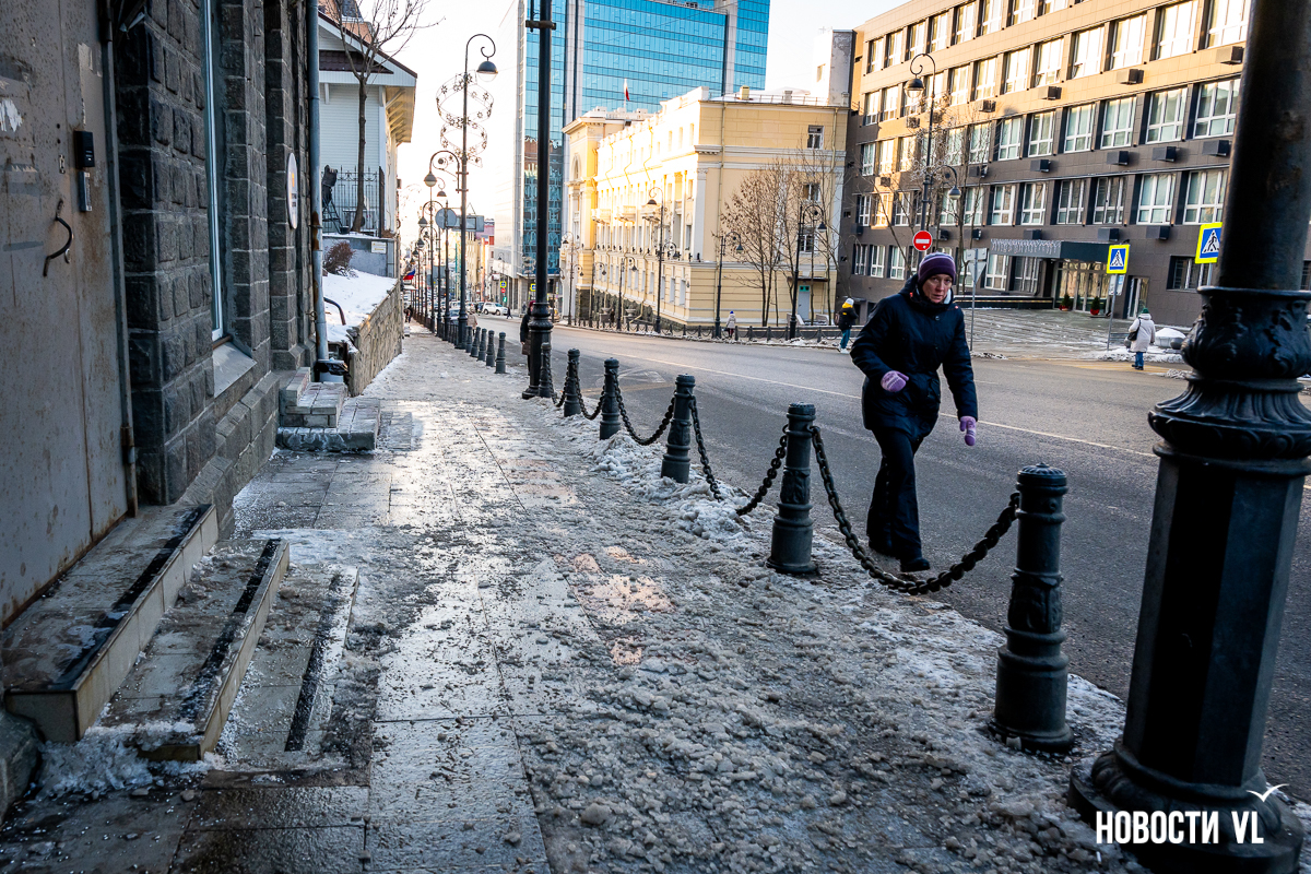 Владивосток всё ещё приходит в себя после снега с дождём, выпавшего два дня назад. Основные дороги были убраны оперативно, а вот тротуары – в толстой корке льда, при этом на многих участках нет даже песка. Плохую подготовку к непогоде показали не только муниципальные службы, но и управляющие компании и юрлица. Тех, кто оперативно не убрал снег и лёд, будут штрафовать, причём комиссии уже работают. Как рассказали Новостям VL в одной из УК, по процедуре – есть время на устранение нарушения, а штраф можно оспорить. Если же это не произойдёт, то платить компания будет из своей прибыли – брать деньги из средств дома запрещено.