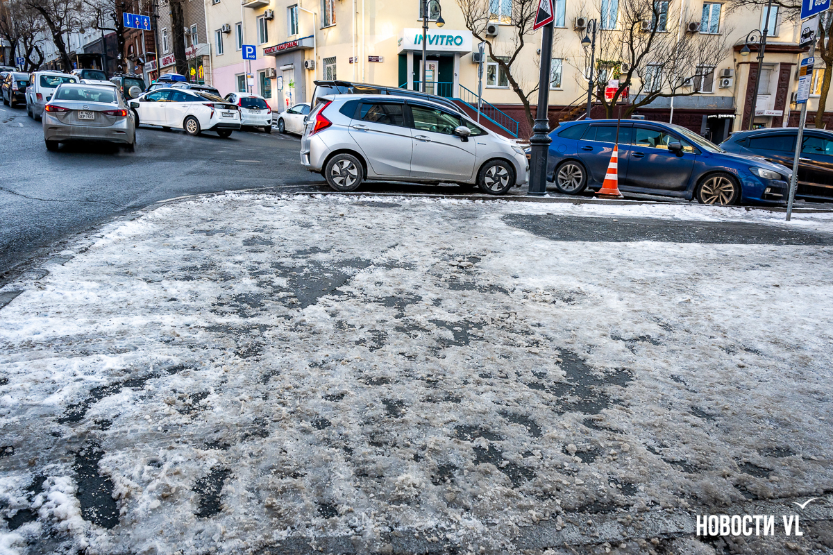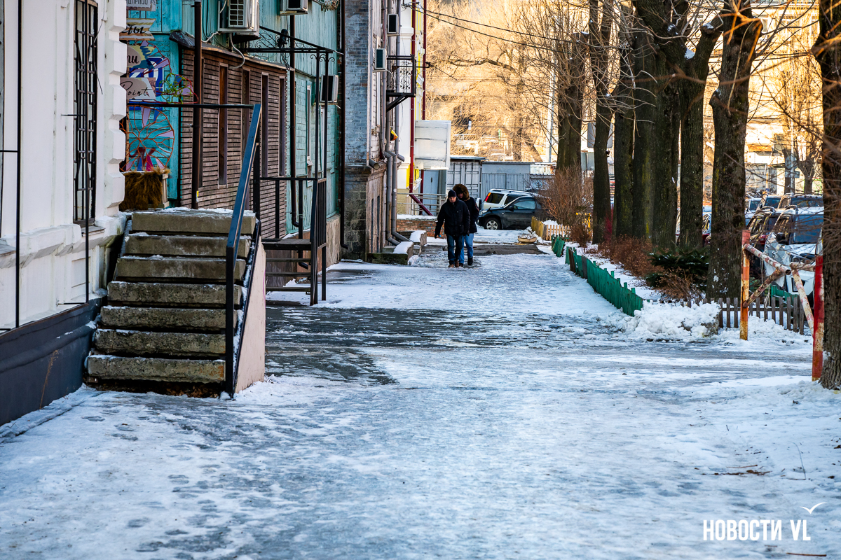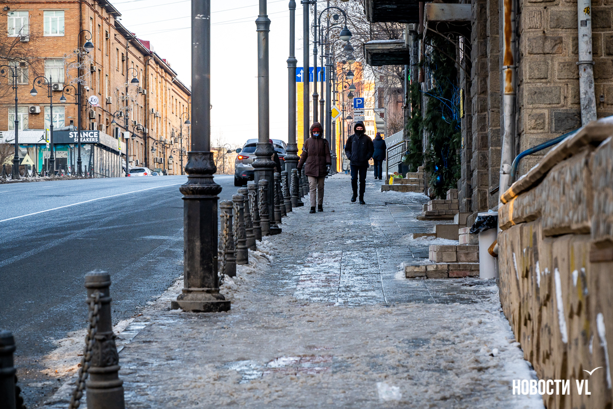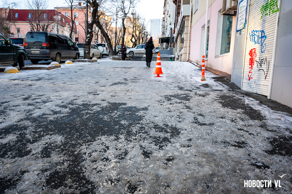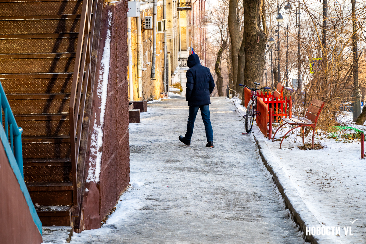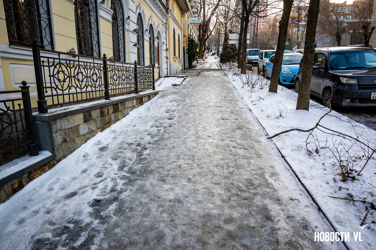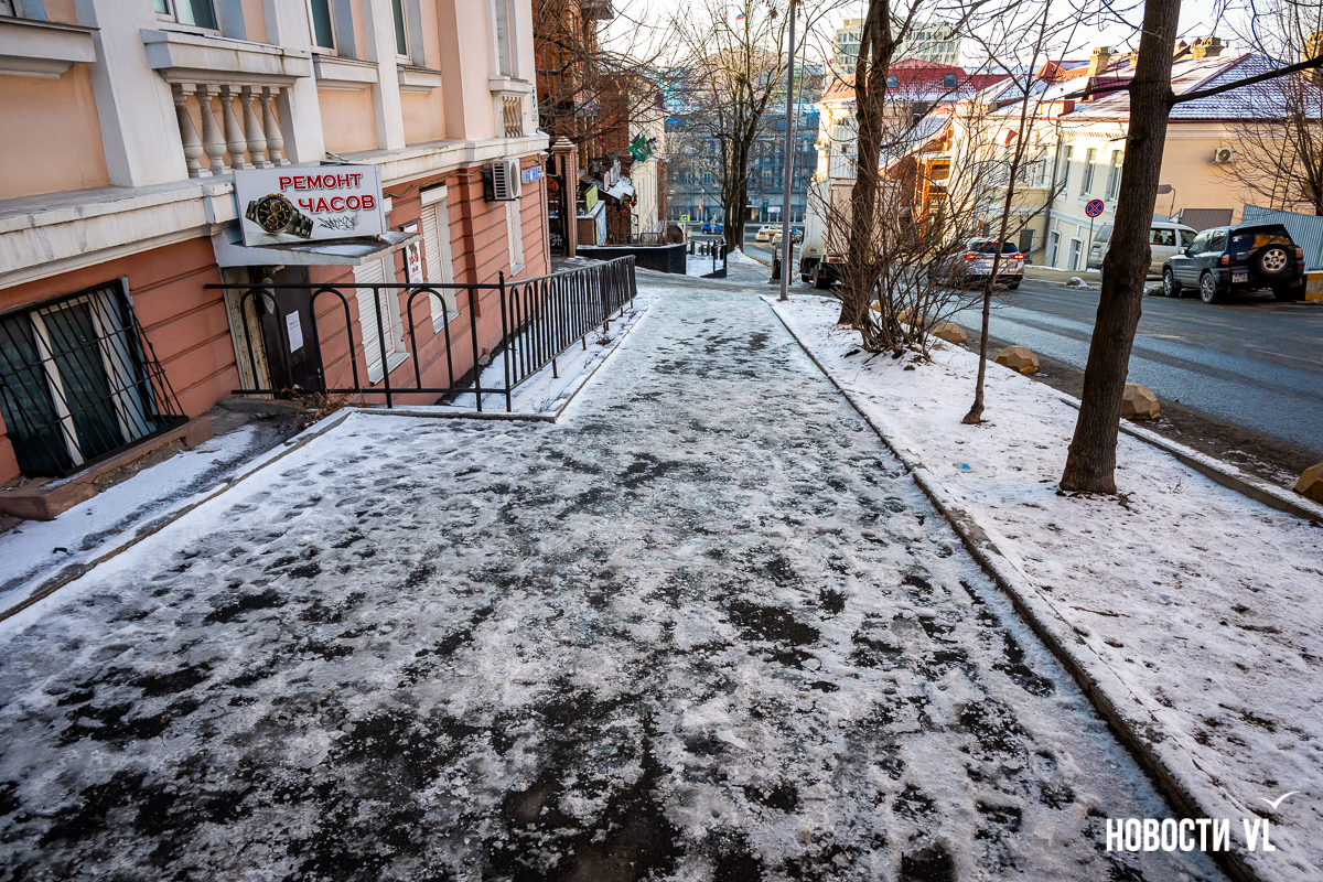Владивосток всё ещё приходит в себя после снега с дождём, выпавшего два дня назад. Основные дороги были убраны оперативно, а вот тротуары – в толстой корке льда, при этом на многих участках нет даже песка. Плохую подготовку к непогоде показали не только муниципальные службы, но и управляющие компании и юрлица. Тех, кто оперативно не убрал снег и лёд, будут штрафовать, причём комиссии уже работают. Как рассказали Новостям VL в одной из УК, по процедуре – есть время на устранение нарушения, а штраф можно оспорить. Если же это не произойдёт, то платить компания будет из своей прибыли – брать деньги из средств дома запрещено.