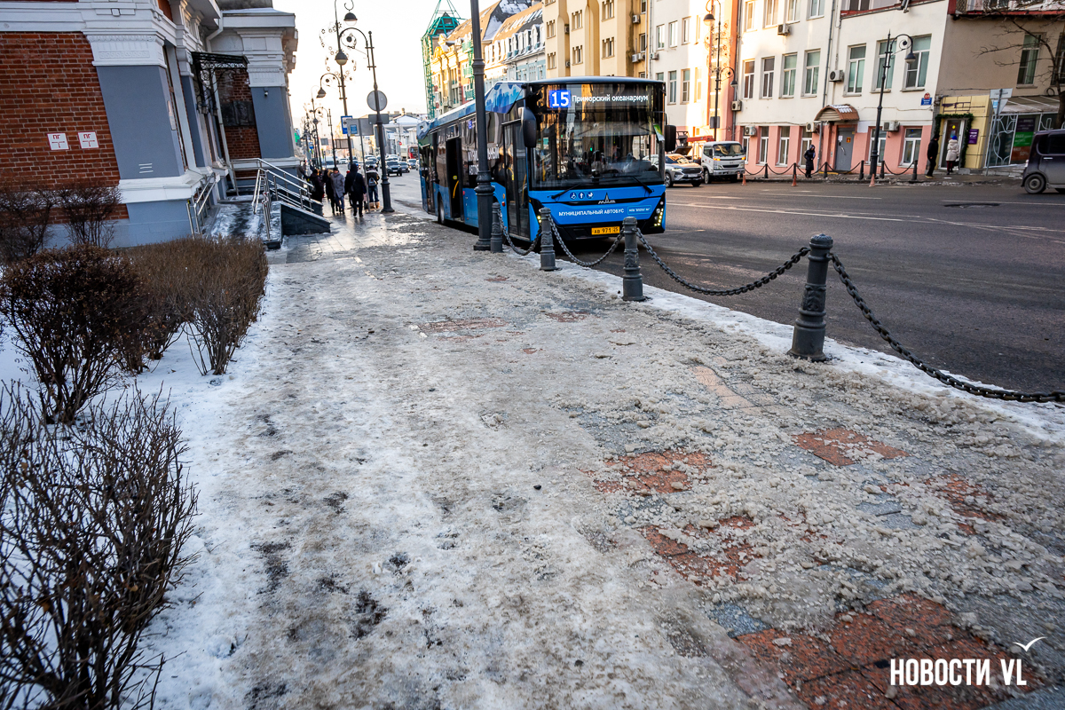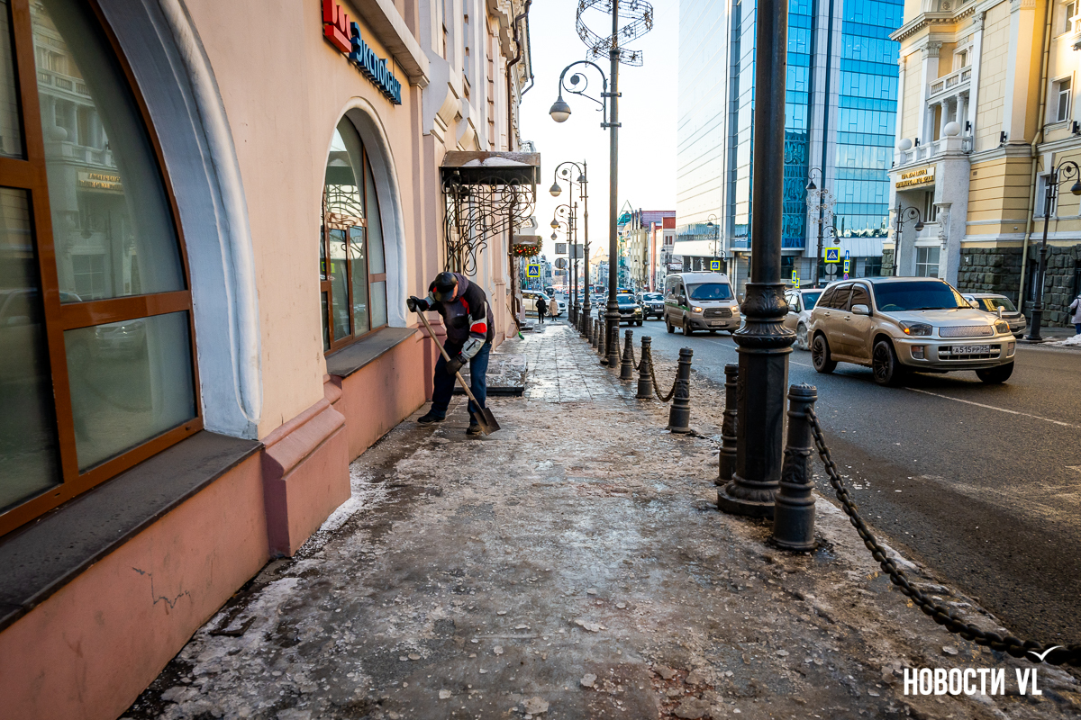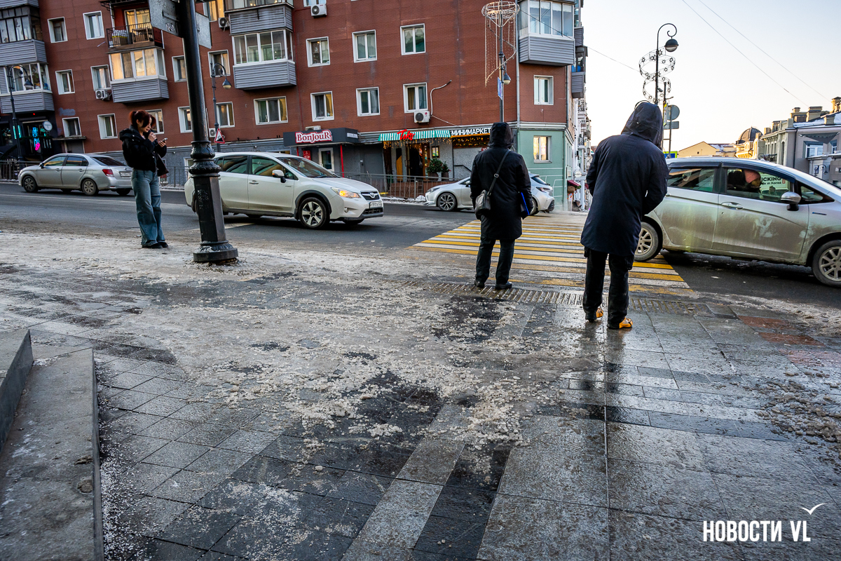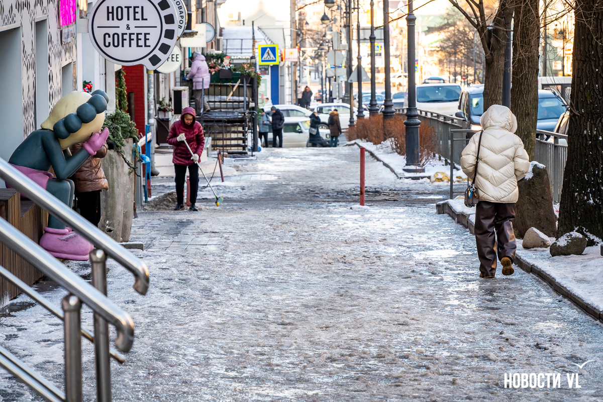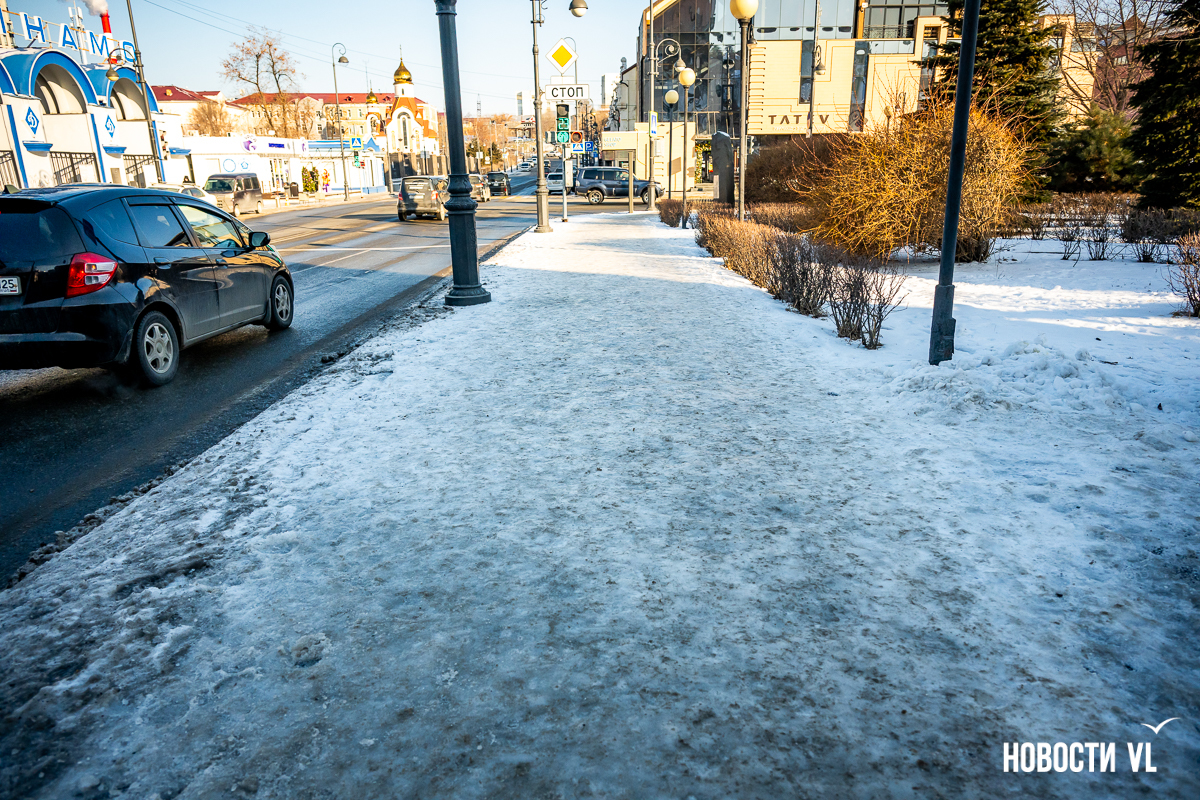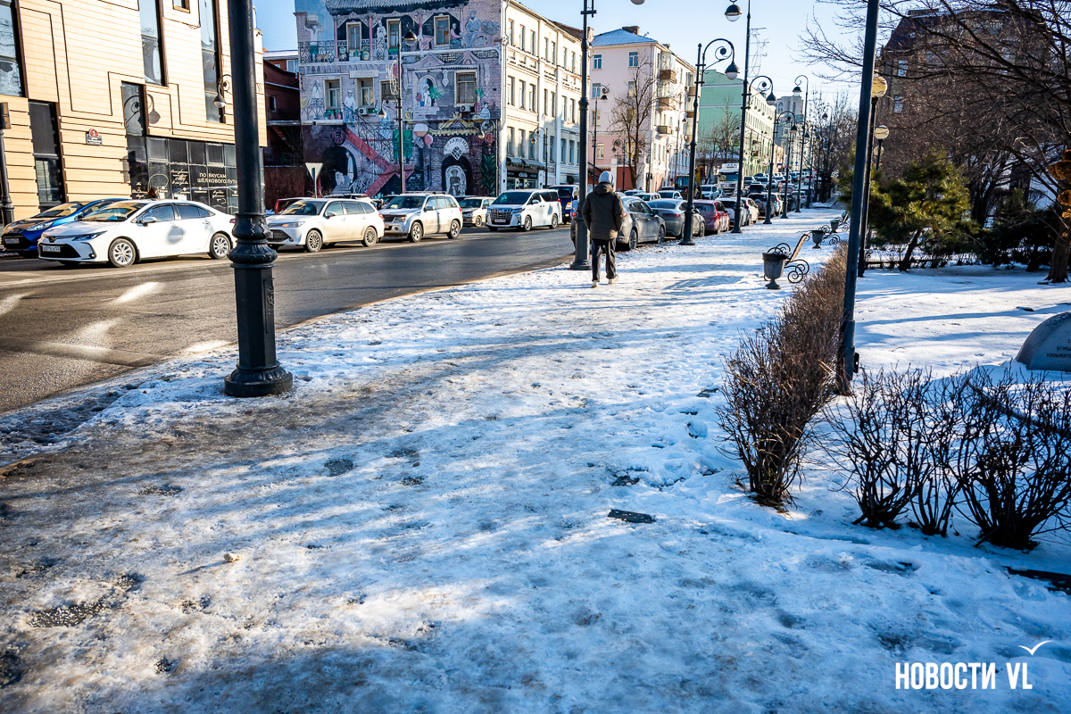 Владивосток всё ещё приходит в себя после снега с дождём, выпавшего два дня назад. Основные дороги были убраны оперативно, а вот тротуары – в толстой корке льда, при этом на многих участках нет даже песка. Плохую подготовку к непогоде показали не только муниципальные службы, но и управляющие компании и юрлица. Тех, кто оперативно не убрал снег и лёд, будут штрафовать, причём комиссии уже работают. Как рассказали Новостям VL в одной из УК, по процедуре – есть время на устранение нарушения, а штраф можно оспорить. Если же это не произойдёт, то платить компания будет из своей прибыли – брать деньги из средств дома запрещено.