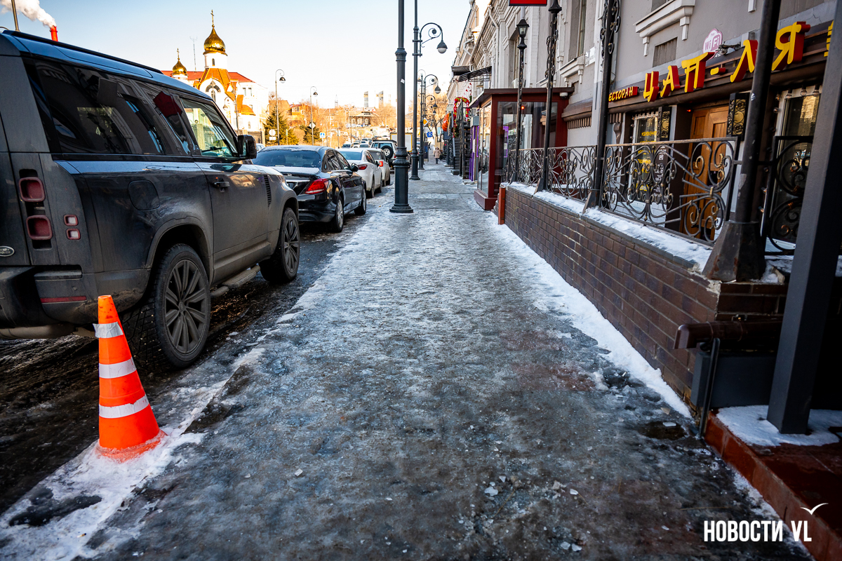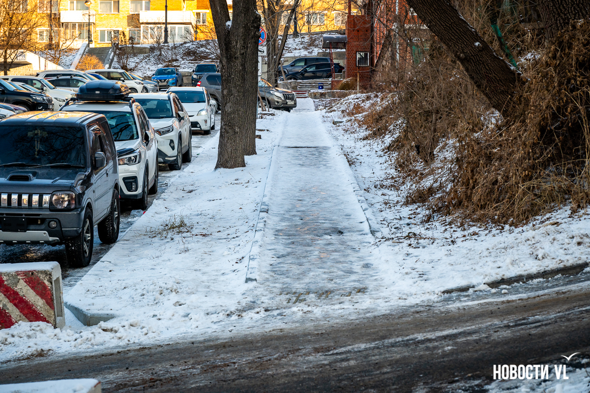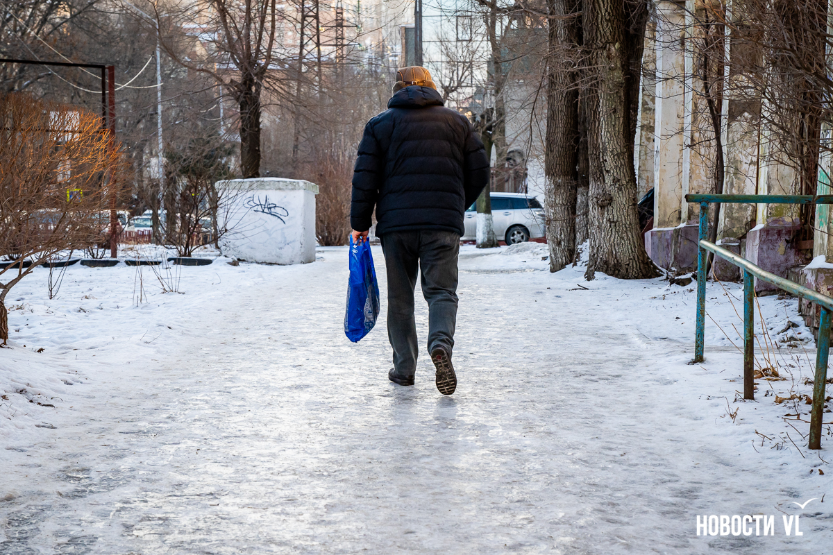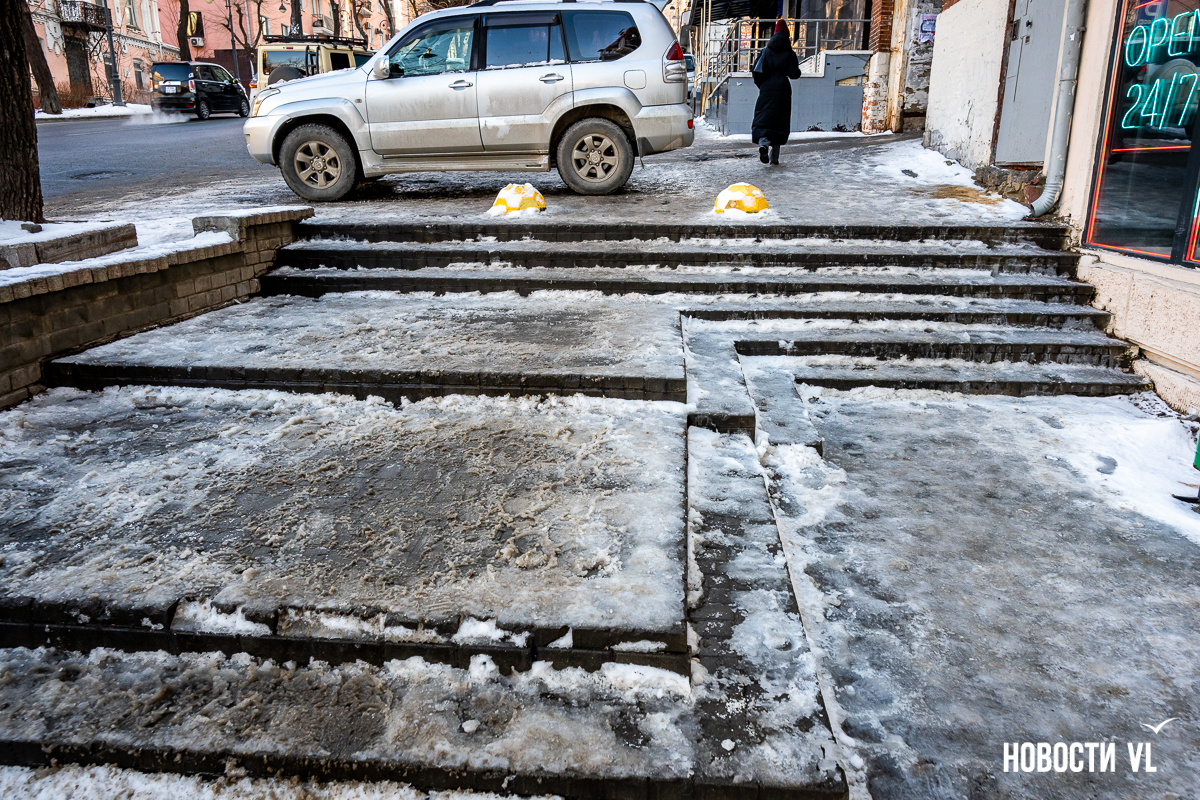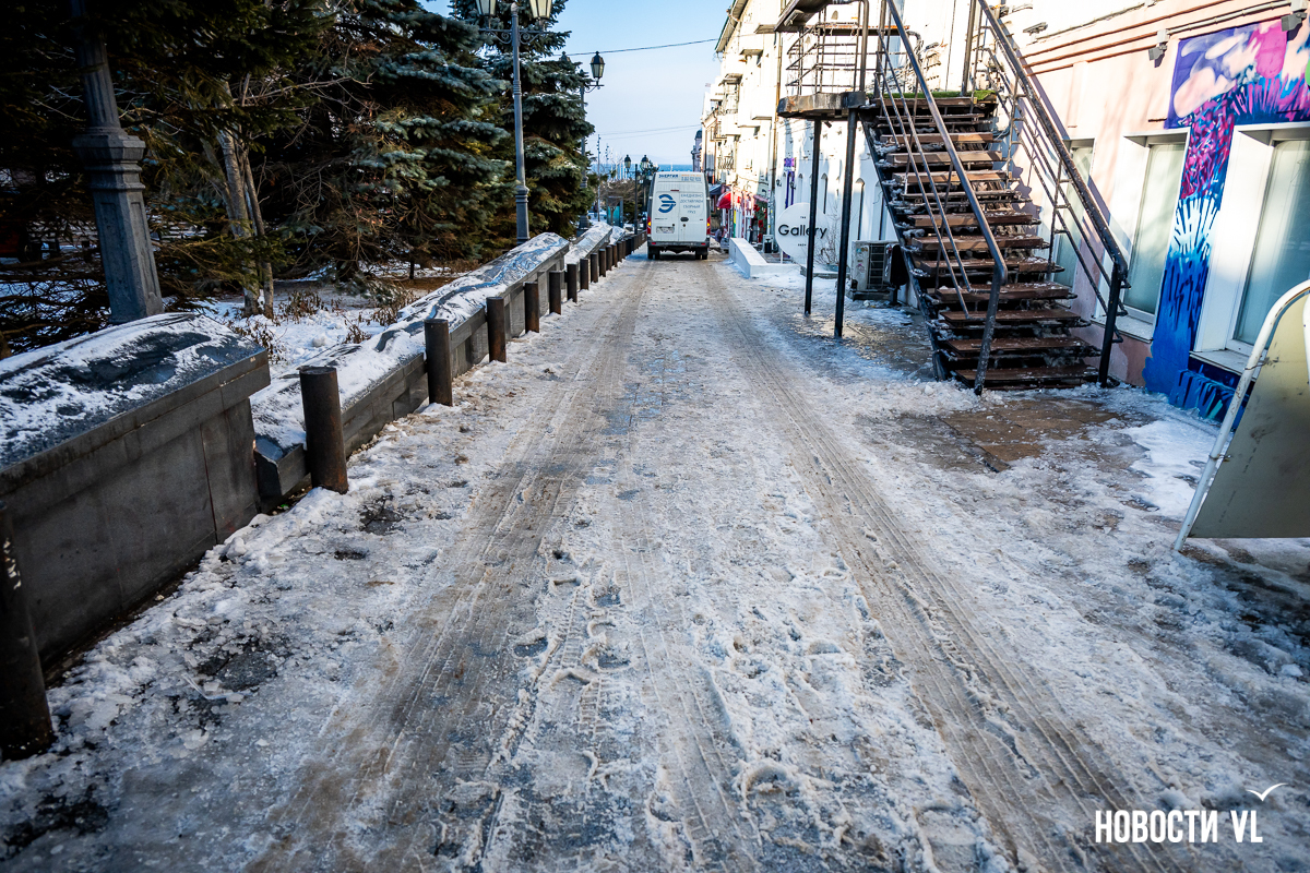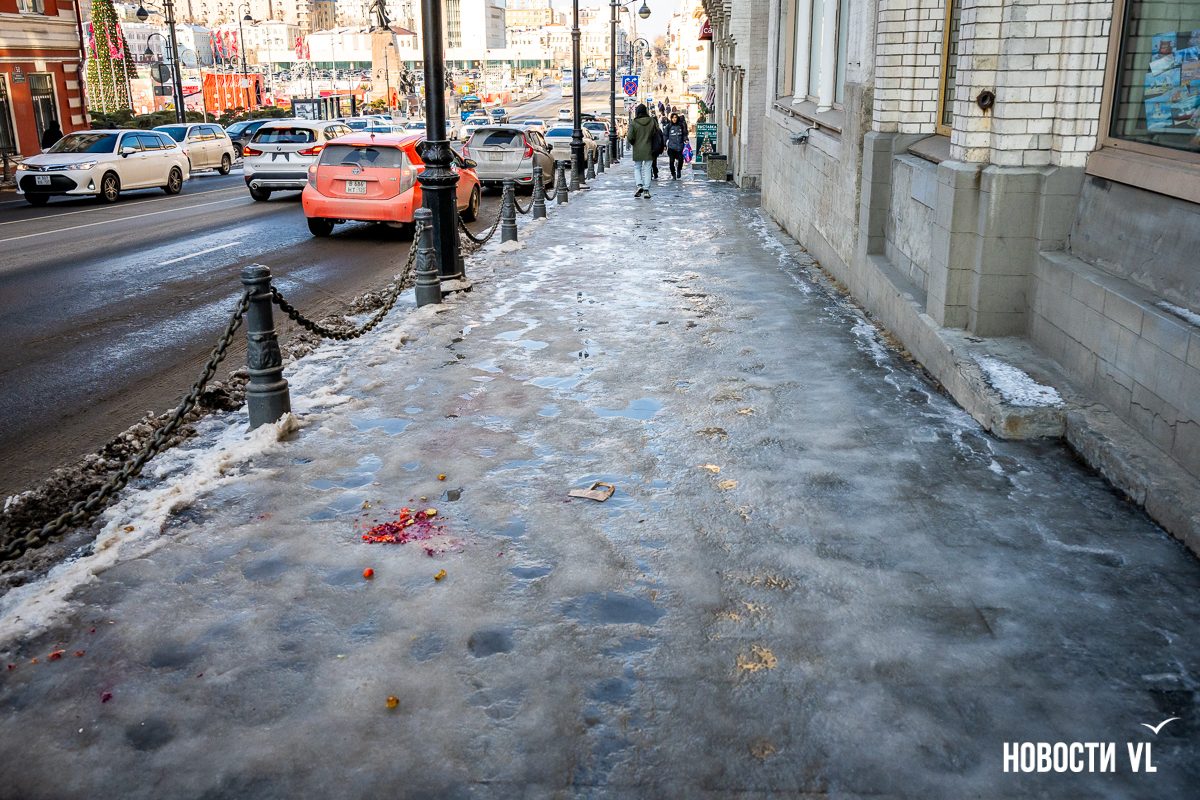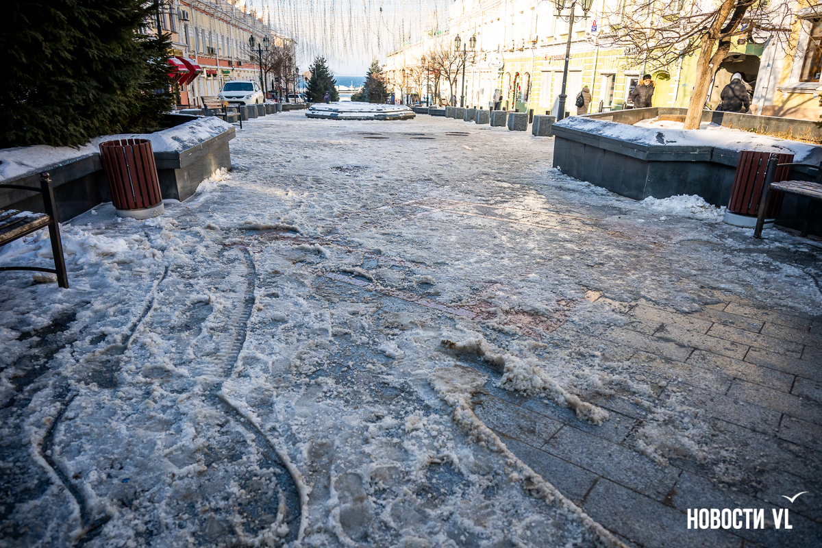 Владивосток всё ещё приходит в себя после снега с дождём, выпавшего два дня назад. Основные дороги были убраны оперативно, а вот тротуары – в толстой корке льда, при этом на многих участках нет даже песка. Плохую подготовку к непогоде показали не только муниципальные службы, но и управляющие компании и юрлица. Тех, кто оперативно не убрал снег и лёд, будут штрафовать, причём комиссии уже работают. Как рассказали Новостям VL в одной из УК, по процедуре – есть время на устранение нарушения, а штраф можно оспорить. Если же это не произойдёт, то платить компания будет из своей прибыли – брать деньги из средств дома запрещено.