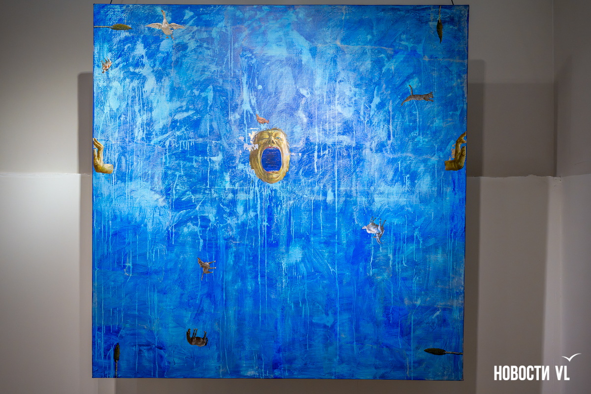 Кроме ярмарки, есть небольшая выставка с работами заслуженного художника России Евгения Макеева. Одна явно выбивается – наверное, её можно условно отнести к чёрному юмору: часть картины нарисована вверх тормашками. И здесь работа сына, Нована, тоже художника.