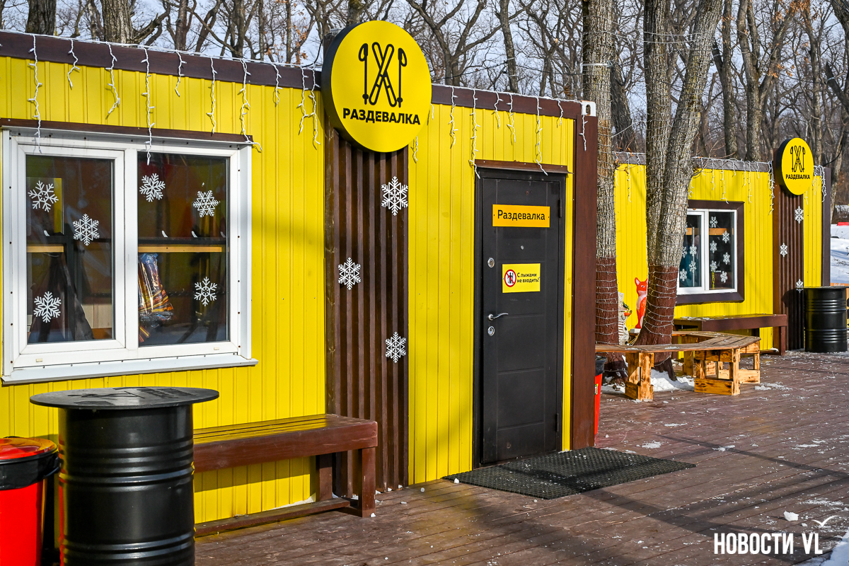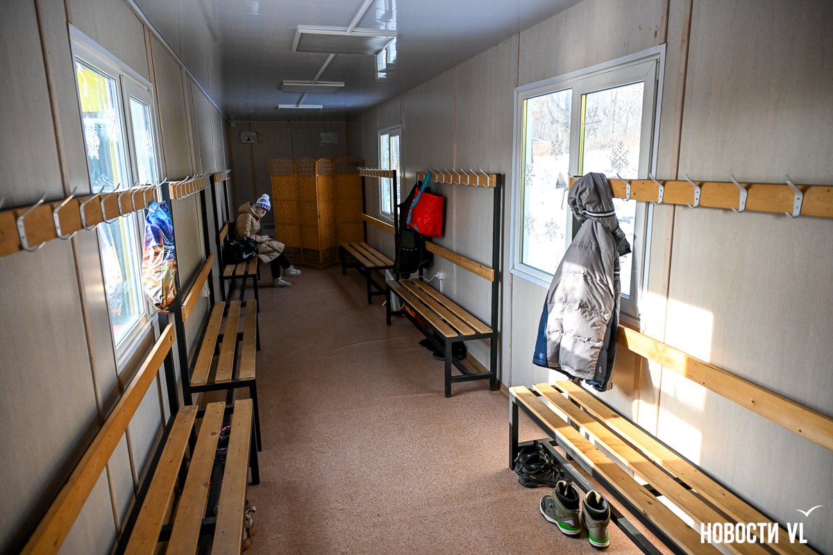 Раздевалки находятся справа от входа, их две. Есть ещё третья, её открывают, когда людей больше, чем обычно. Также в этом году впервые построили отдельную раздевалку для профессиональных лыжников. Она находится выше по склону, подальше от входа, чтобы никто никому не мешал.