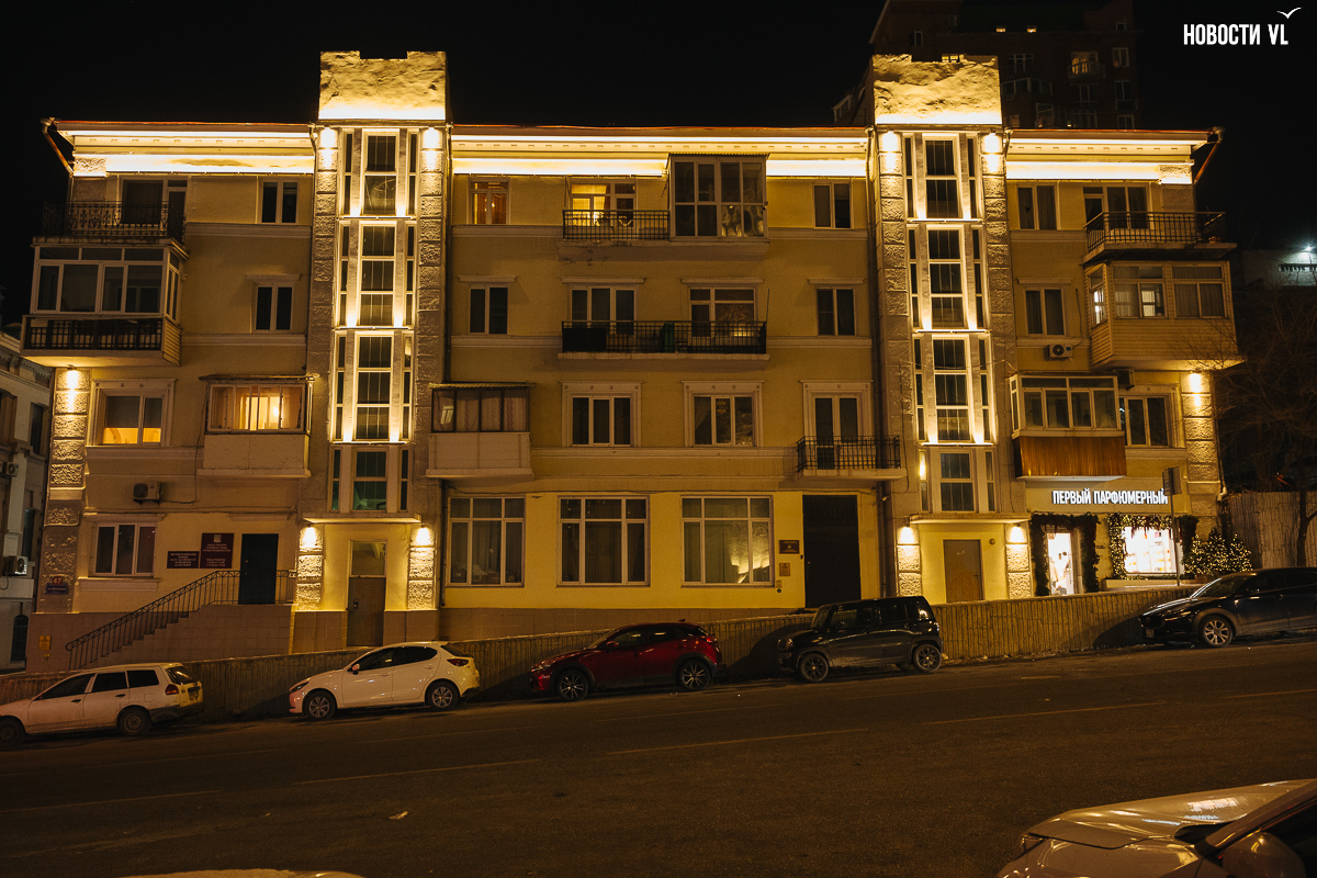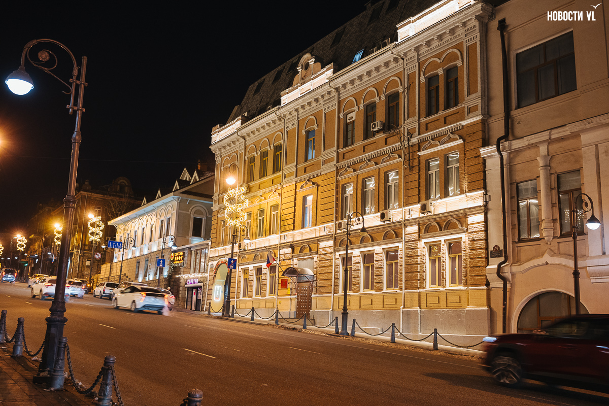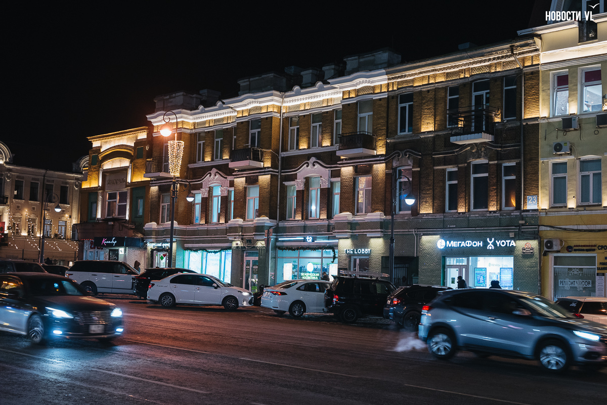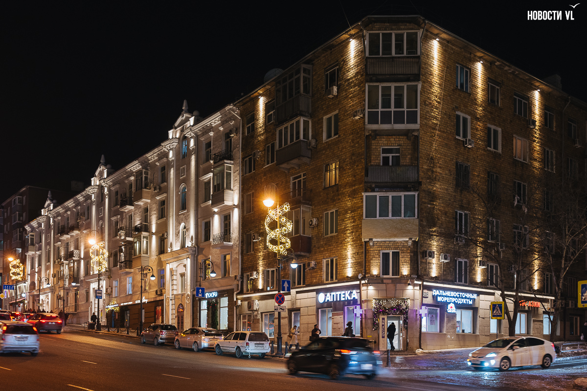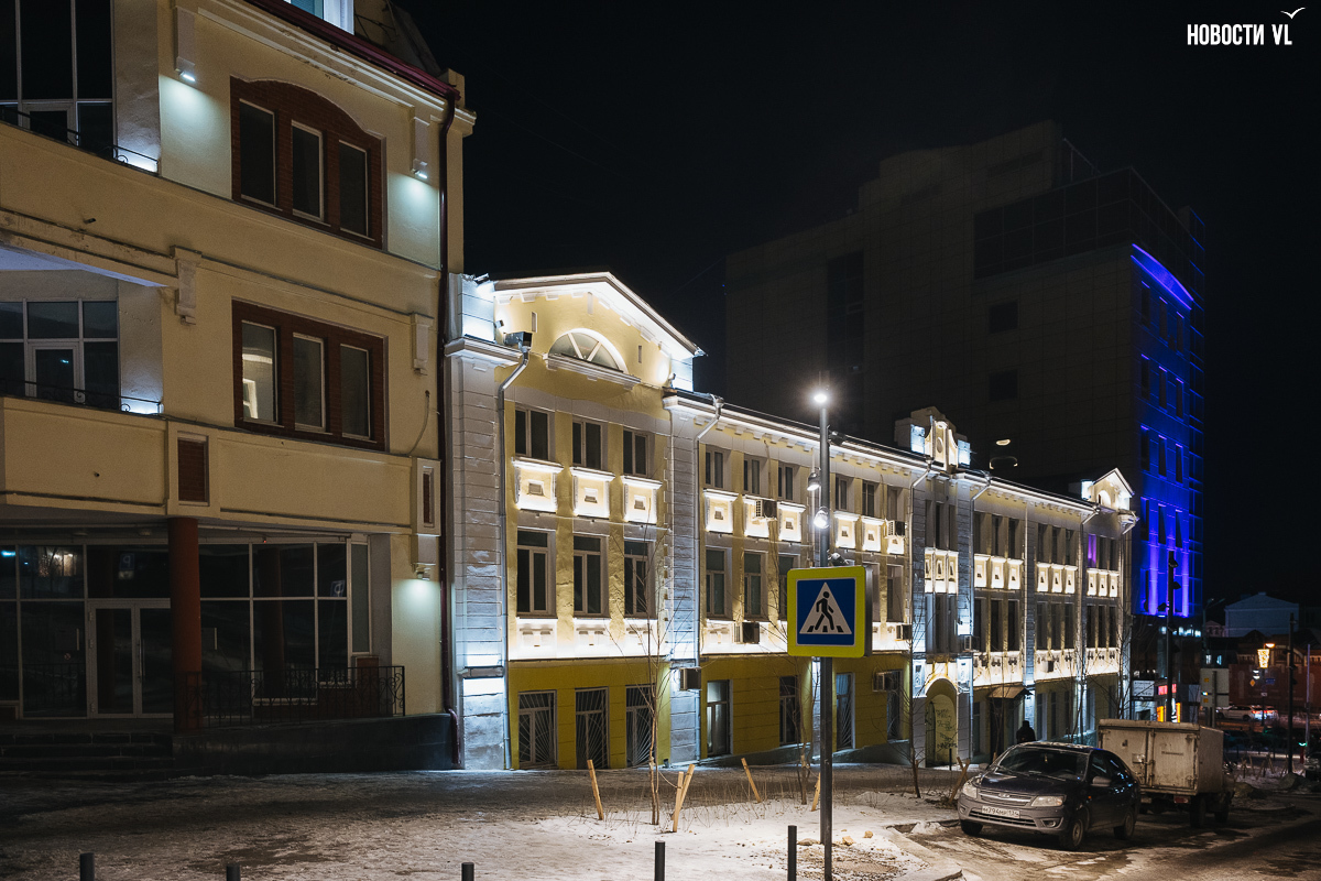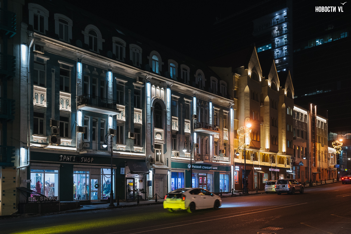 Дополнительную подсветку получило здание администрации Владивостока (Океанский проспект, 20), так называемый Серый дом. Почти на пересечении с Фонтанной светильники появились на жилой сталинке, бывшем доме сотрудников облсвязи (Фонтанная,47). Красиво теперь смотрится и здание выше, гостиница «Сибирское подворье» (Океанский проспект, 26) – как и сейчас, заведение с таким названием здесь размещалось и в начале XX века.