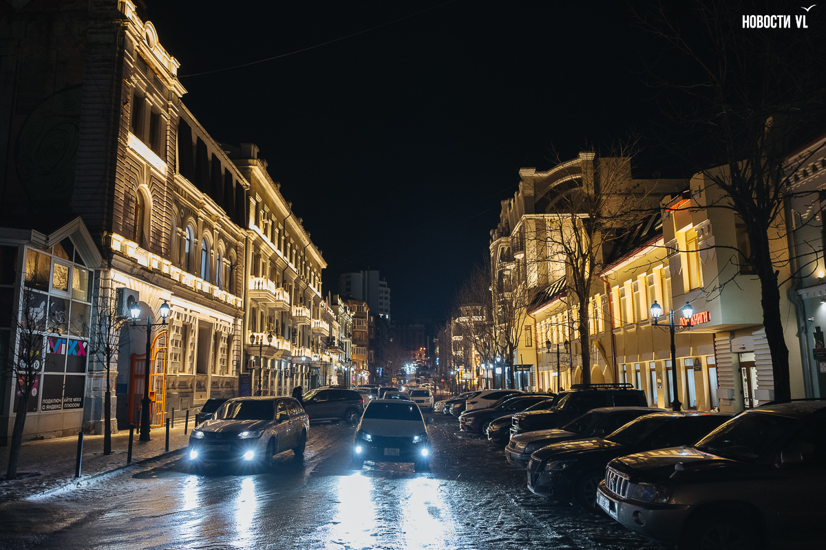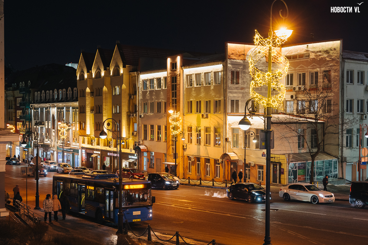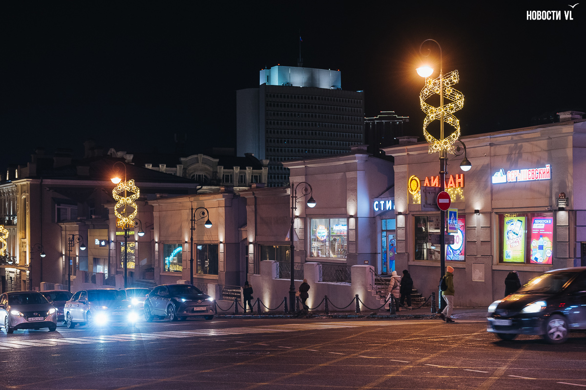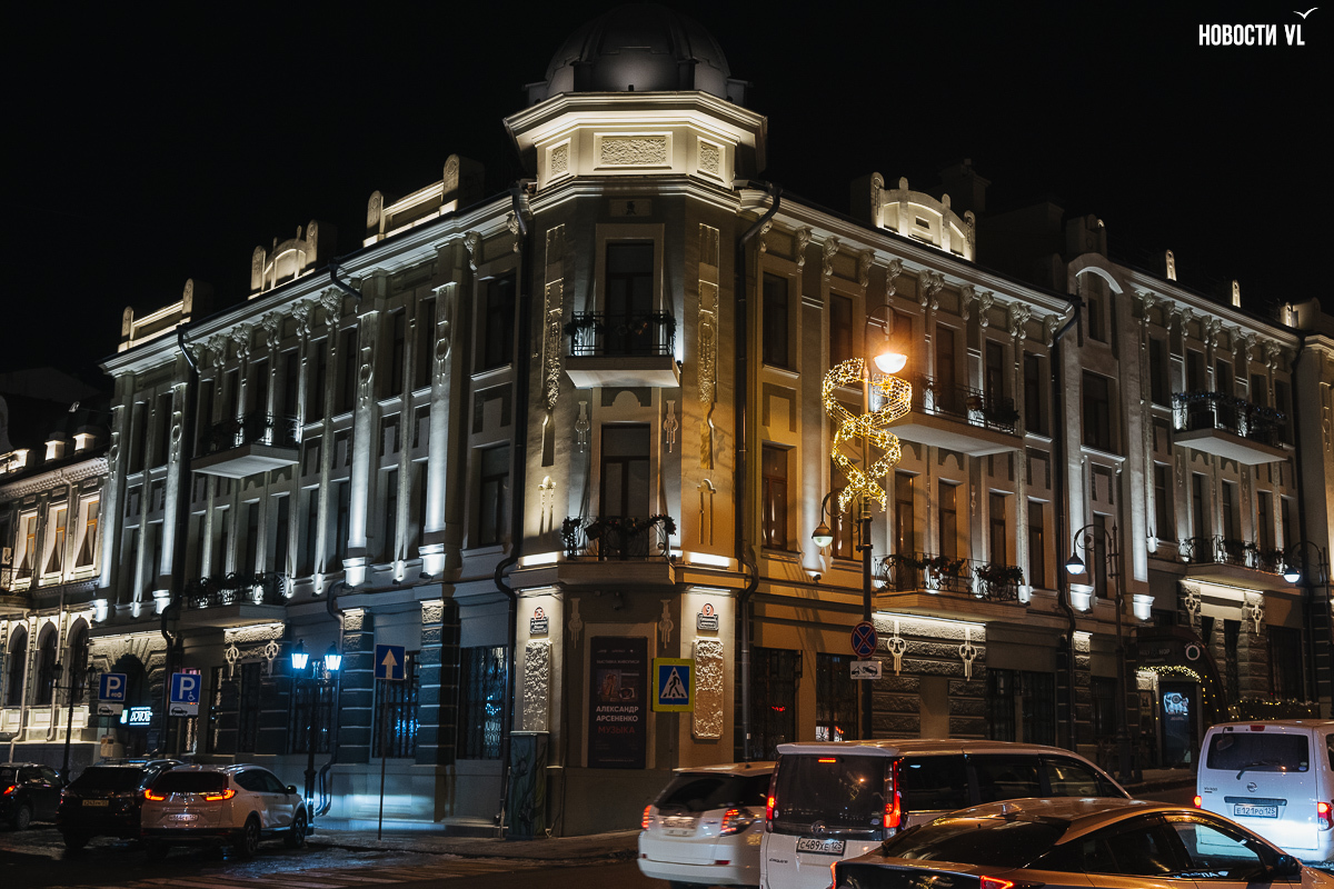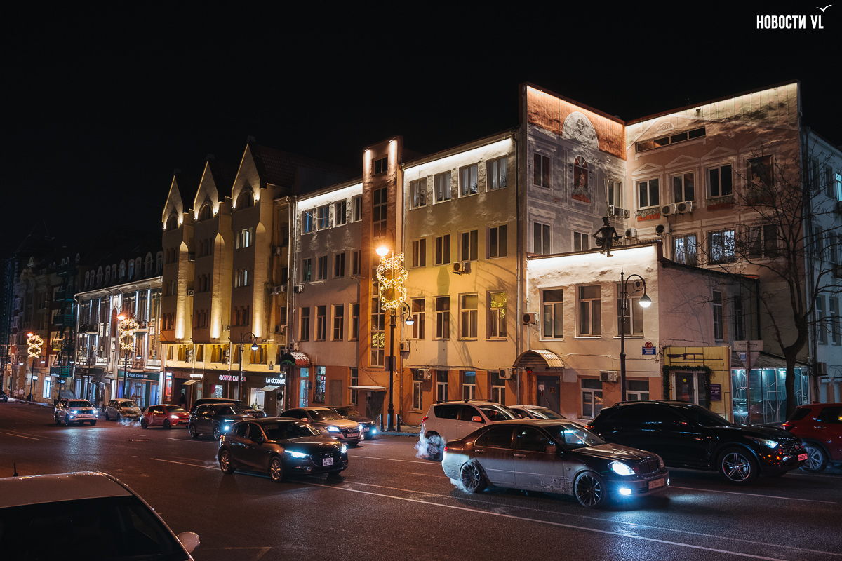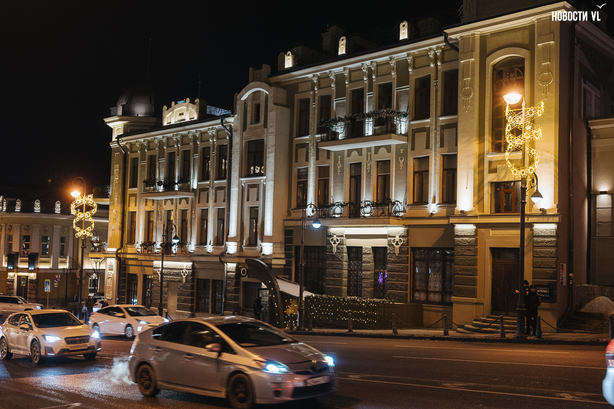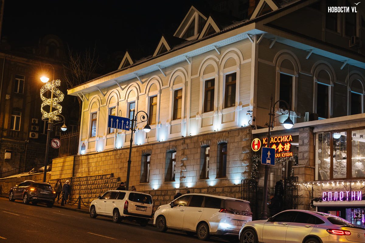 Дополнительную подсветку получило здание администрации Владивостока (Океанский проспект, 20), так называемый Серый дом. Почти на пересечении с Фонтанной светильники появились на жилой сталинке, бывшем доме сотрудников облсвязи (Фонтанная,47). Красиво теперь смотрится и здание выше, гостиница «Сибирское подворье» (Океанский проспект, 26) – как и сейчас, заведение с таким названием здесь размещалось и в начале XX века.