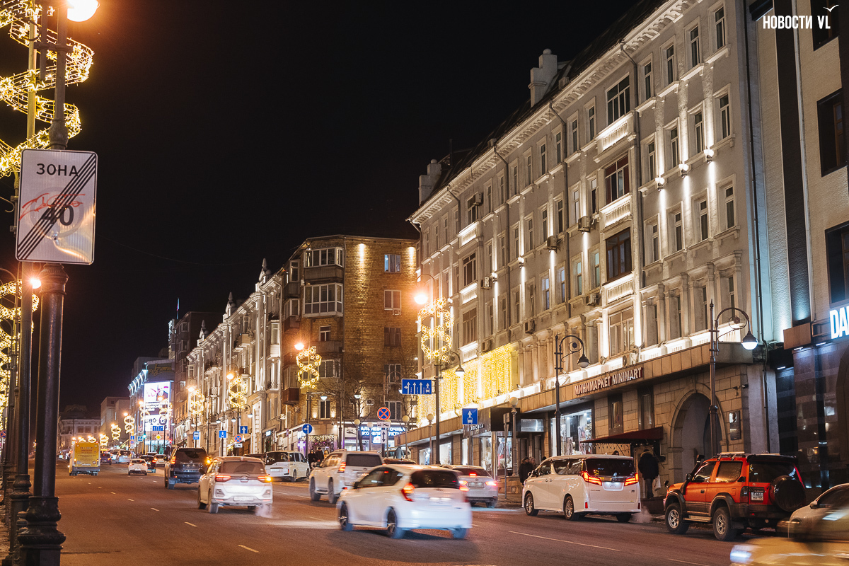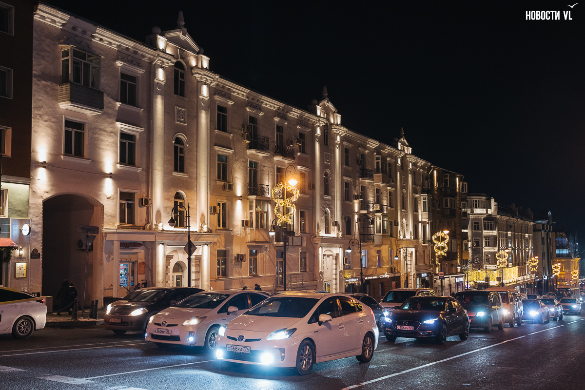 Большая часть светового оборудования установлена на Океанском проспекте – это 9 домов в его начале, от пересечения со Светланской до Пологой, как по левой, так и по правой стороне.