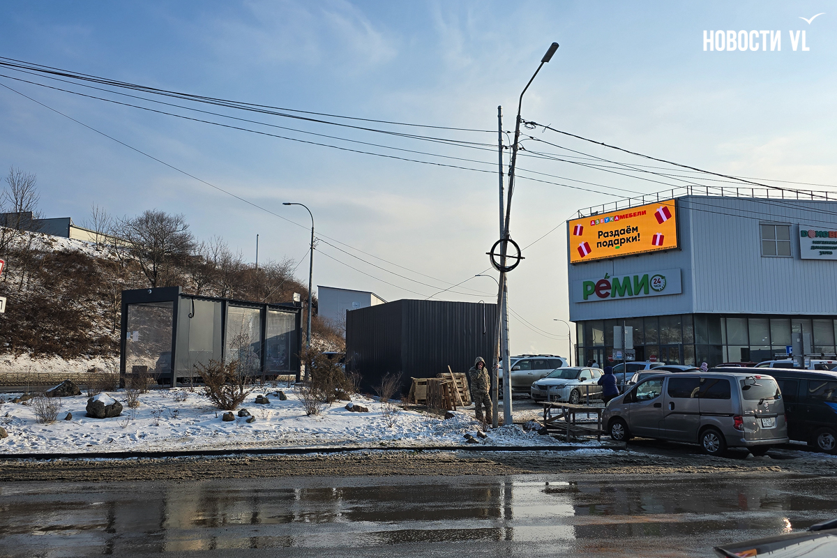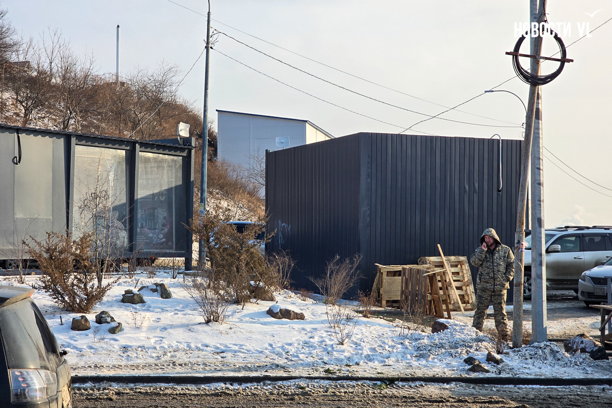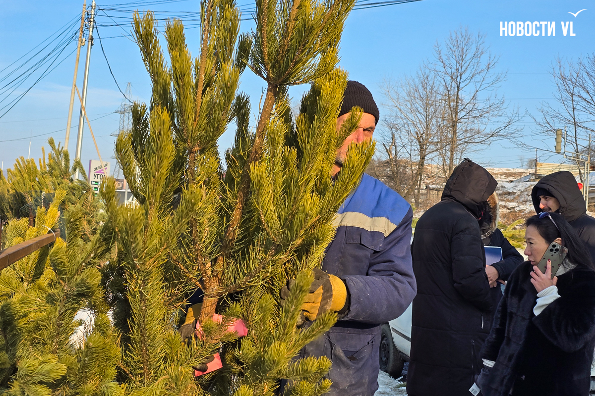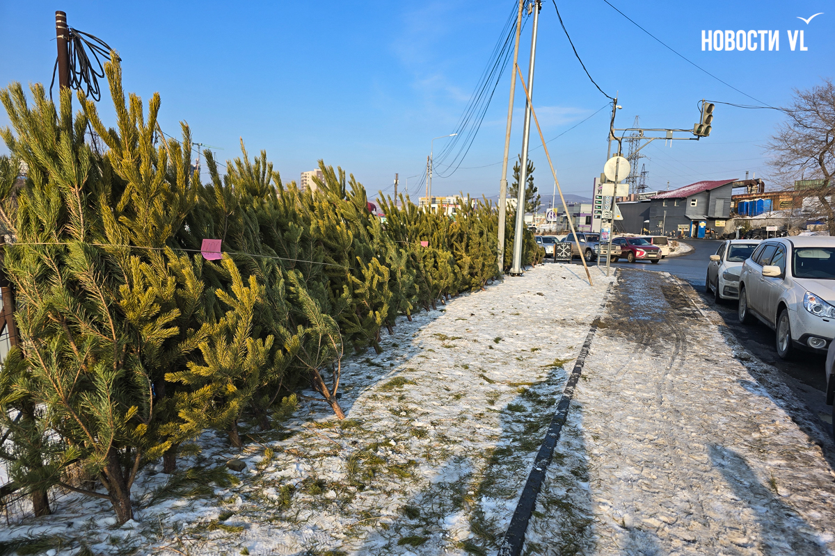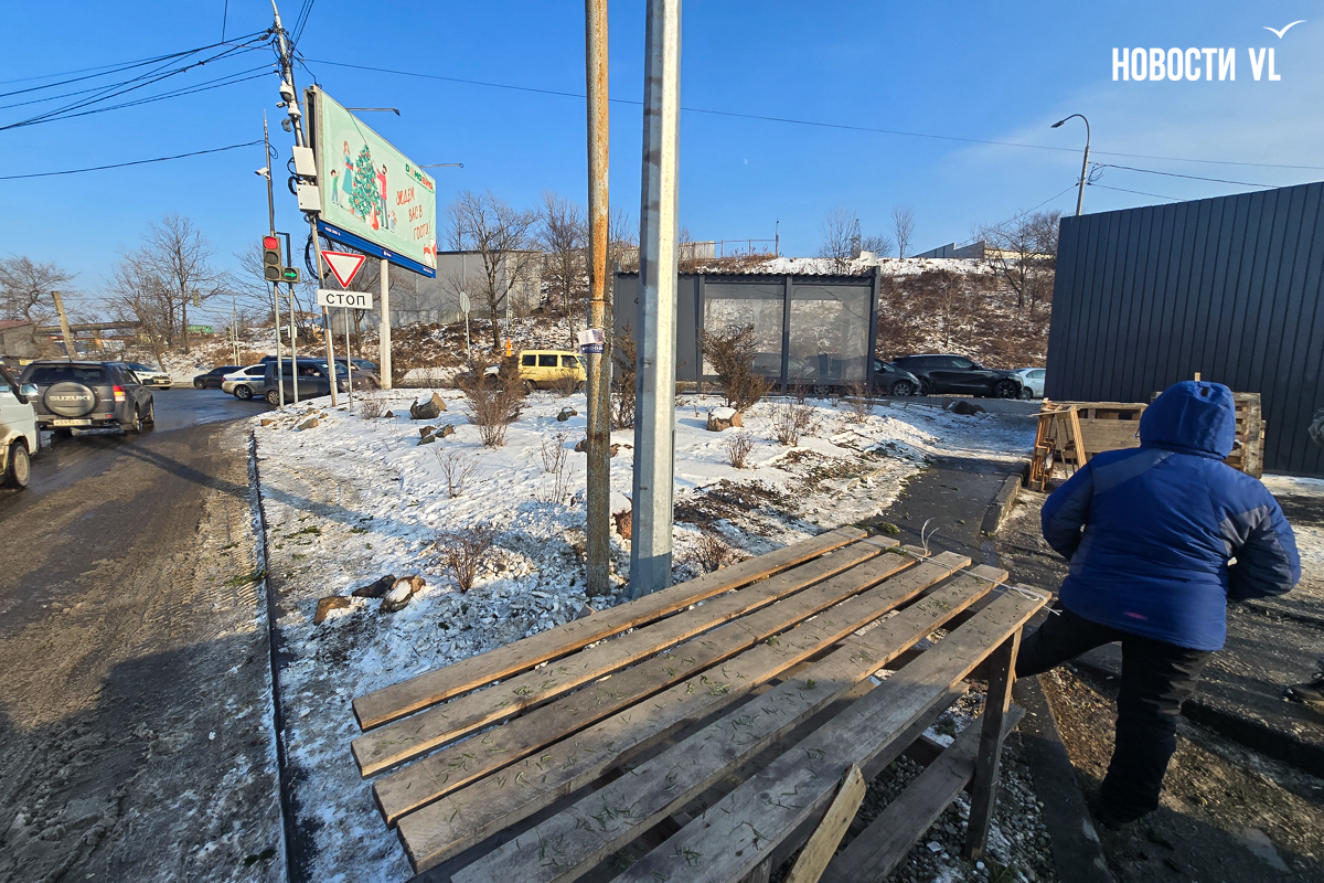 Но базар вдоль тротуара появился снова. А вместе с ним торговля развернулась за остановкой «ТЦ «Ладыгина». Белокорые пихты, напиленные на севере Приморья, разложили прямо на клубе, которую горожане разбили этим летом за свой счёт. Она обошлась в 500 тысяч рублей. Там, где летом высаживали молодые деревья, сейчас накидали палеты, на которые складируют букеты из веток. Из досок сколотили опору для товара и воткнули её в бортик из гальки.