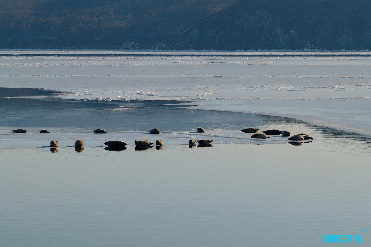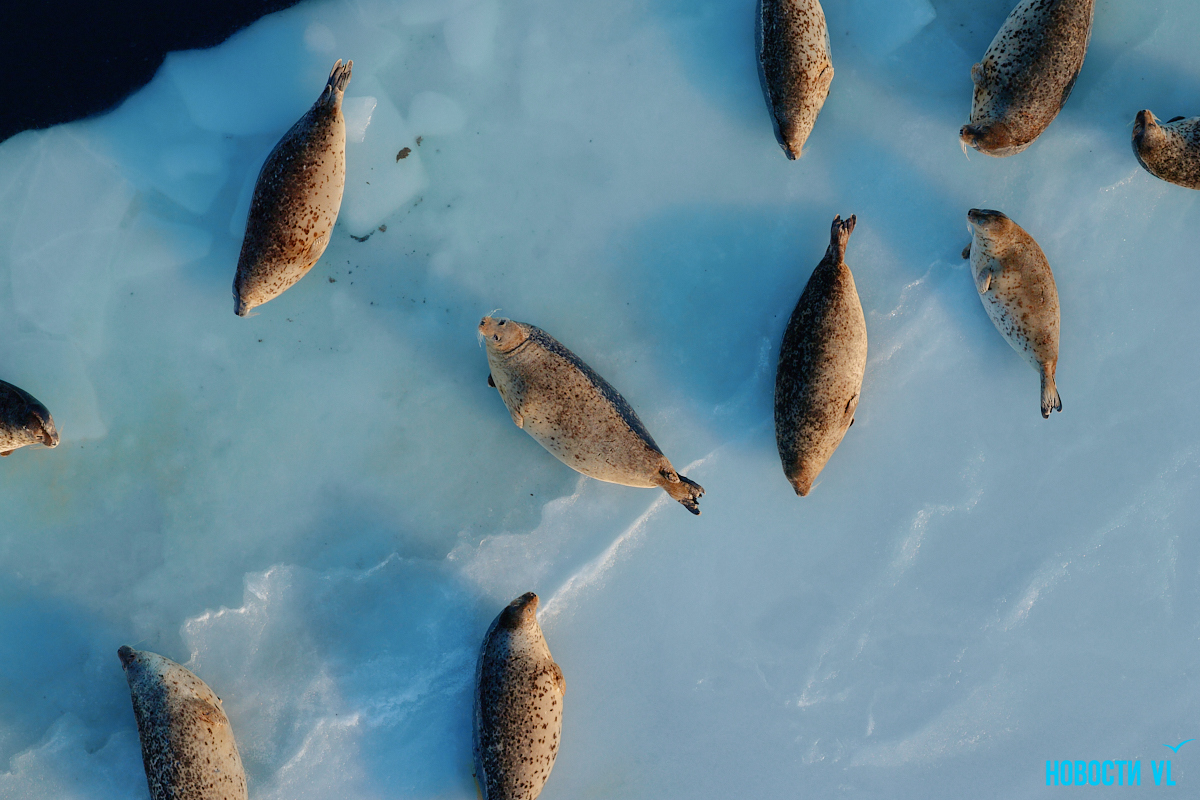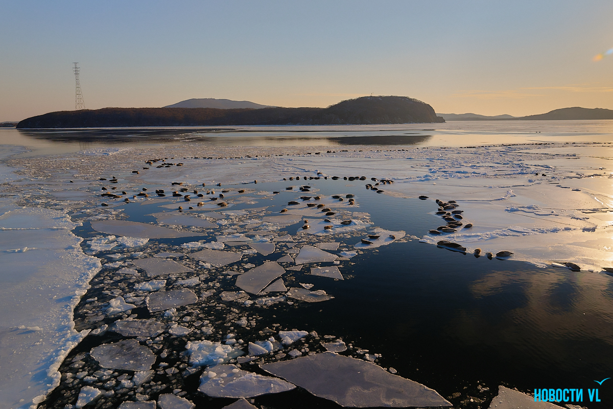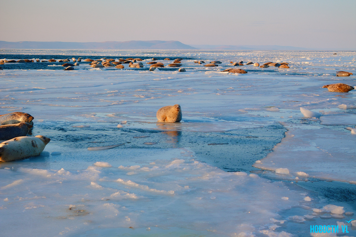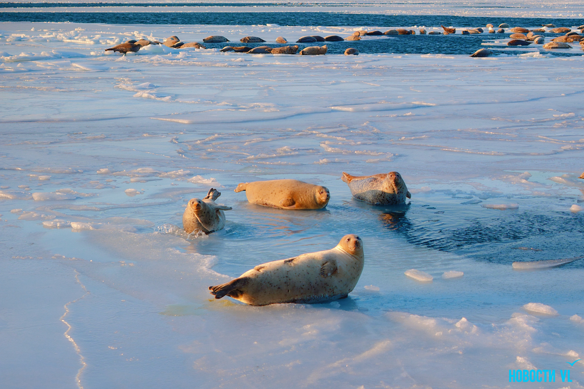 В воскресенье, 4 января, фотограф Новостей VL обнаружил у Токаревского маяка множество отдыхающих на льду ларг. Взрослые нерпы вместе детёнышами расположились на ледовом поле вдоль береговой линии. У каждой ларги здесь своё место – чем выше её авторитет животного, тем ближе она находится к воде. Нерпы скользят по льдинам и вальяжно греются под лучами зимнего солнца.