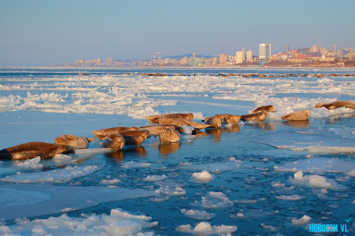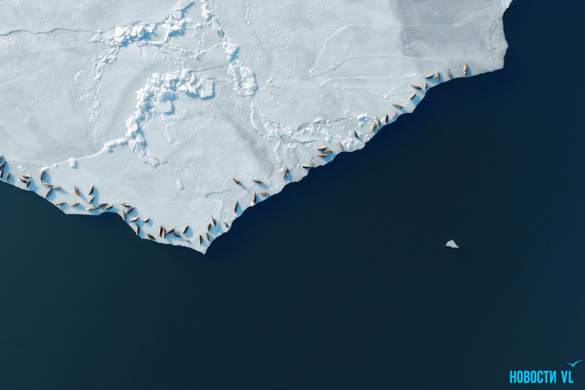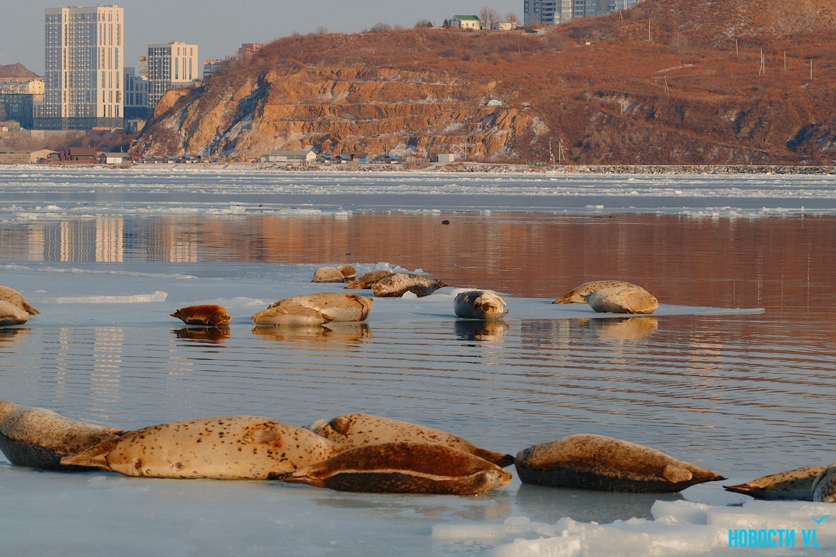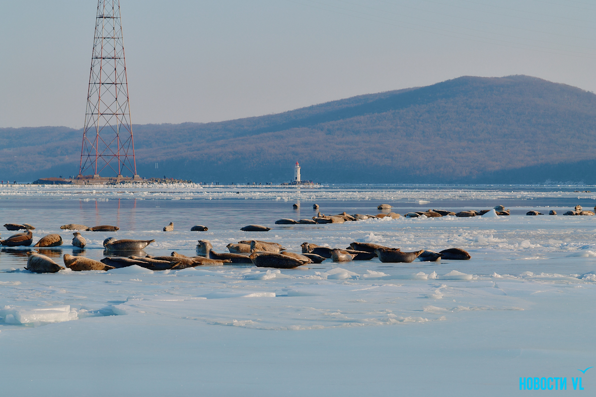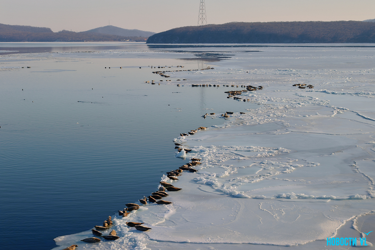В воскресенье, 4 января, фотограф Новостей VL обнаружил у Токаревского маяка множество отдыхающих на льду ларг. Взрослые нерпы вместе детёнышами расположились на ледовом поле вдоль береговой линии. У каждой ларги здесь своё место – чем выше её авторитет животного, тем ближе она находится к воде. Нерпы скользят по льдинам и вальяжно греются под лучами зимнего солнца.