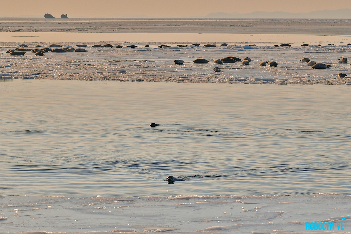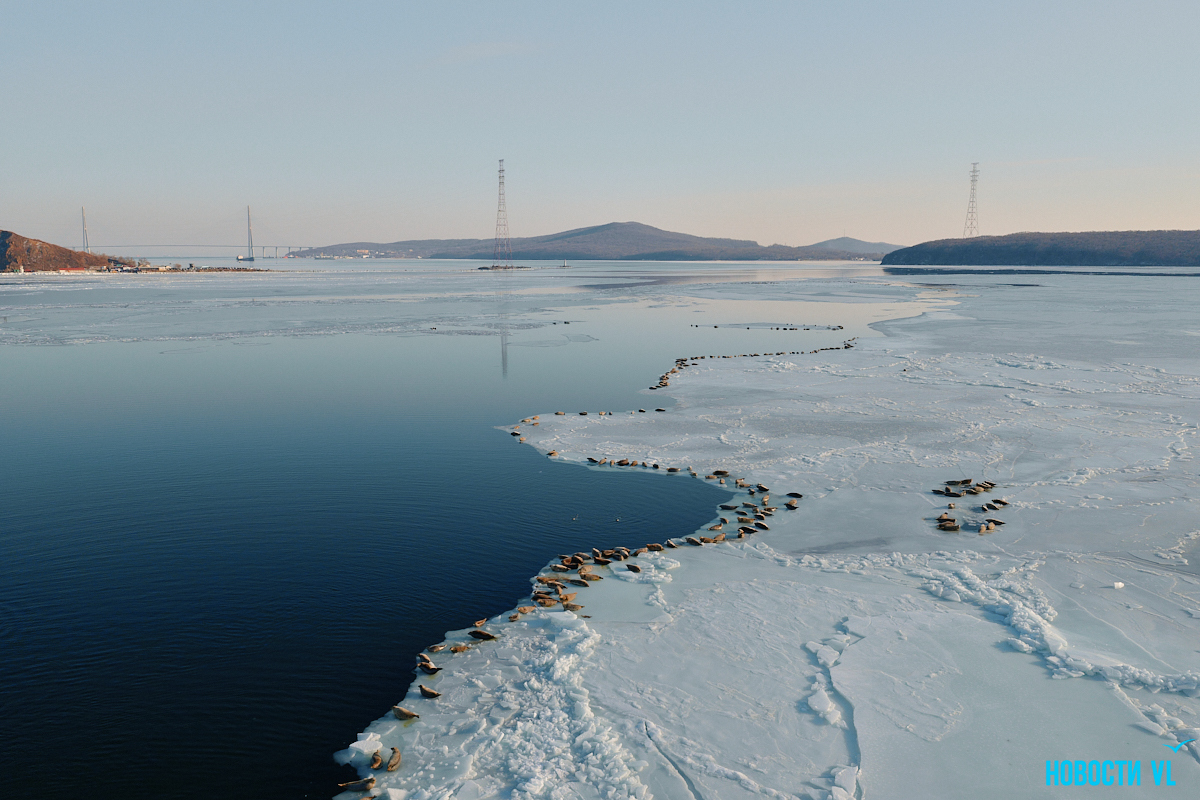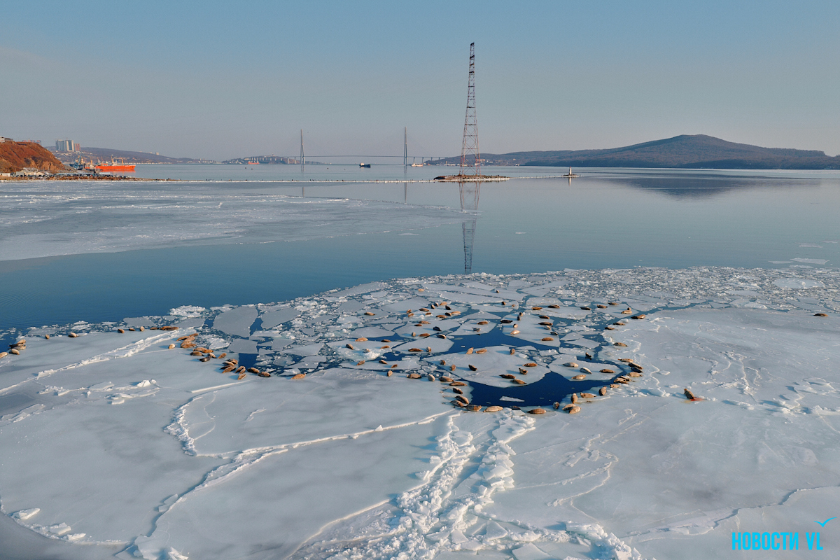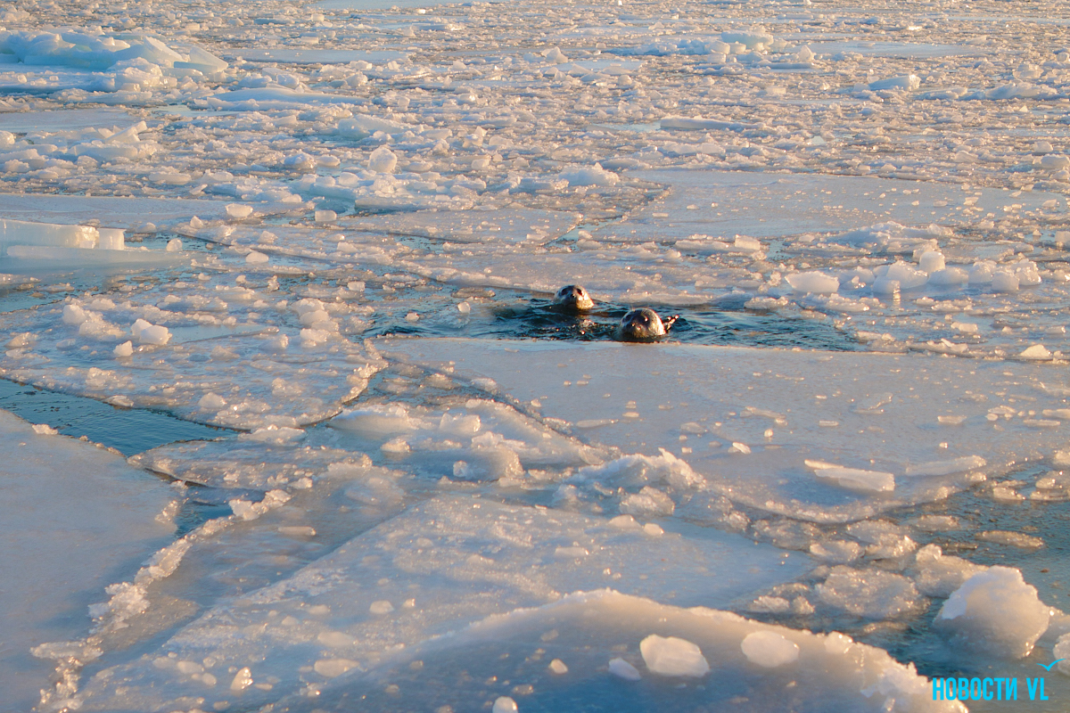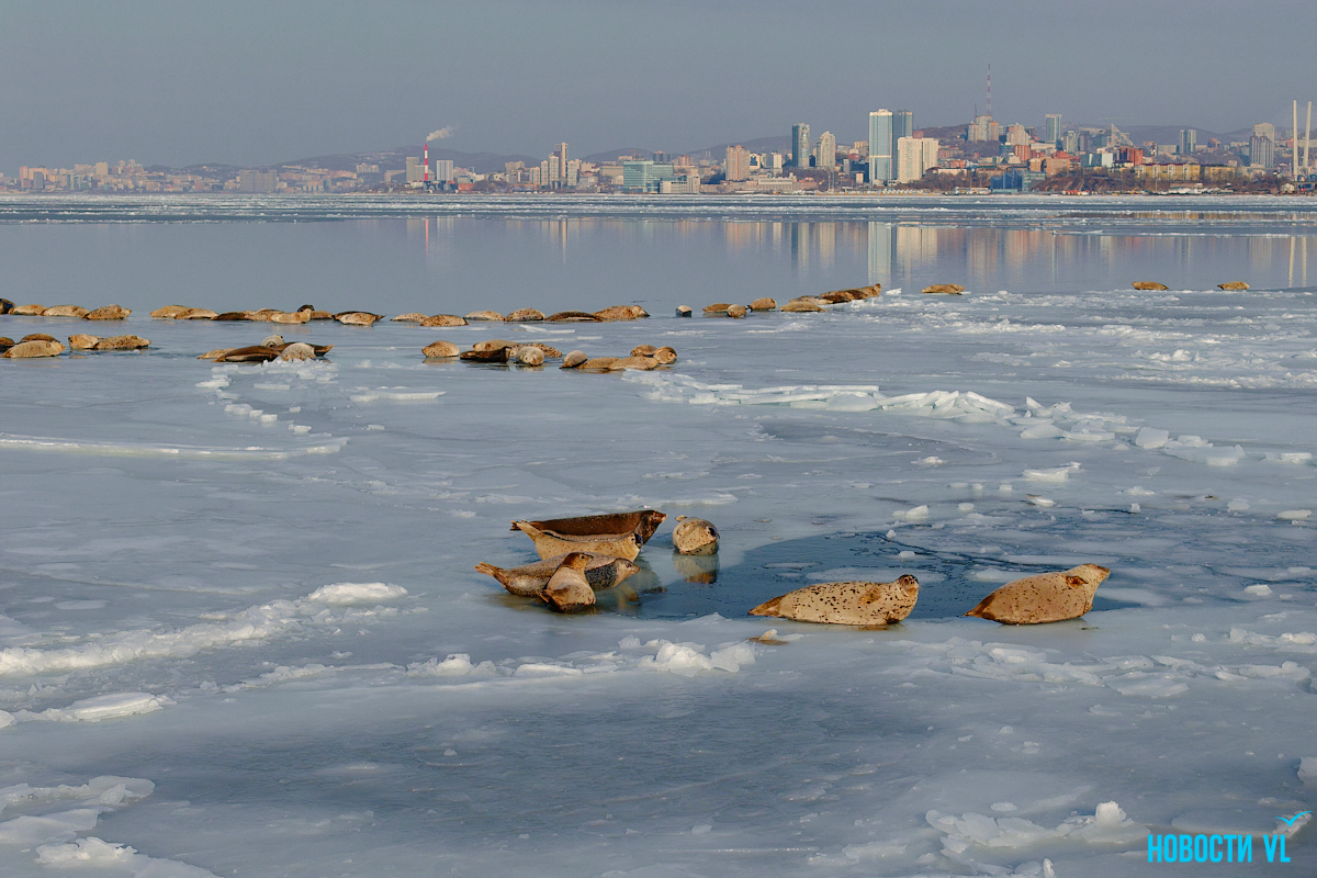 В воскресенье, 4 января, фотограф Новостей VL обнаружил у Токаревского маяка множество отдыхающих на льду ларг. Взрослые нерпы вместе детёнышами расположились на ледовом поле вдоль береговой линии. У каждой ларги здесь своё место – чем выше её авторитет животного, тем ближе она находится к воде. Нерпы скользят по льдинам и вальяжно греются под лучами зимнего солнца.