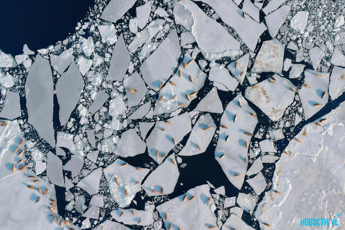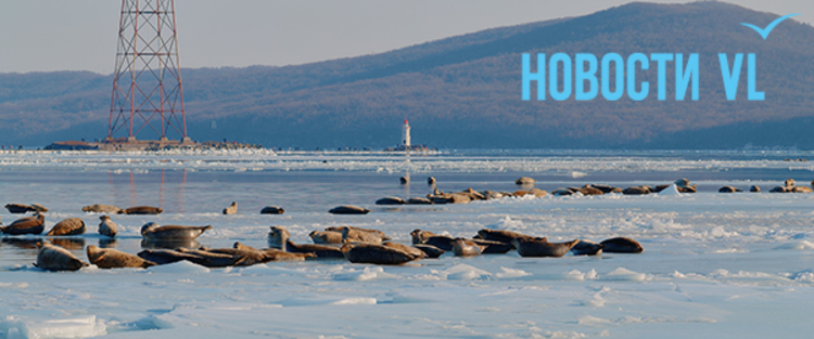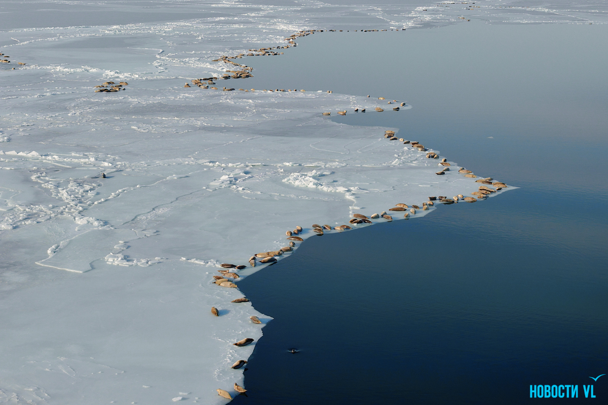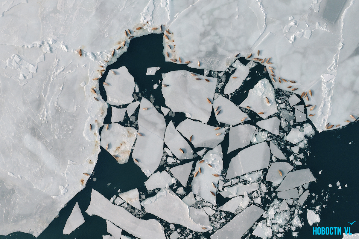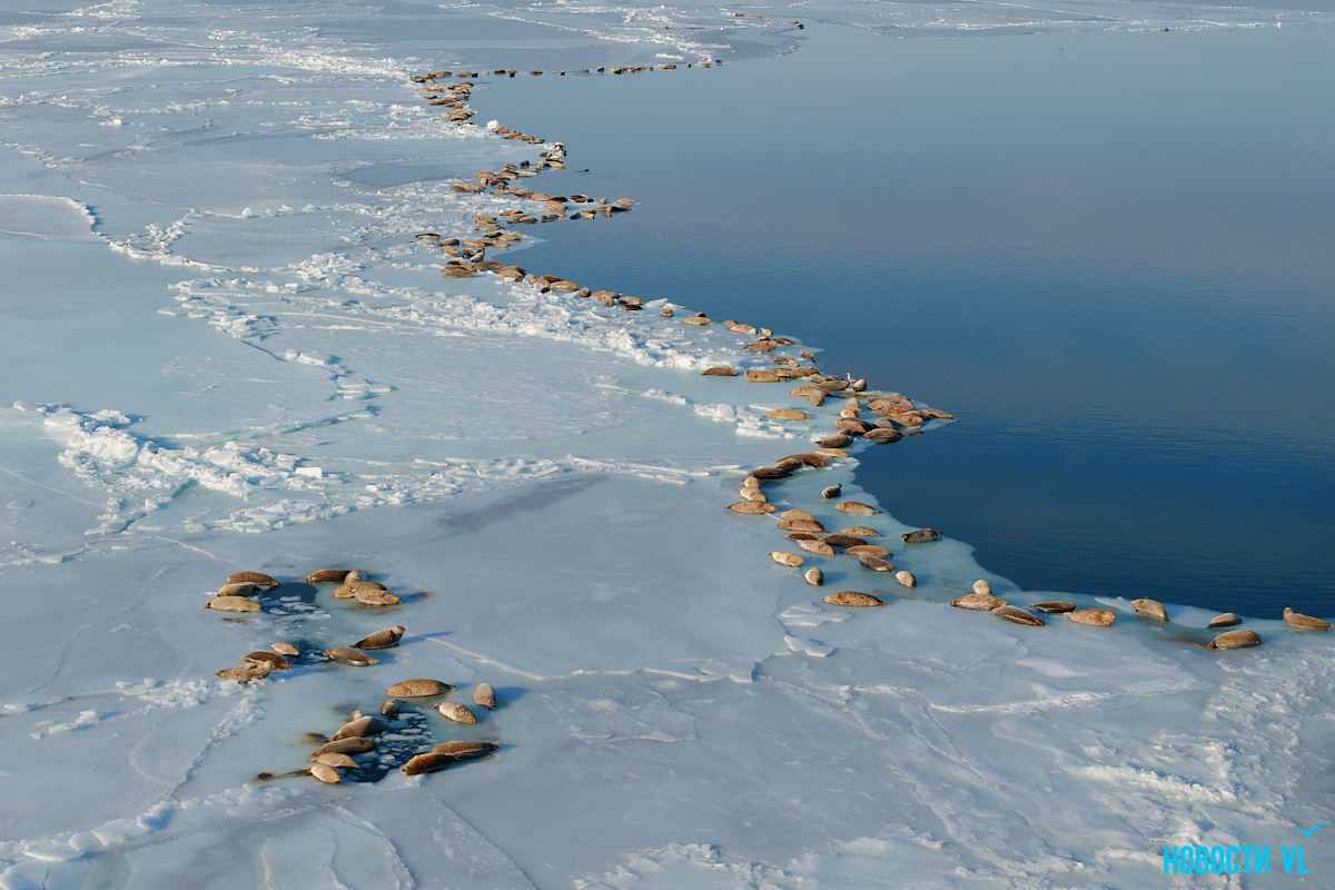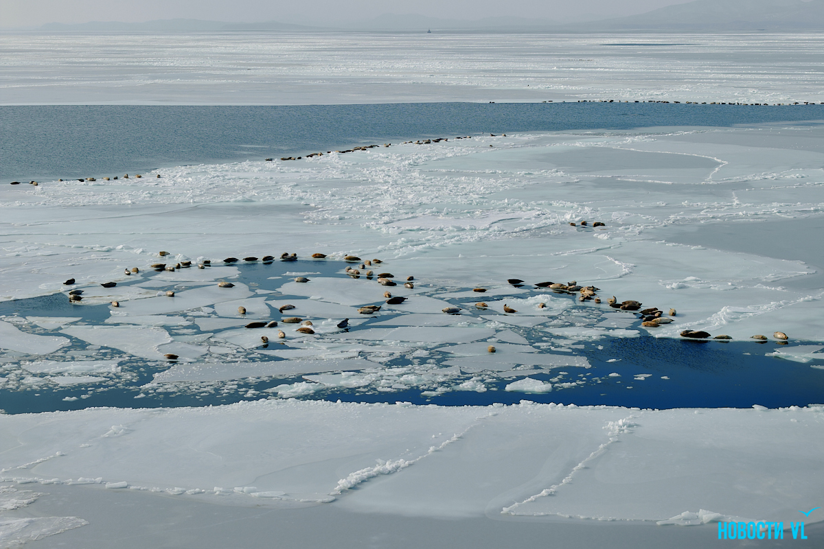 В воскресенье, 4 января, фотограф Новостей VL обнаружил у Токаревского маяка множество отдыхающих на льду ларг. Взрослые нерпы вместе детёнышами расположились на ледовом поле вдоль береговой линии. У каждой ларги здесь своё место – чем выше её авторитет животного, тем ближе она находится к воде. Нерпы скользят по льдинам и вальяжно греются под лучами зимнего солнца.