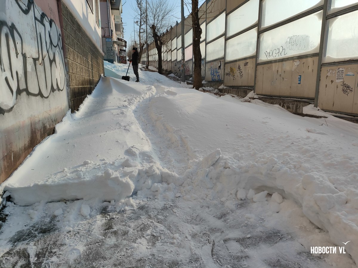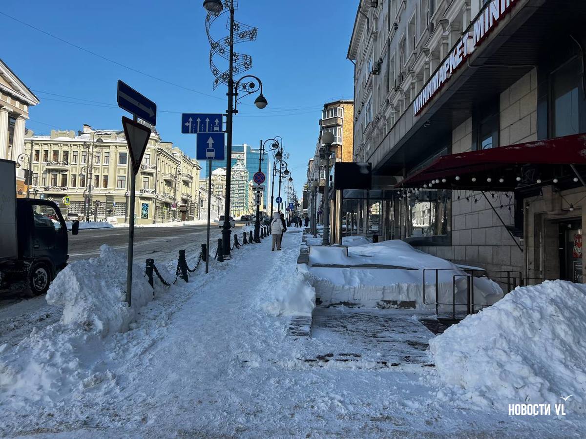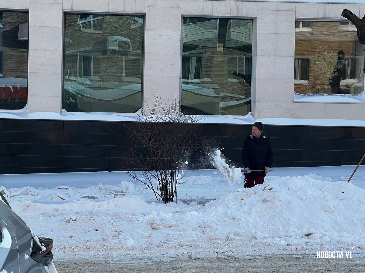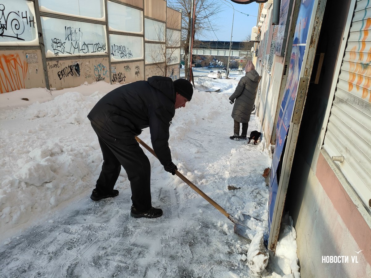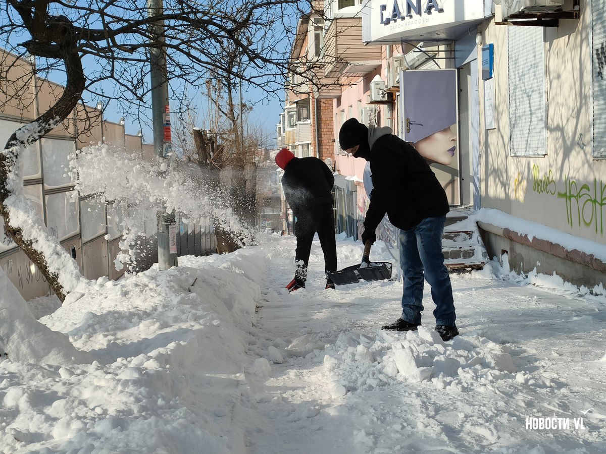 Снежный циклон, который принёс во Владивосток месячную норму осадков со штормовым ветром, отступил ночью 11 января. С утра уже было солнечно и ветер так не завывал. Битву с последствиями снегопада продолжила городская техника, а жители и владельцы заведений вышли им на подмогу.