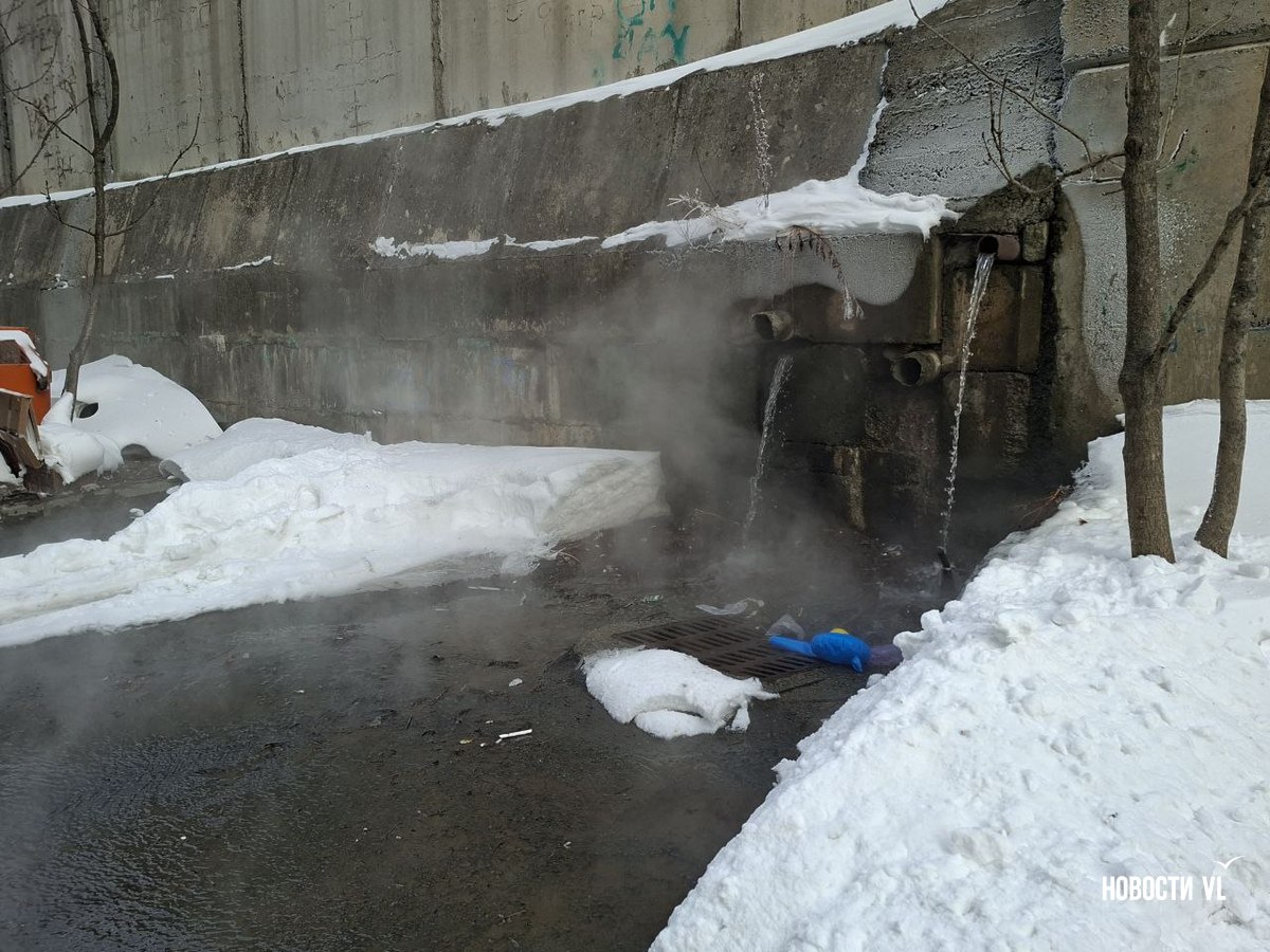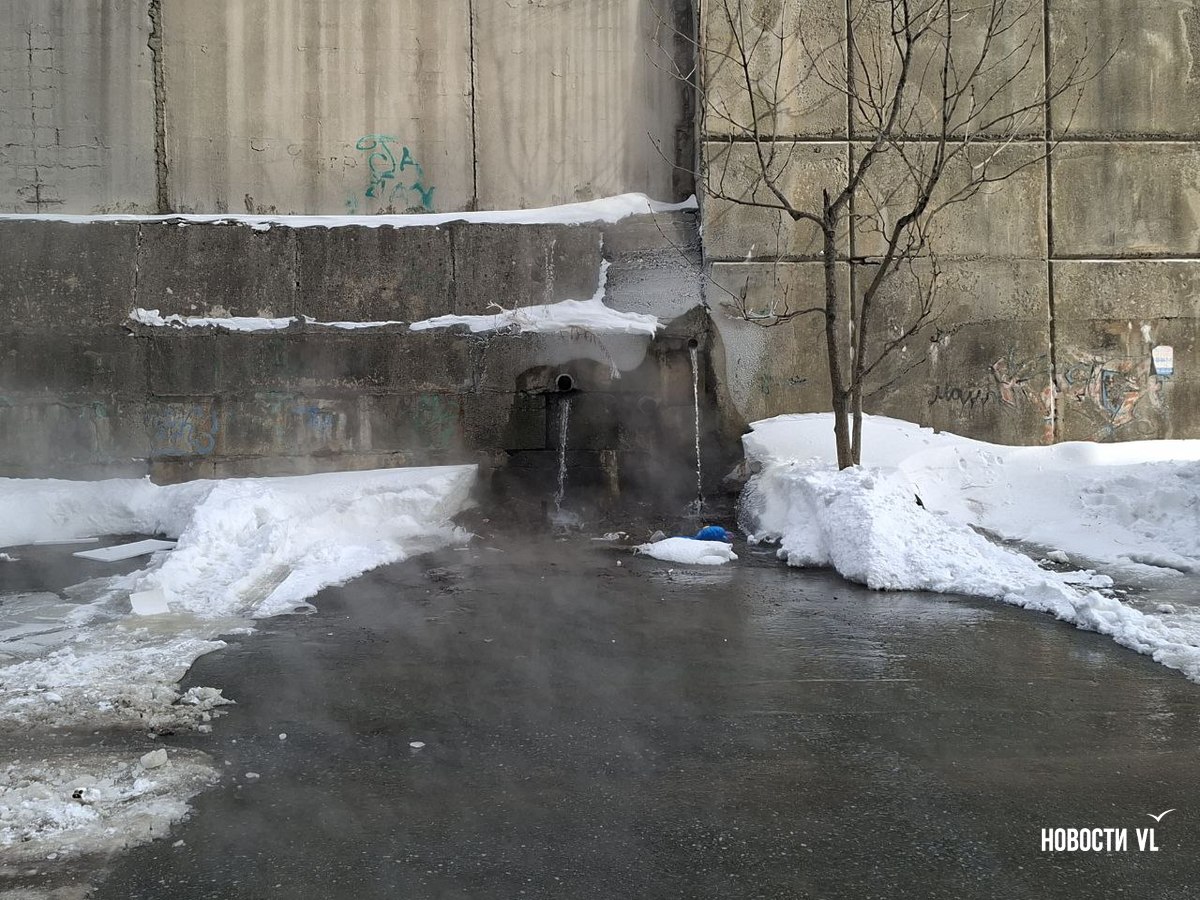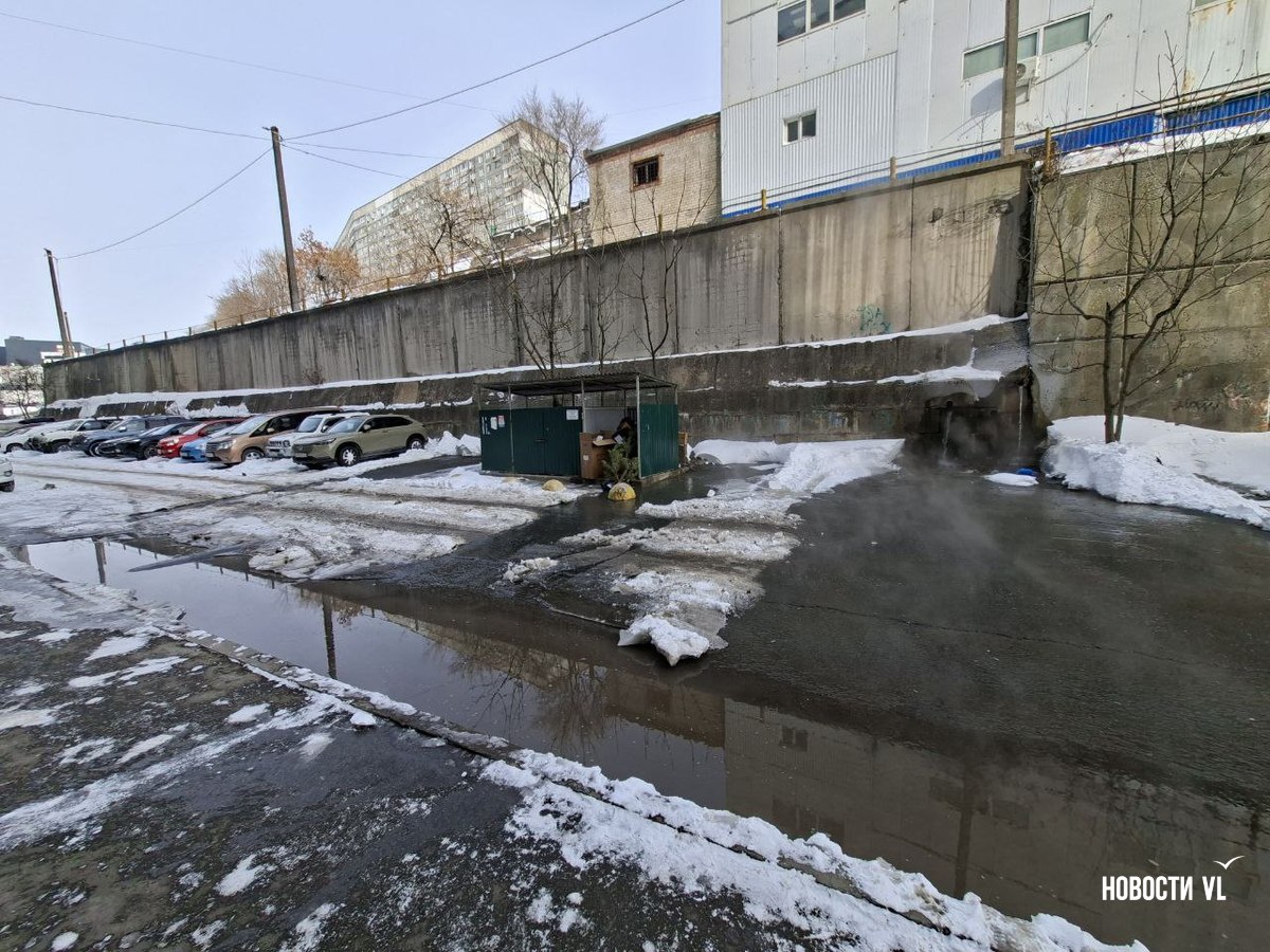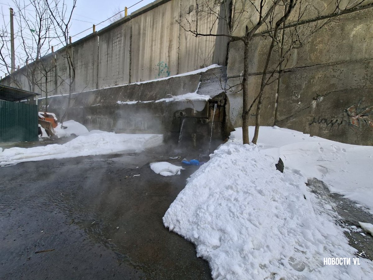 Из подпорной стены дома № 19 по улице Черняховского во Владивостоке с ночи льётся горячая вода. Течёт так, что кипяток заливает двор, поднимая клубы пара и делая его похожим на хаммам. Людям после предыдущего, почти суточного отключения вновь перекрыли тепло и горячую воду. Рядом, у дома № 13, уже у другой подпорной стены, тоже что-то неладно: у верхней её кромки образуются тёмно-жёлтые озёра.
