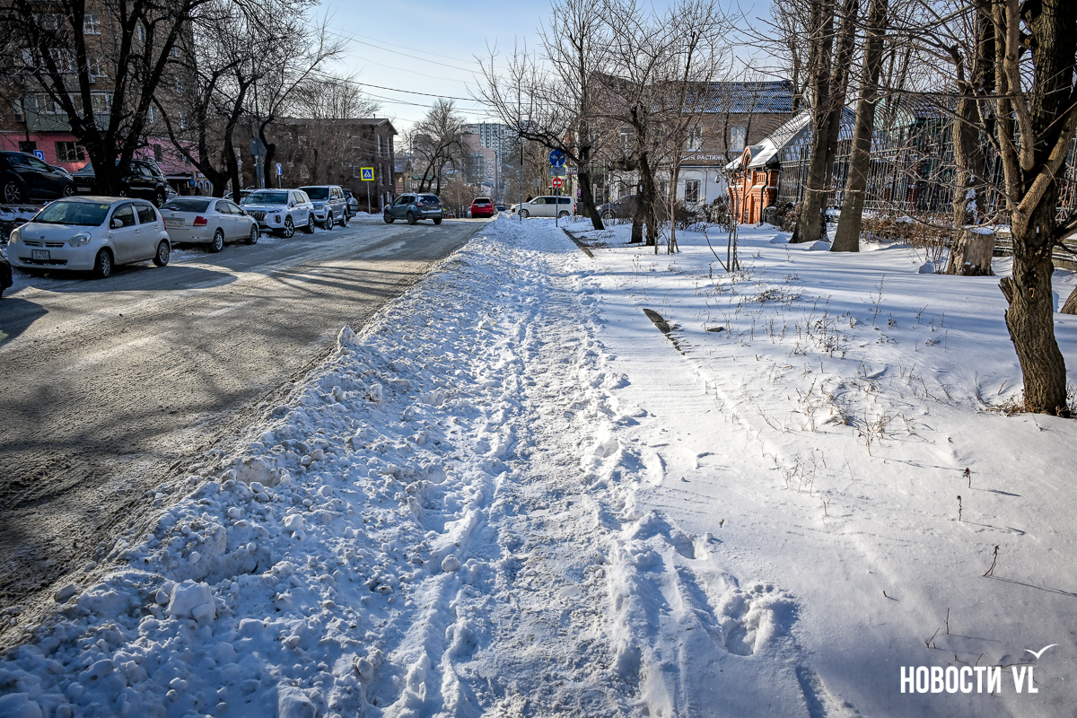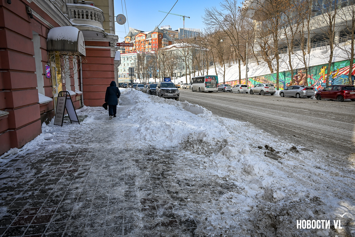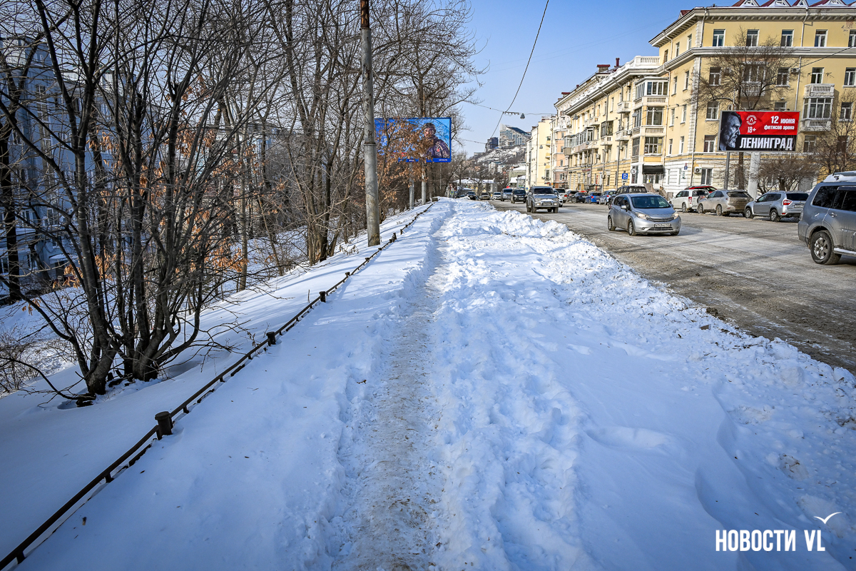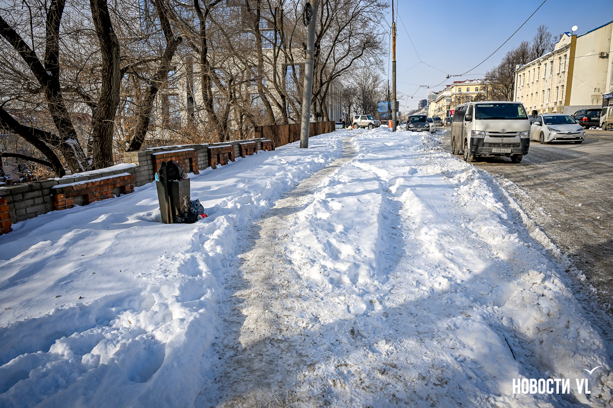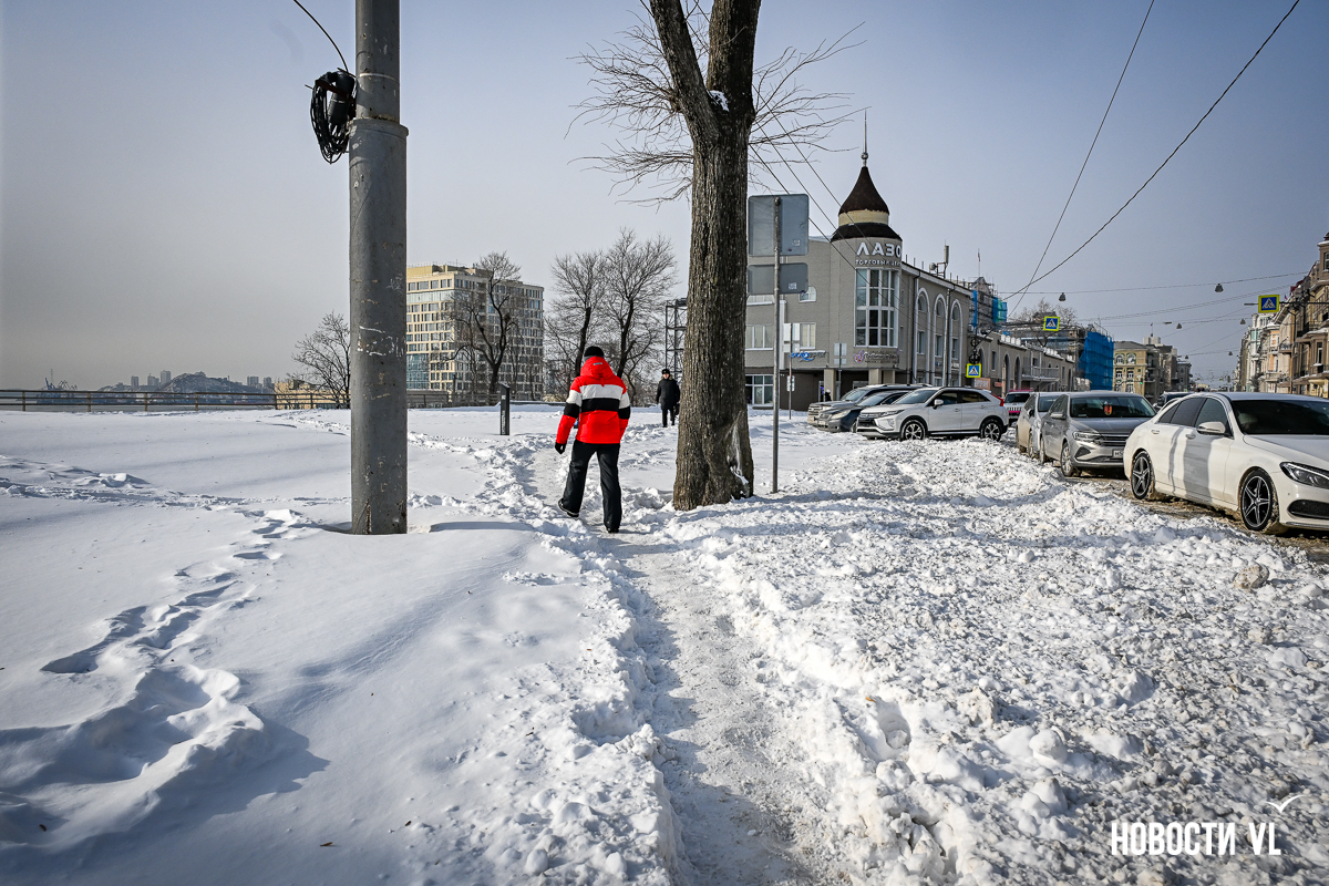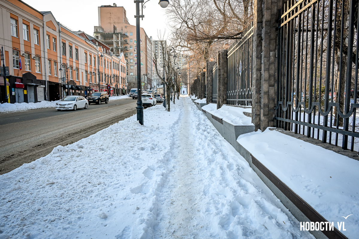 Спустя два дня после сильного снегопада улицы Владивостока всё ещё далеки от нормативного состояния – гололёд и снег есть даже на центральных дорогах. Ещё хуже ситуация на тротуарах – по многолетней традиции, их чистят по остаточному принципу. Есть отдельные оазисы чистого асфальта, но это счастливые исключения. На большей части центральных городских улиц – Алеутской, Пограничной, Адмирала Фокина и Светланской – пешком пройти с комфортом не получится, снег здесь до сих пор не убран. Люди протаптывают «козьи тропы», лавируя между сугробами на обочинах.
