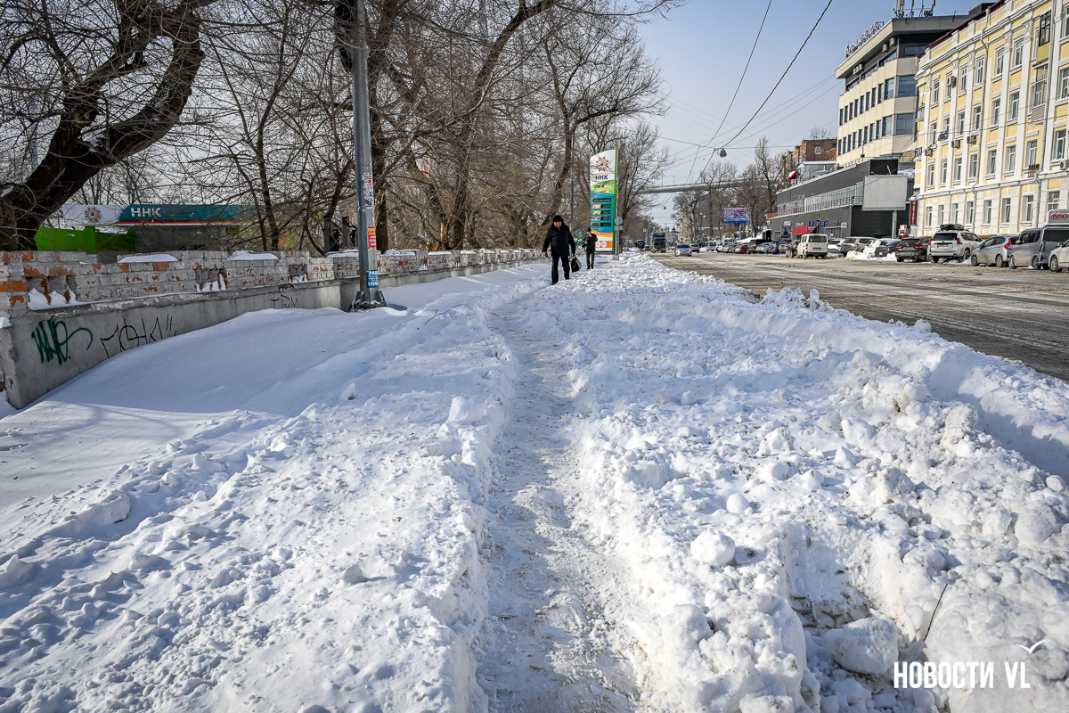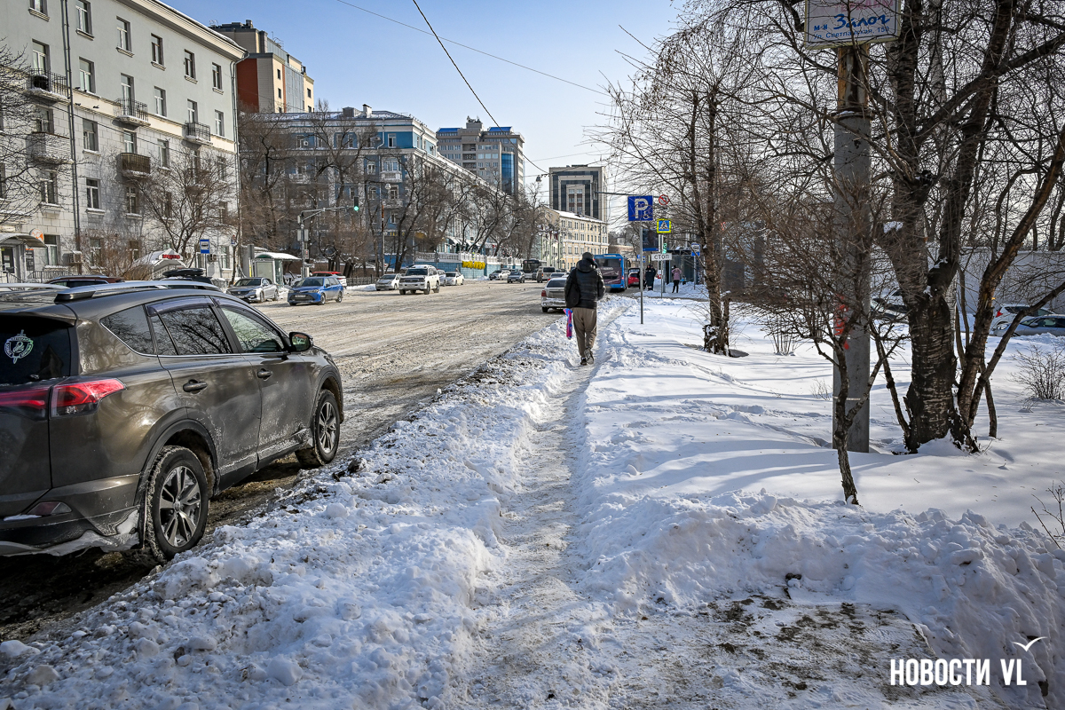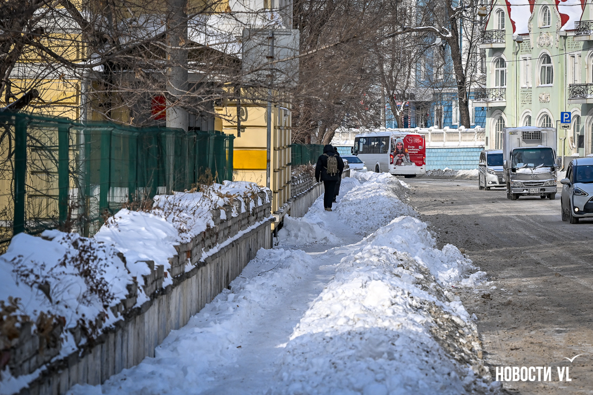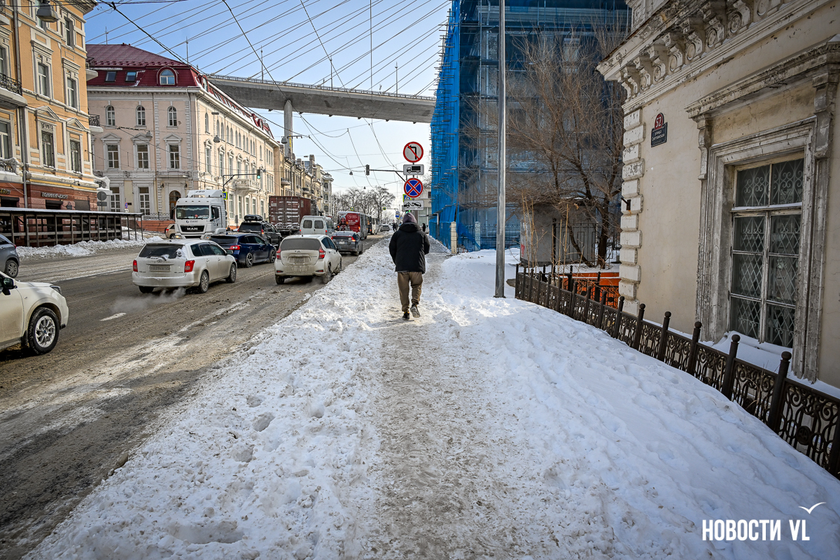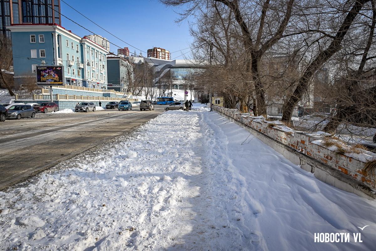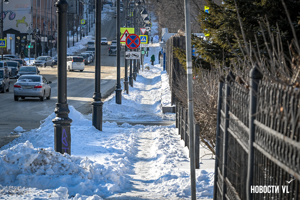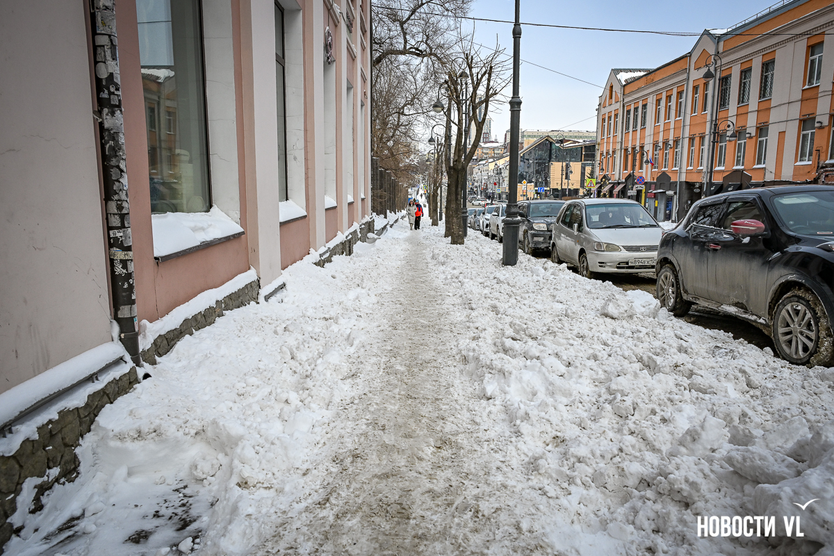 Спустя два дня после сильного снегопада улицы Владивостока всё ещё далеки от нормативного состояния – гололёд и снег есть даже на центральных дорогах. Ещё хуже ситуация на тротуарах – по многолетней традиции, их чистят по остаточному принципу. Есть отдельные оазисы чистого асфальта, но это счастливые исключения. На большей части центральных городских улиц – Алеутской, Пограничной, Адмирала Фокина и Светланской – пешком пройти с комфортом не получится, снег здесь до сих пор не убран. Люди протаптывают «козьи тропы», лавируя между сугробами на обочинах.