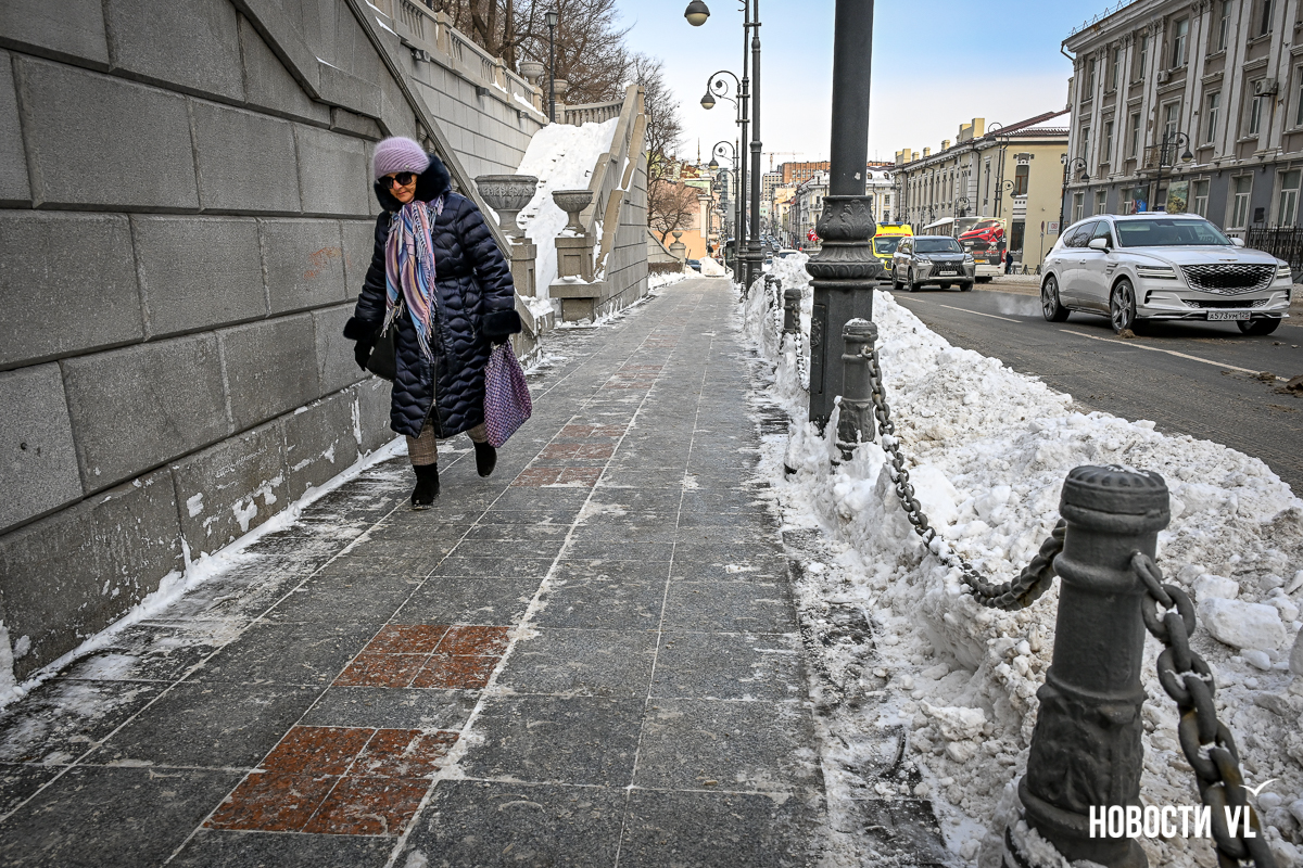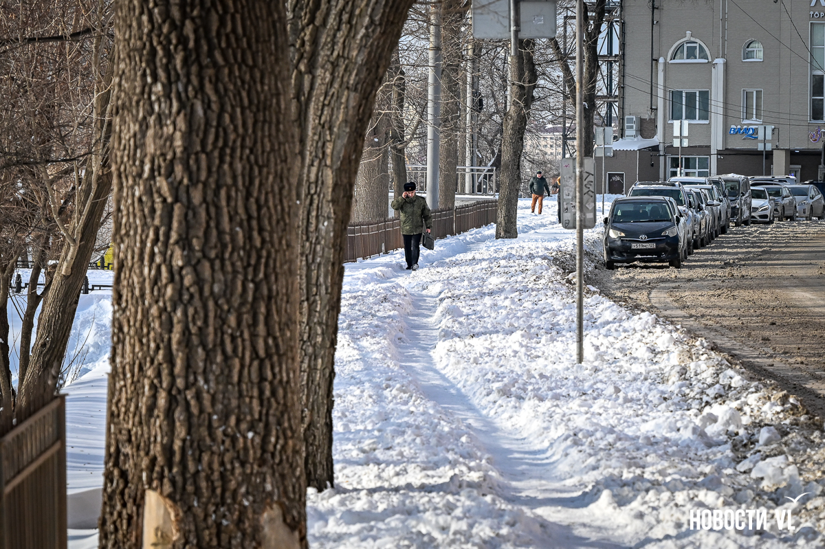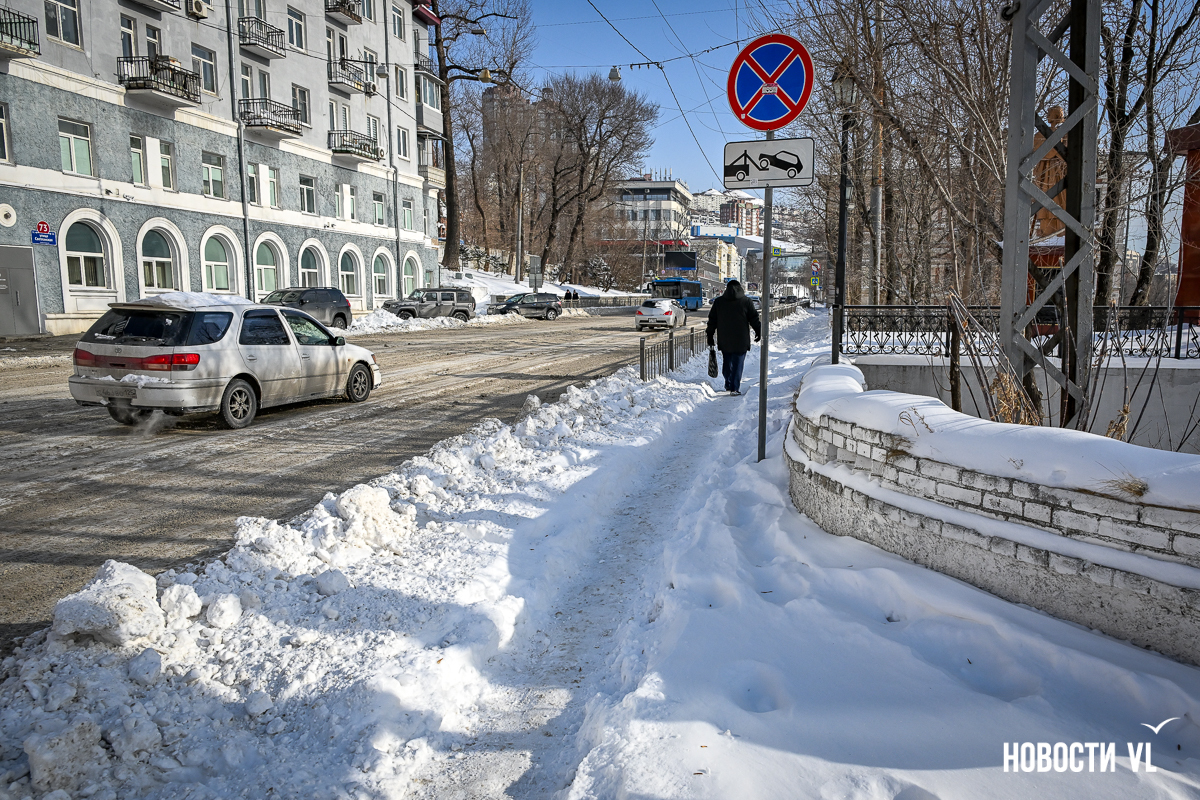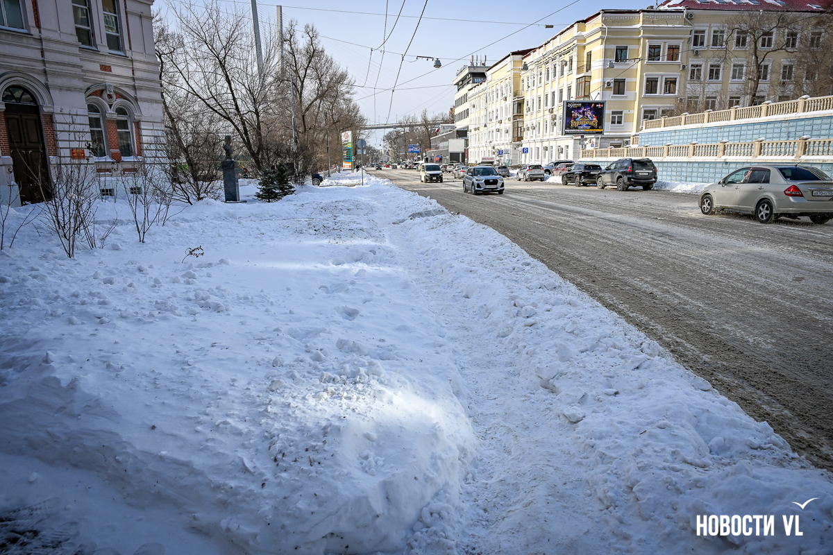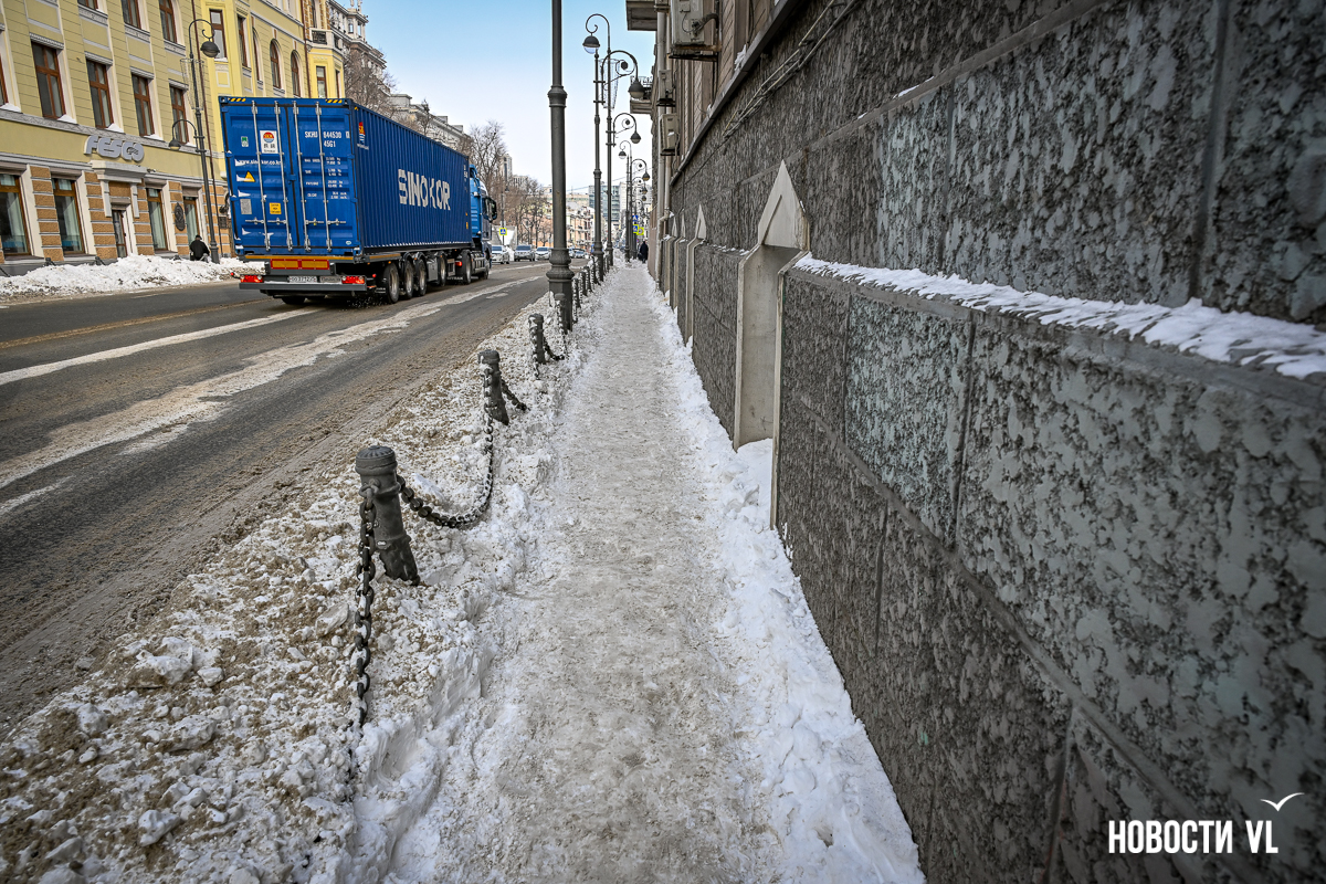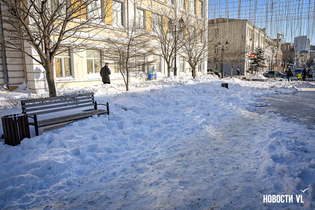 Спустя два дня после сильного снегопада улицы Владивостока всё ещё далеки от нормативного состояния – гололёд и снег есть даже на центральных дорогах. Ещё хуже ситуация на тротуарах – по многолетней традиции, их чистят по остаточному принципу. Есть отдельные оазисы чистого асфальта, но это счастливые исключения. На большей части центральных городских улиц – Алеутской, Пограничной, Адмирала Фокина и Светланской – пешком пройти с комфортом не получится, снег здесь до сих пор не убран. Люди протаптывают «козьи тропы», лавируя между сугробами на обочинах.