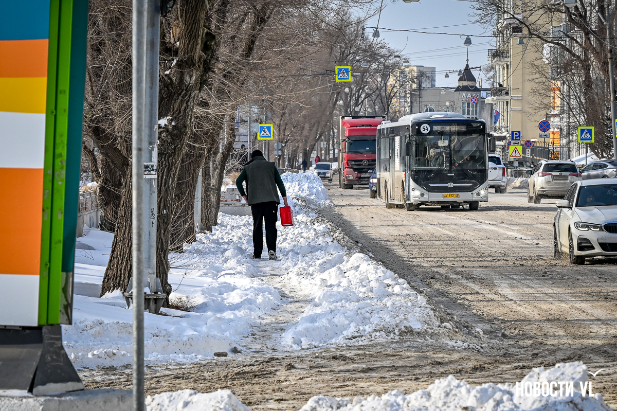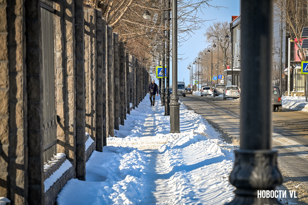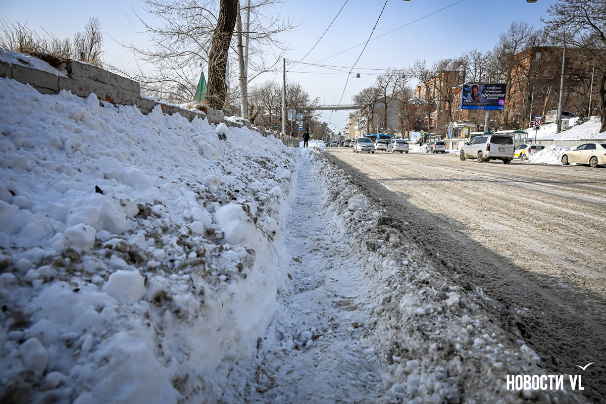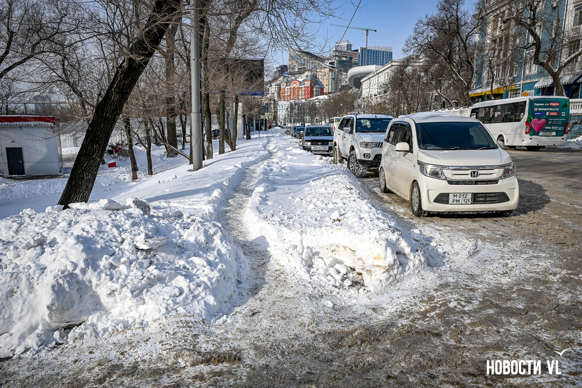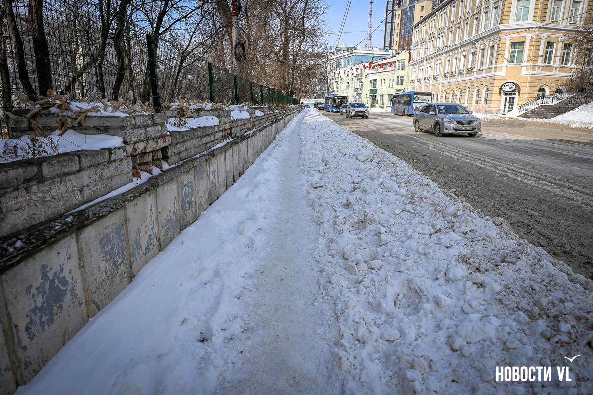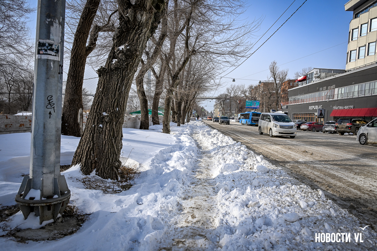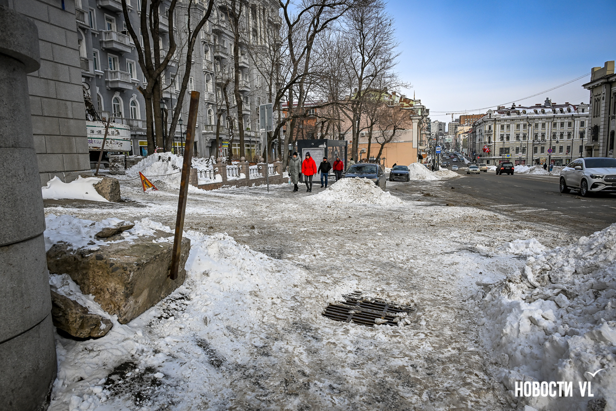 Спустя два дня после сильного снегопада улицы Владивостока всё ещё далеки от нормативного состояния – гололёд и снег есть даже на центральных дорогах. Ещё хуже ситуация на тротуарах – по многолетней традиции, их чистят по остаточному принципу. Есть отдельные оазисы чистого асфальта, но это счастливые исключения. На большей части центральных городских улиц – Алеутской, Пограничной, Адмирала Фокина и Светланской – пешком пройти с комфортом не получится, снег здесь до сих пор не убран. Люди протаптывают «козьи тропы», лавируя между сугробами на обочинах.