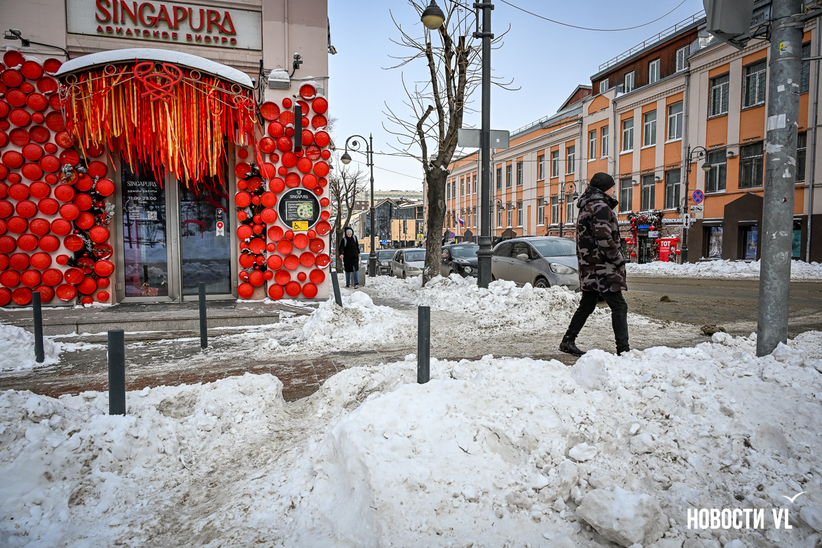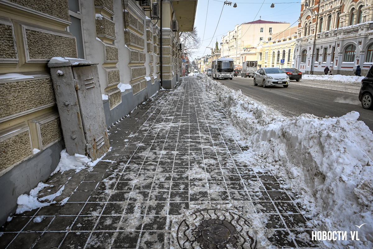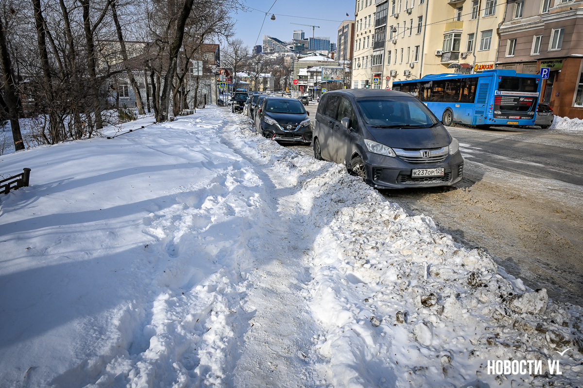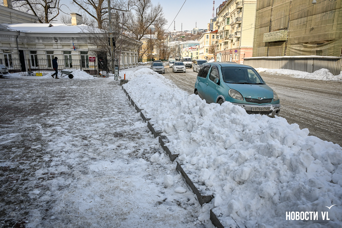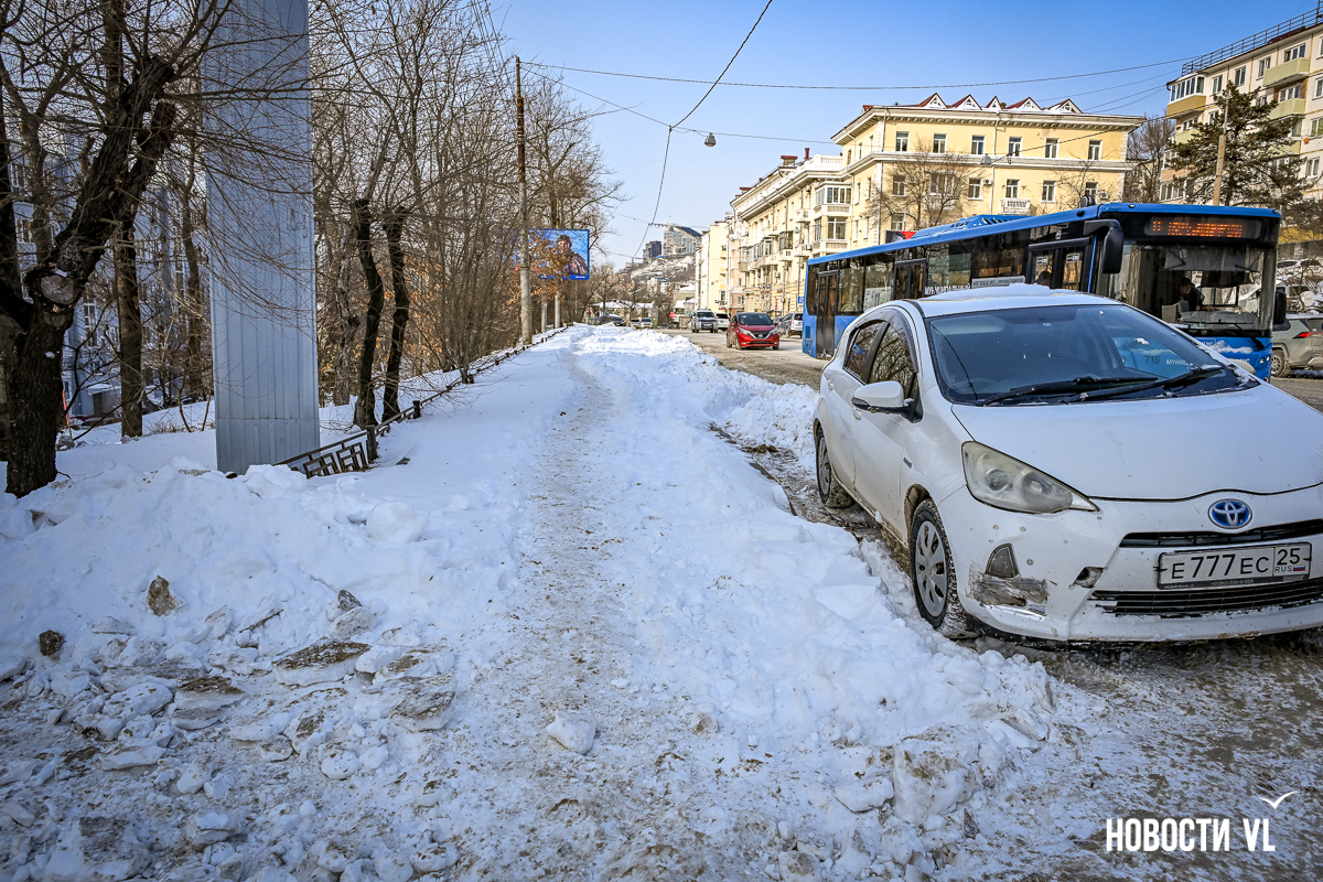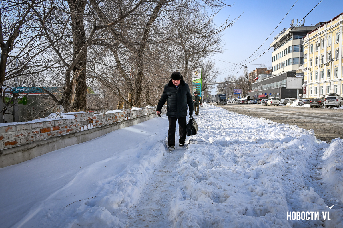 Спустя два дня после сильного снегопада улицы Владивостока всё ещё далеки от нормативного состояния – гололёд и снег есть даже на центральных дорогах. Ещё хуже ситуация на тротуарах – по многолетней традиции, их чистят по остаточному принципу. Есть отдельные оазисы чистого асфальта, но это счастливые исключения. На большей части центральных городских улиц – Алеутской, Пограничной, Адмирала Фокина и Светланской – пешком пройти с комфортом не получится, снег здесь до сих пор не убран. Люди протаптывают «козьи тропы», лавируя между сугробами на обочинах.
