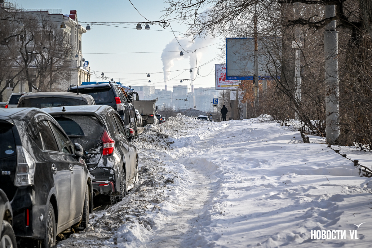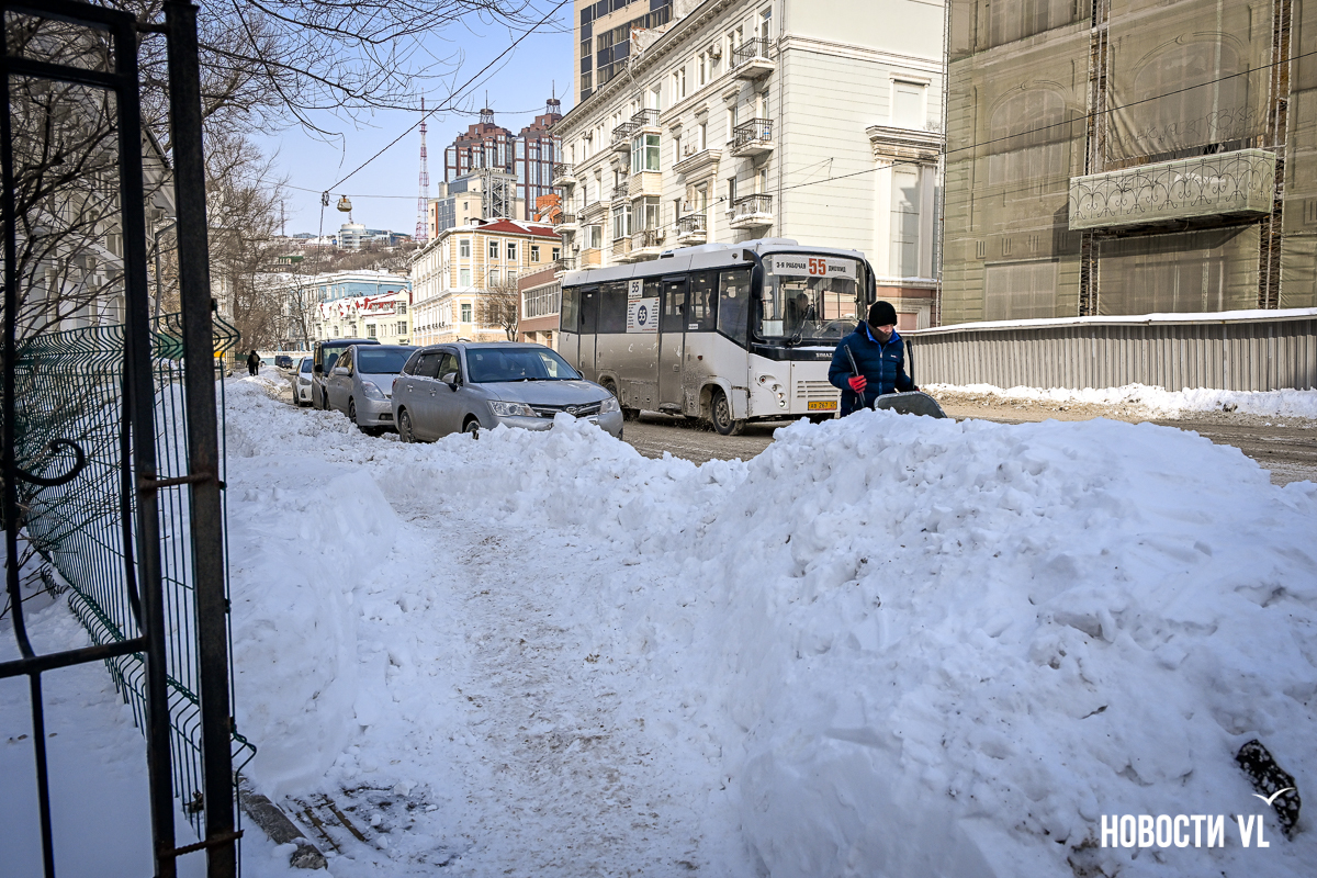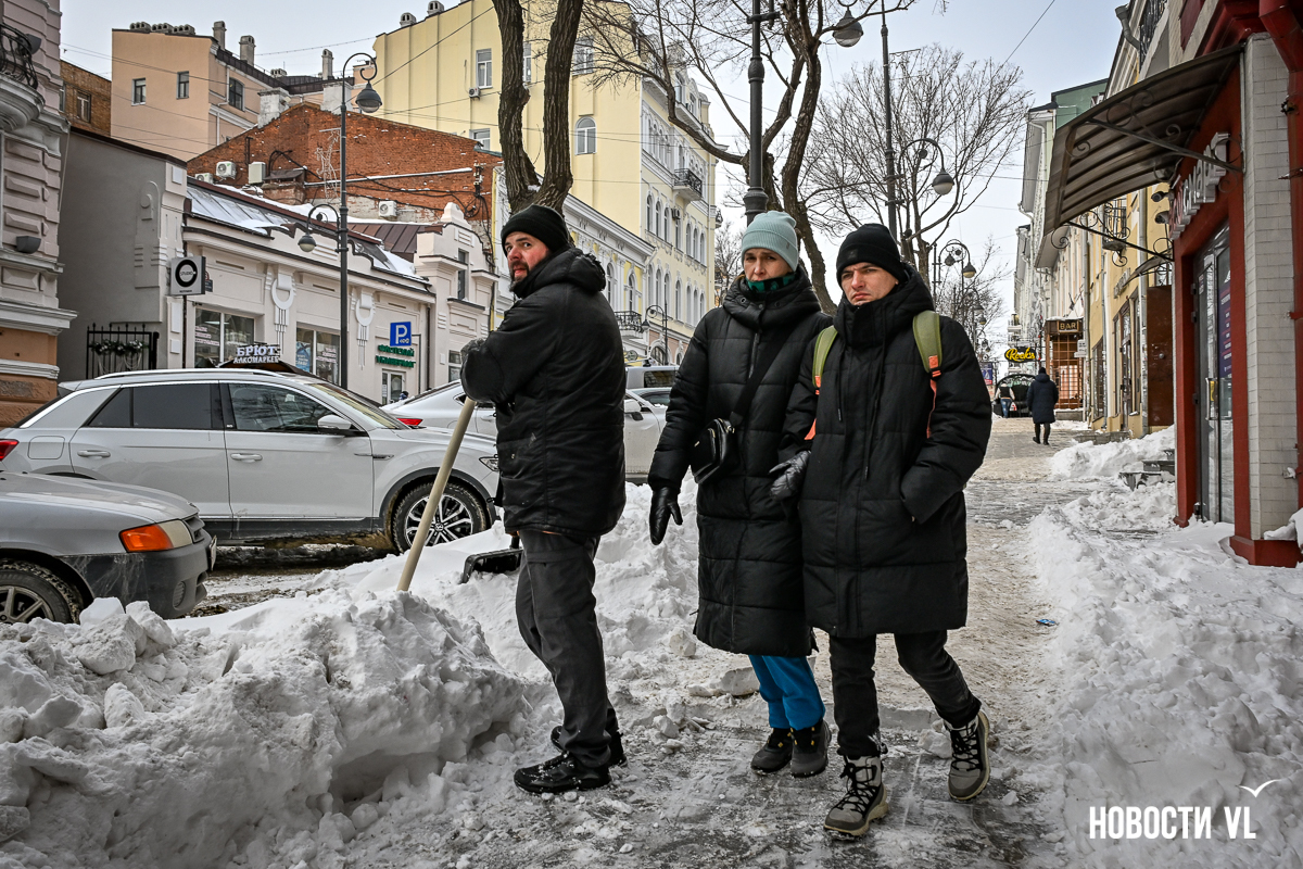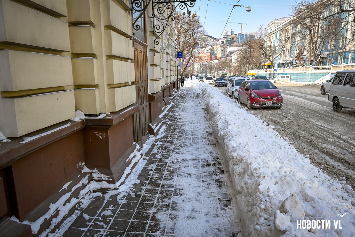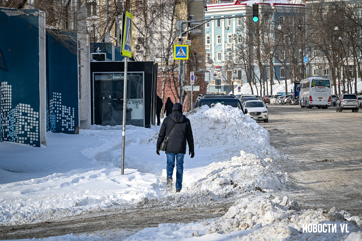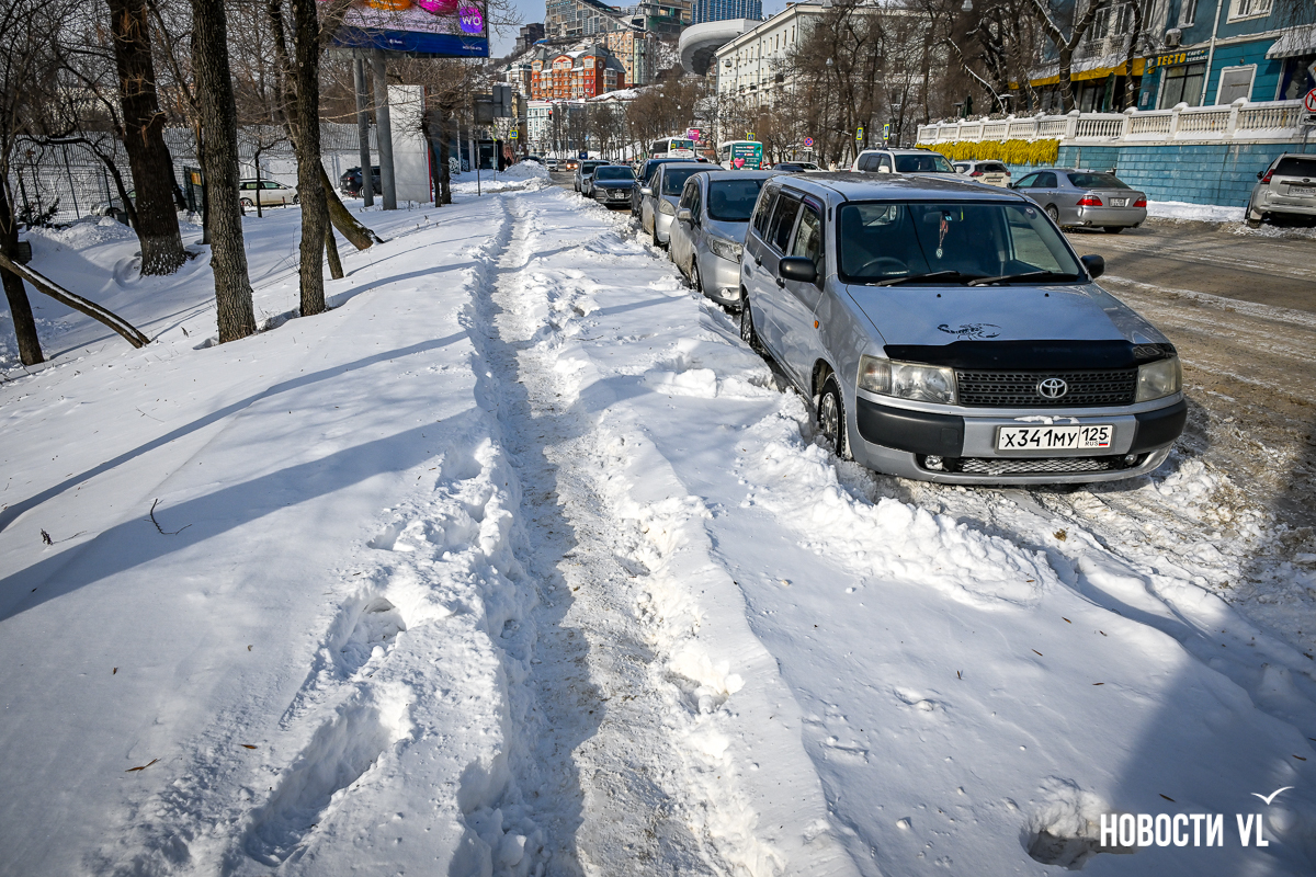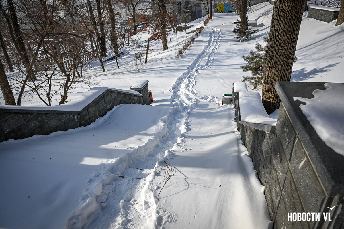 Спустя два дня после сильного снегопада улицы Владивостока всё ещё далеки от нормативного состояния – гололёд и снег есть даже на центральных дорогах. Ещё хуже ситуация на тротуарах – по многолетней традиции, их чистят по остаточному принципу. Есть отдельные оазисы чистого асфальта, но это счастливые исключения. На большей части центральных городских улиц – Алеутской, Пограничной, Адмирала Фокина и Светланской – пешком пройти с комфортом не получится, снег здесь до сих пор не убран. Люди протаптывают «козьи тропы», лавируя между сугробами на обочинах.