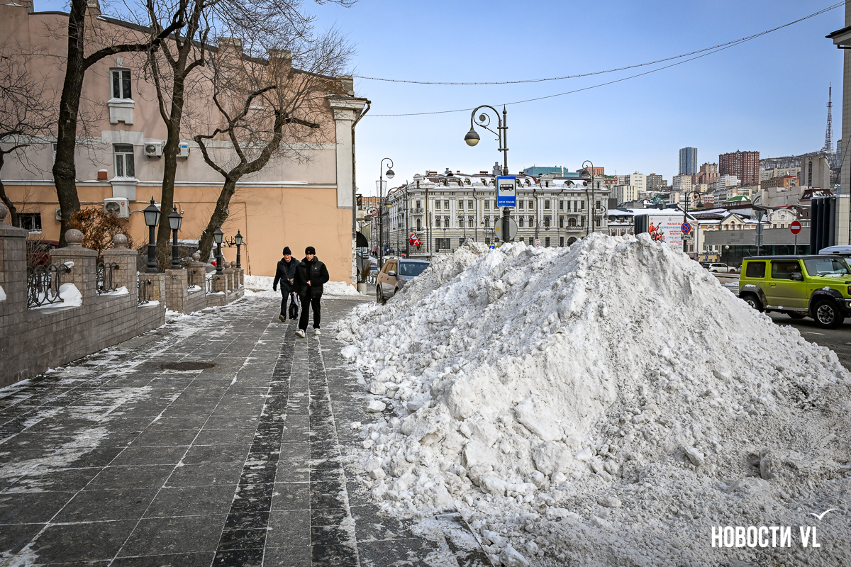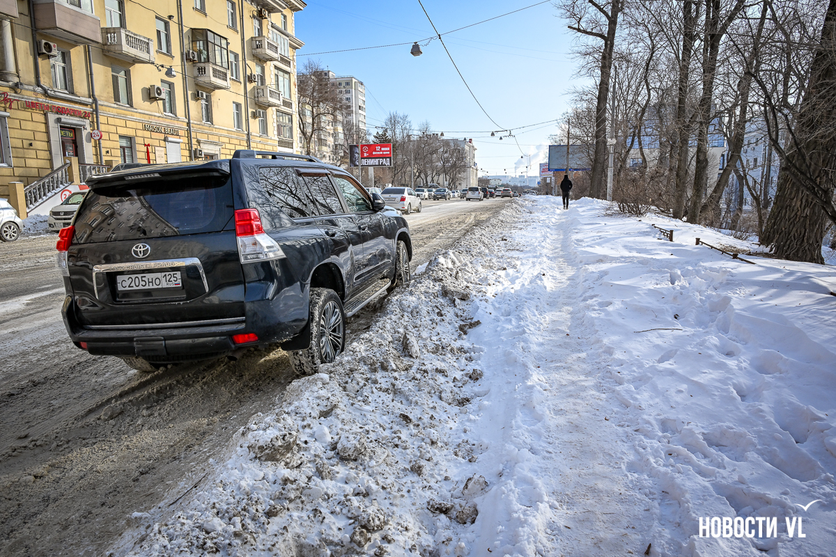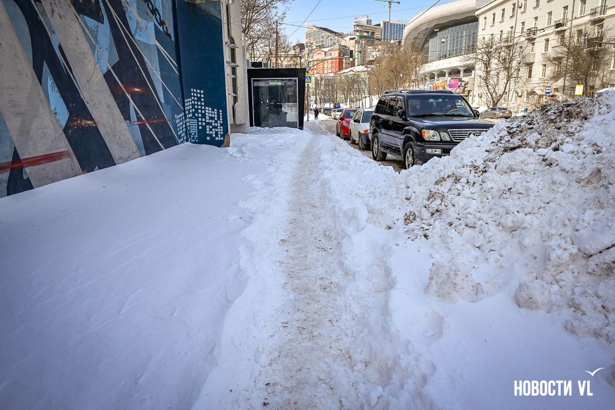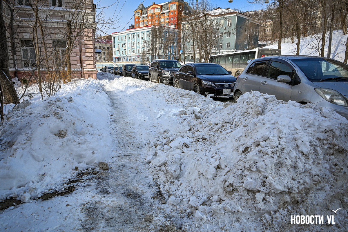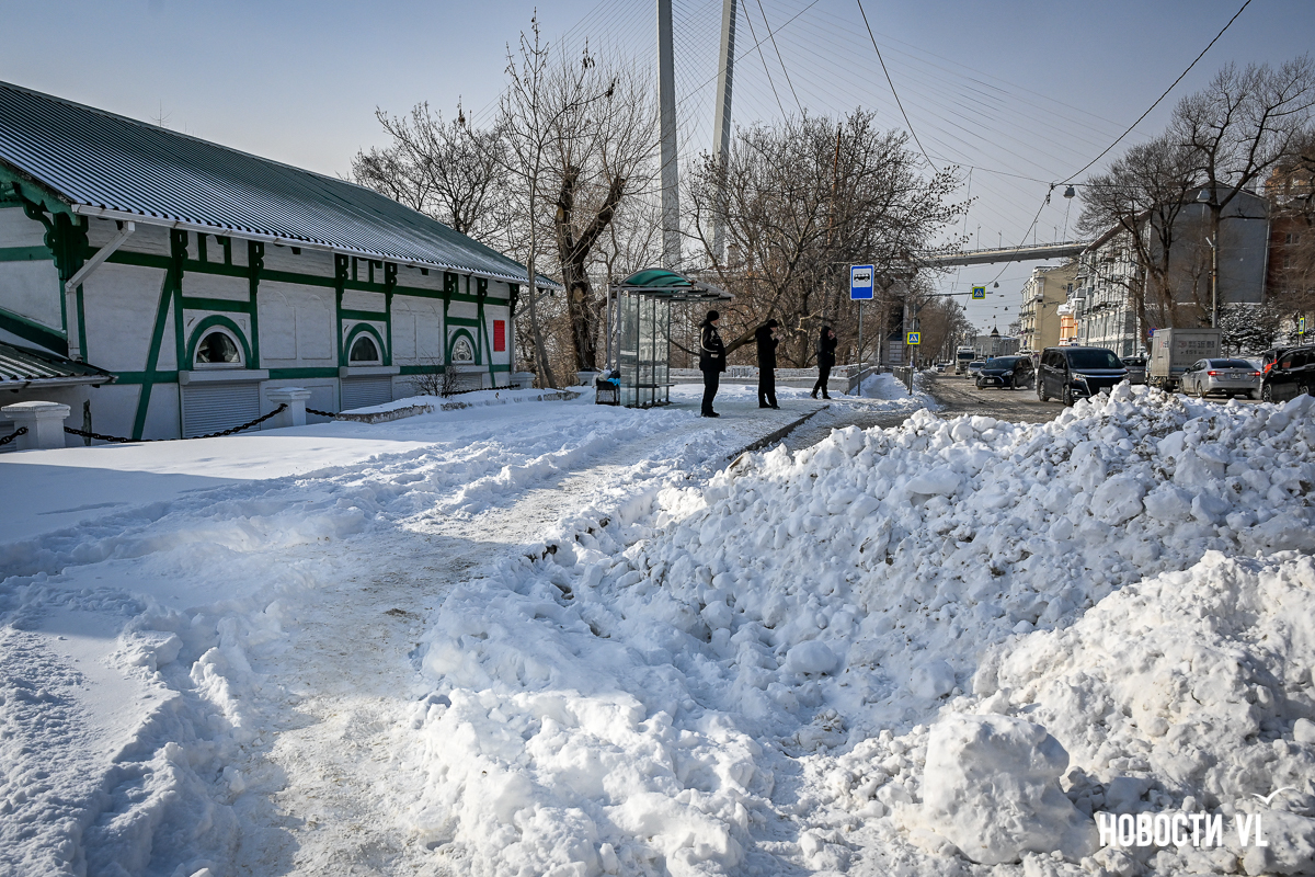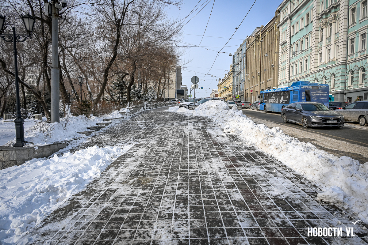 Спустя два дня после сильного снегопада улицы Владивостока всё ещё далеки от нормативного состояния – гололёд и снег есть даже на центральных дорогах. Ещё хуже ситуация на тротуарах – по многолетней традиции, их чистят по остаточному принципу. Есть отдельные оазисы чистого асфальта, но это счастливые исключения. На большей части центральных городских улиц – Алеутской, Пограничной, Адмирала Фокина и Светланской – пешком пройти с комфортом не получится, снег здесь до сих пор не убран. Люди протаптывают «козьи тропы», лавируя между сугробами на обочинах.