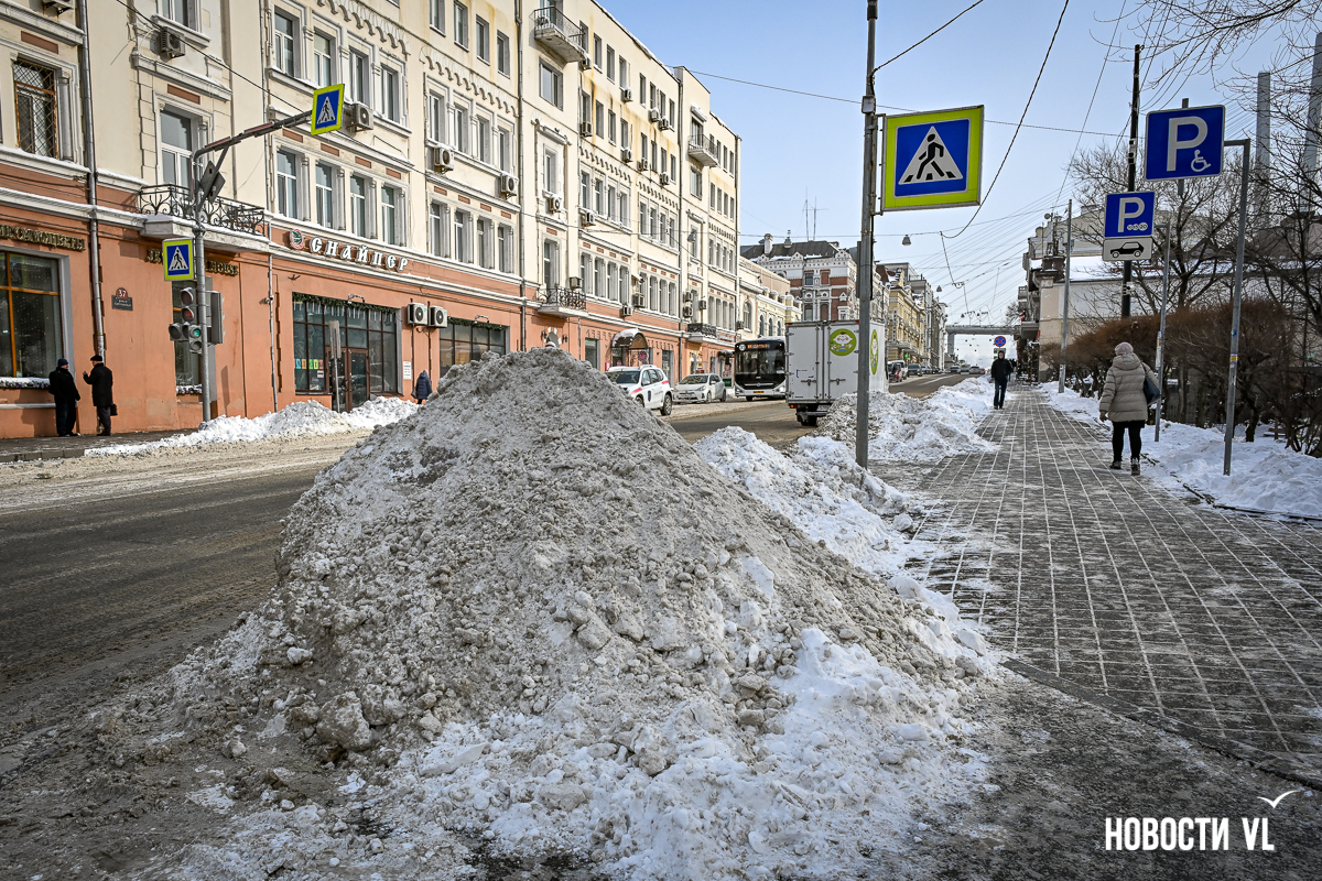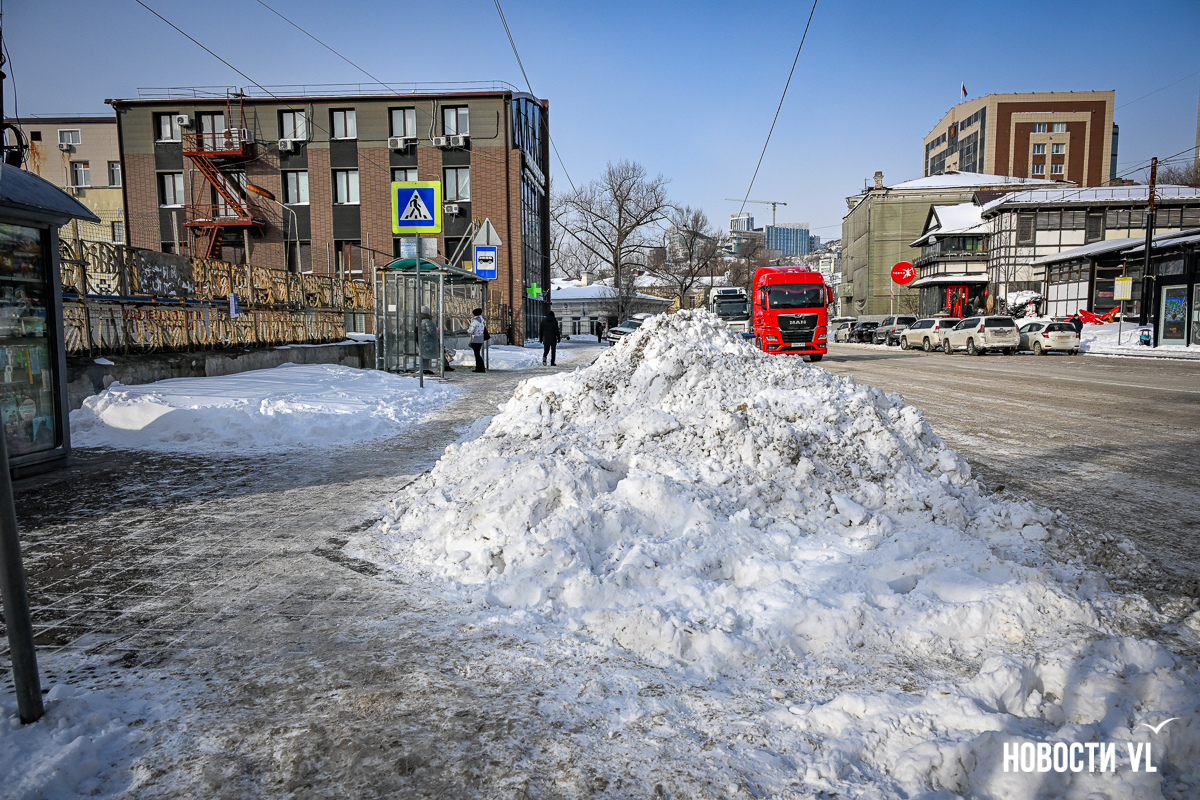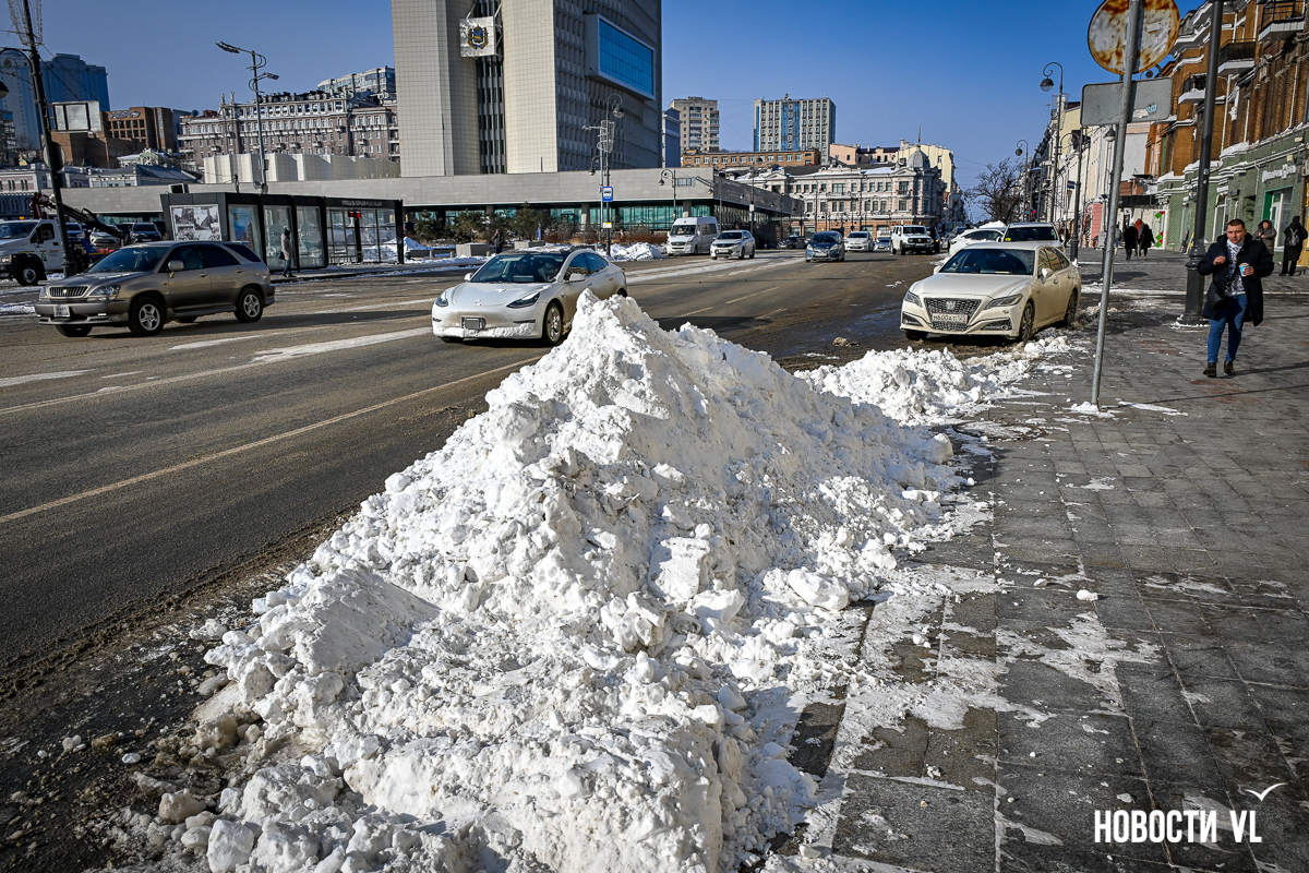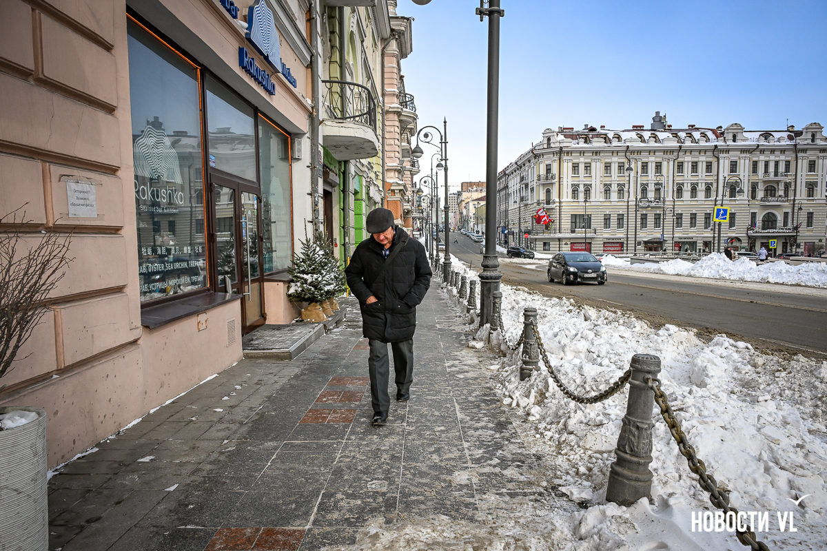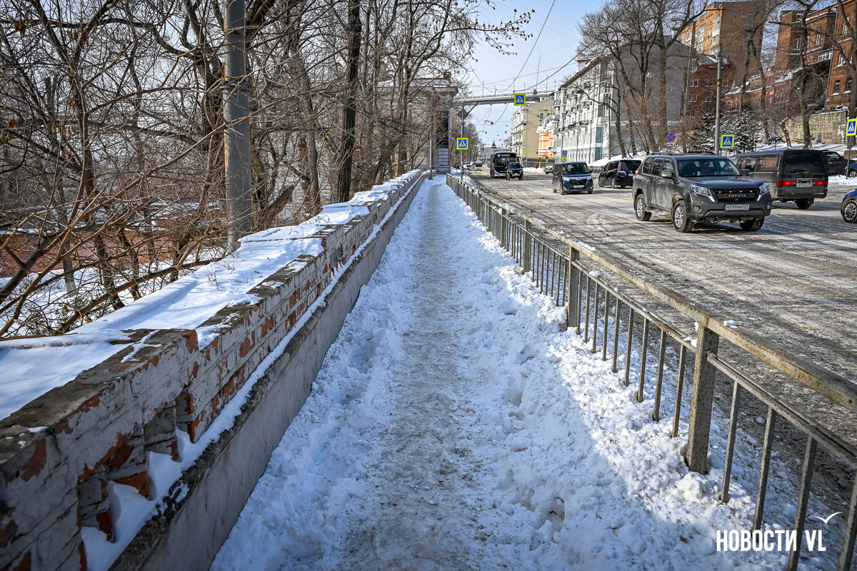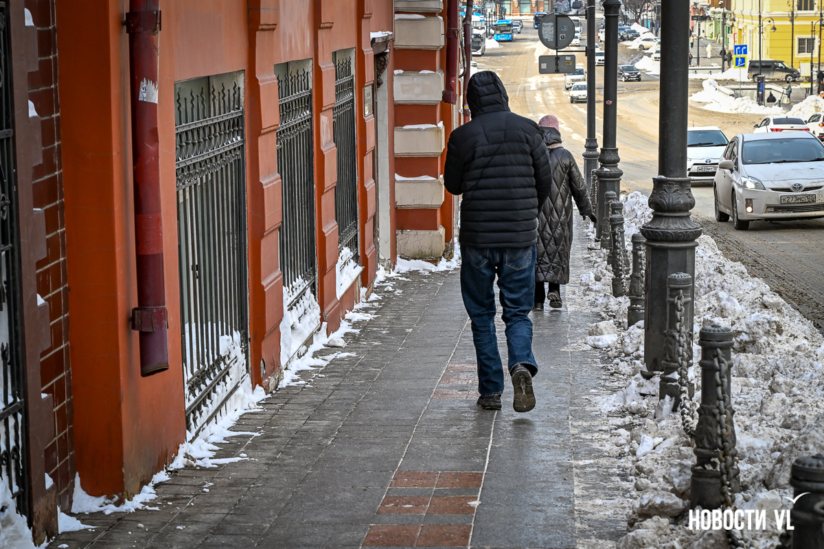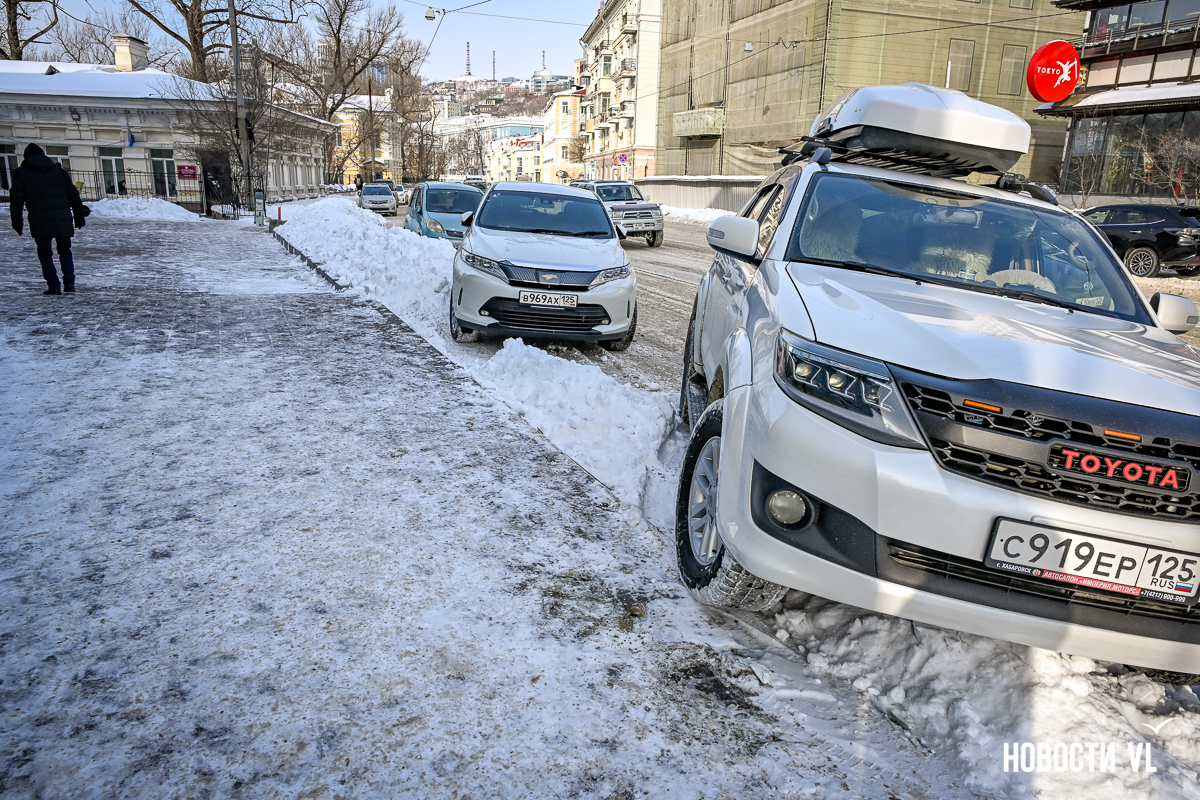 Спустя два дня после сильного снегопада улицы Владивостока всё ещё далеки от нормативного состояния – гололёд и снег есть даже на центральных дорогах. Ещё хуже ситуация на тротуарах – по многолетней традиции, их чистят по остаточному принципу. Есть отдельные оазисы чистого асфальта, но это счастливые исключения. На большей части центральных городских улиц – Алеутской, Пограничной, Адмирала Фокина и Светланской – пешком пройти с комфортом не получится, снег здесь до сих пор не убран. Люди протаптывают «козьи тропы», лавируя между сугробами на обочинах.