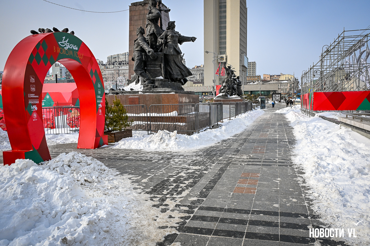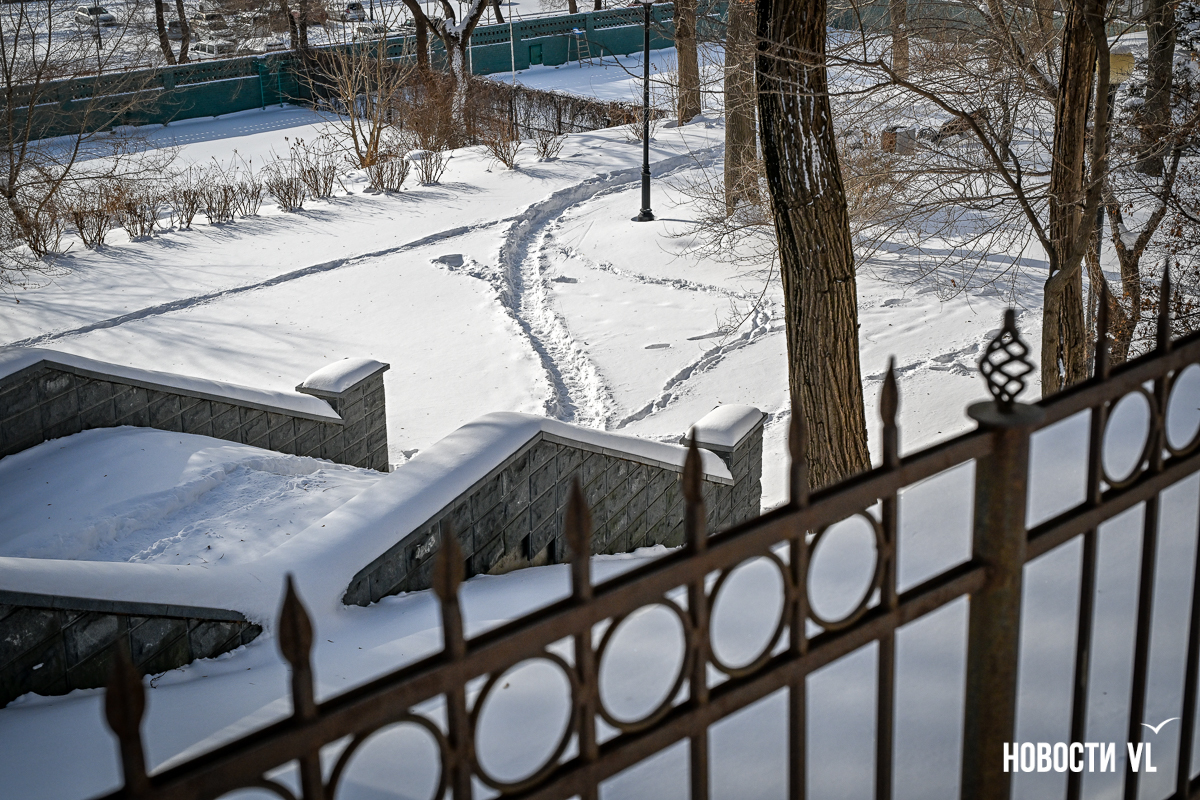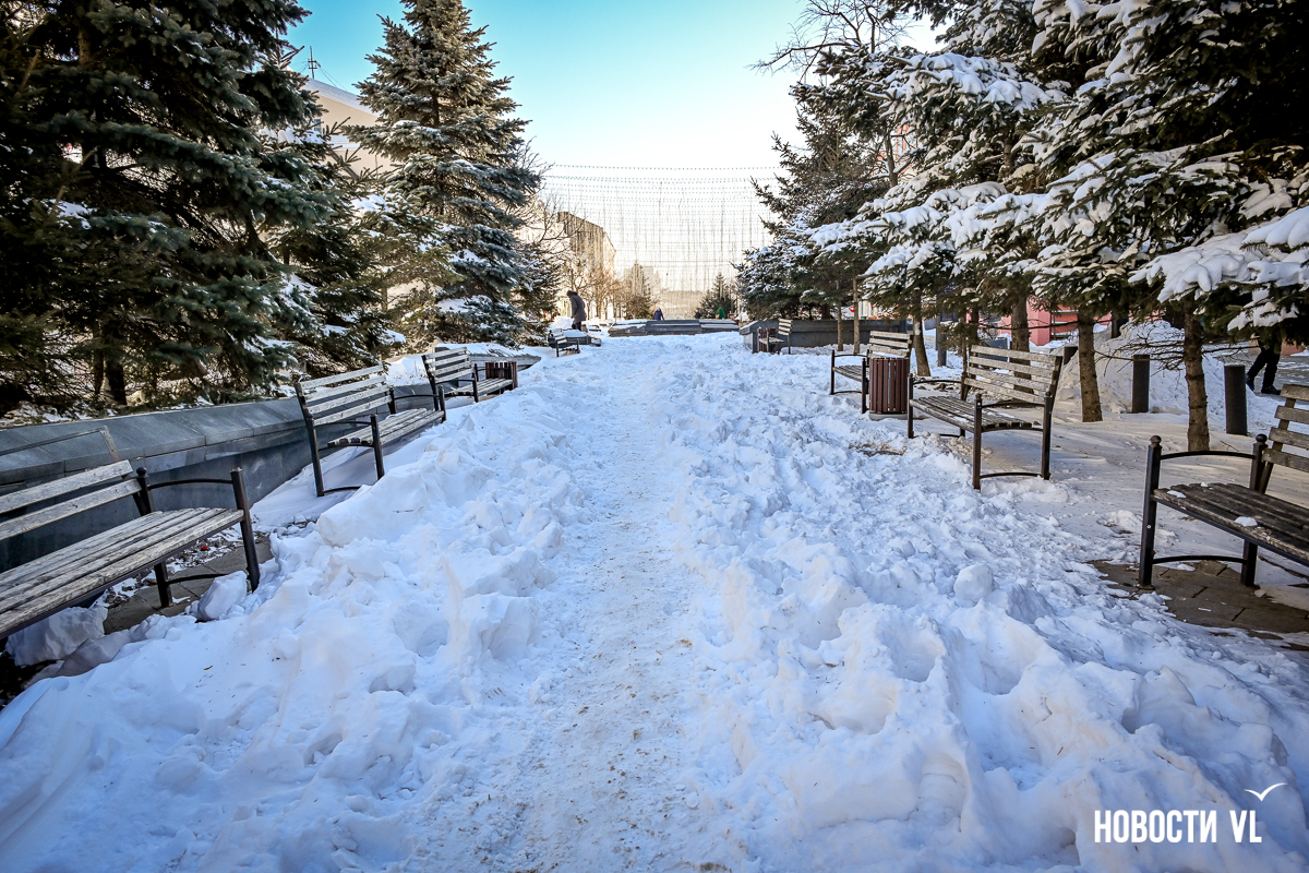 Конечно, было бы глупо ждать, что будут убраны Театральный сквер и сквер Невельского – ну вот они и не убраны. Более того, в последнем случае полностью в снегу даже основной тротуар, идущий выше сквера (напротив погрануправления ФСБ, на Светланской, 67).