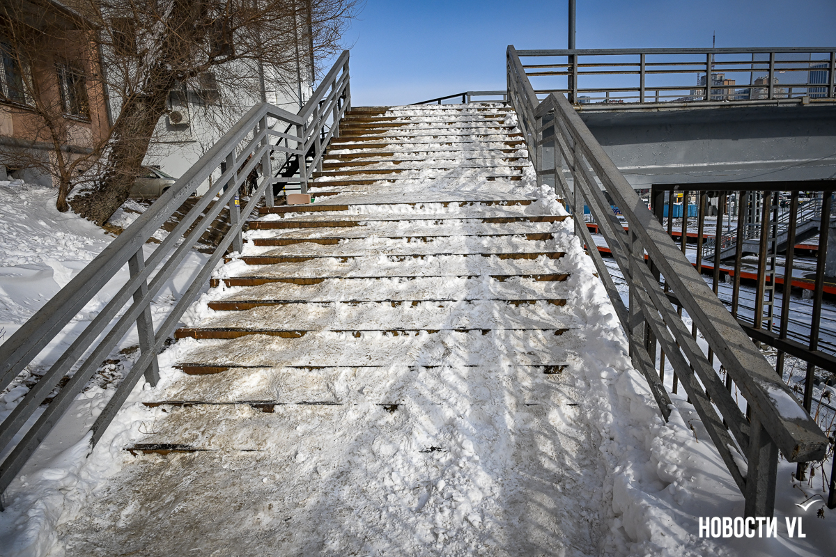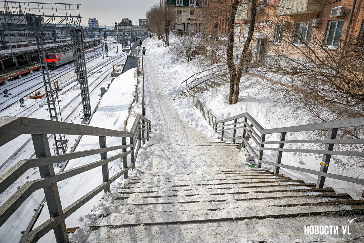 Зато в снегу проход к вокзалу от парковки возле правительства Приморского края (Светланская, 22). Не убран снег ни с лестницы виадука, ни с тротуара. Аналогичная картина на Алеутской – от вокзала до Светланской. Ужасно неудобно пешеходам возле вокзала и касс аэроэкспресса. Такой вот логистический хаб. Не рекомендуем также спускаться по небольшой улице Береговой – это проход к собору через дорогу от ГУМа, и сейчас он опасен для здоровья.