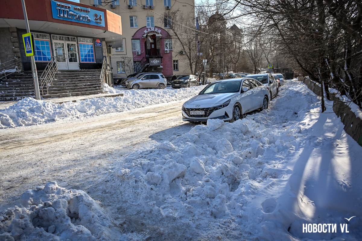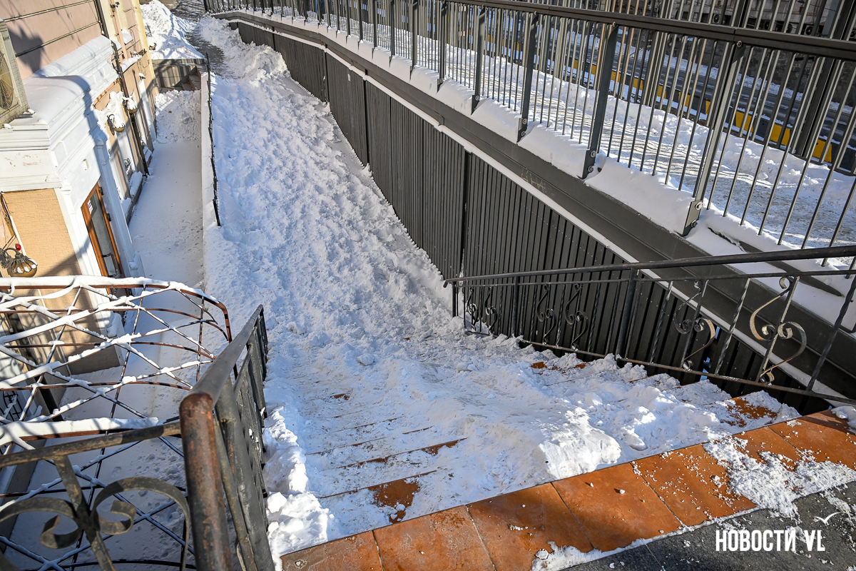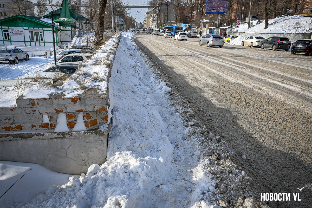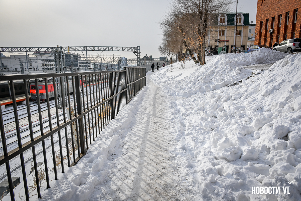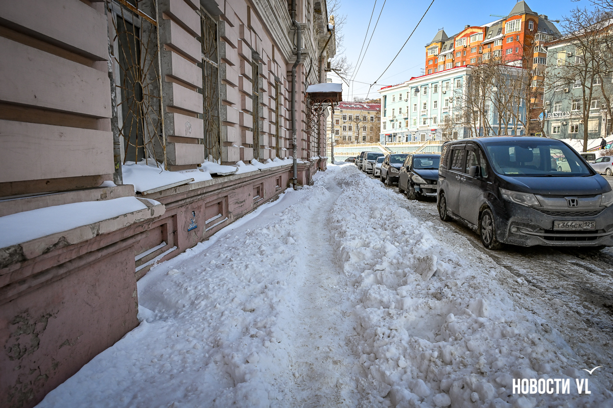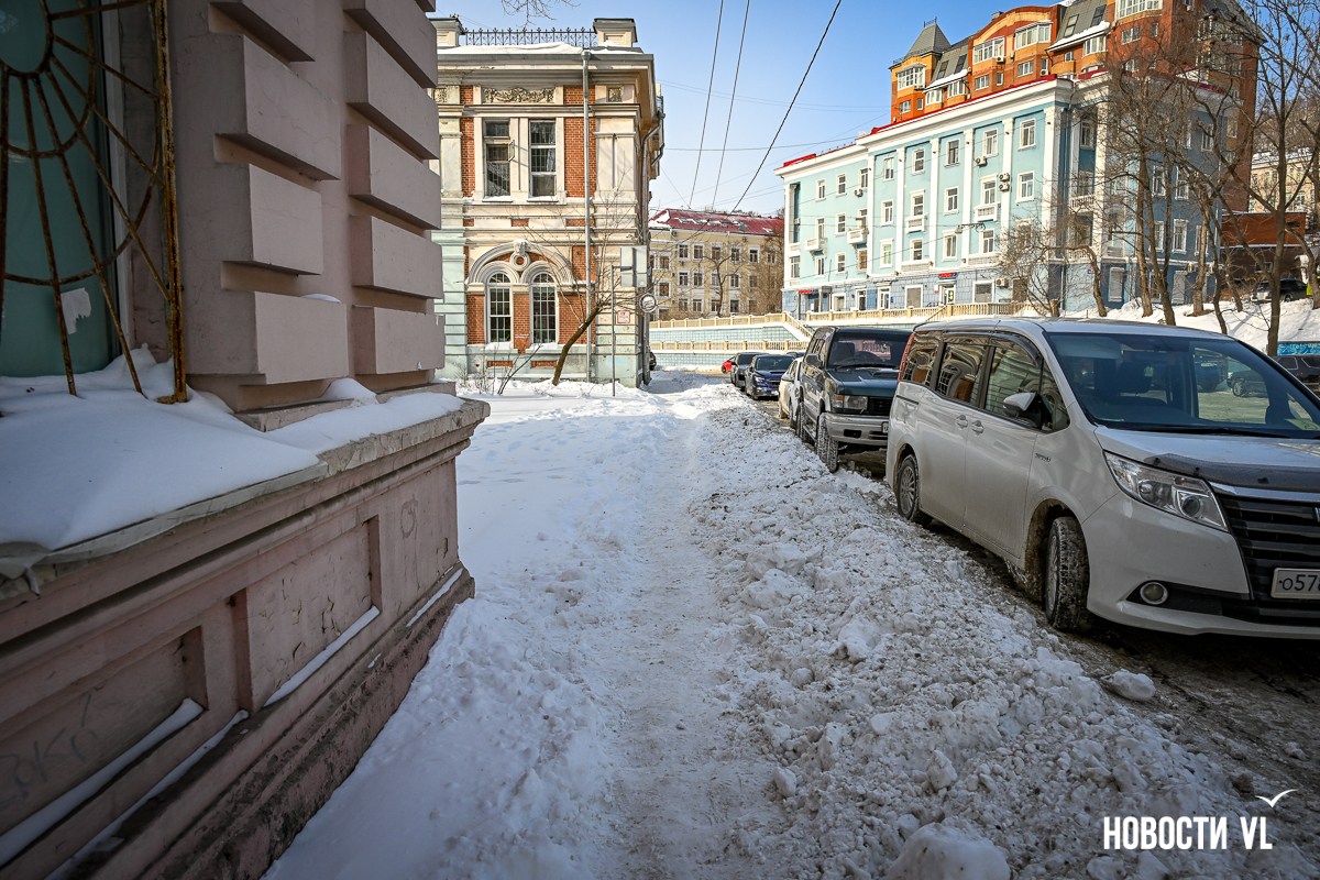 Фотограф Новостей VL прошёл пешком большую часть центра города. Пожалуй, хуже всего снег убран на Пограничной. Вместо тротуаров здесь – узенькие утоптанные тропки, даже возле корейского консульства (Пологая, 19) и прохода к востребованному железнодорожному переходу напротив ГАИ. Собственно, возле этого здания даже дорога толком не убрана, что уж говорить о тротуарах. Поэтому люди тут ходят по дороге, благо трафик здесь небольшой. Редкие исключения, немного скрашивающие вид, – небольшие участки возле входов в кафе, их предприниматели убирают самостоятельно.