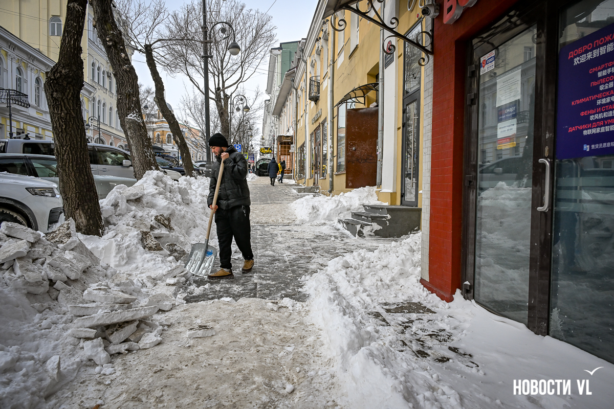 Проблема чётной части Светланской (которая ближе к морю) – в том, что здесь заметно меньше зданий, чем с нечётной, нагорной стороны улицы. А следовательно, меньше и собственников, которые могли бы помочь с уборкой. А раз так, то это муниципальная земля, но на её уборку у города явно не хватает сил и средств. Днём 12 января на Светланской наш фотограф не встретил ни одного городского дворника, с утра работников СГТ мы видели только на Океанском проспекте.